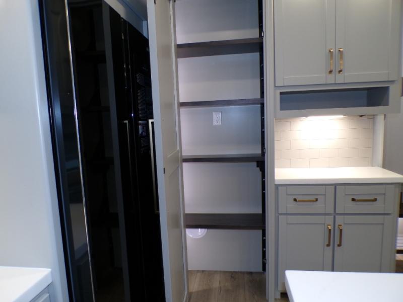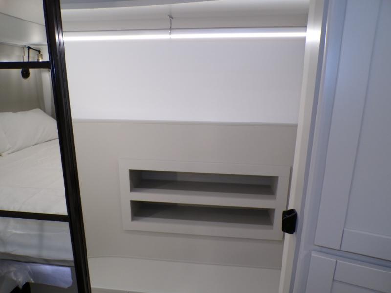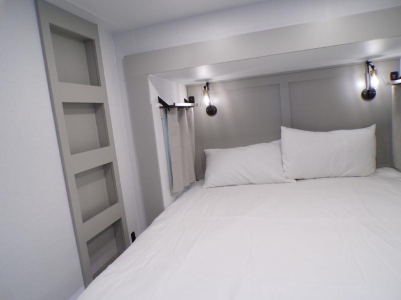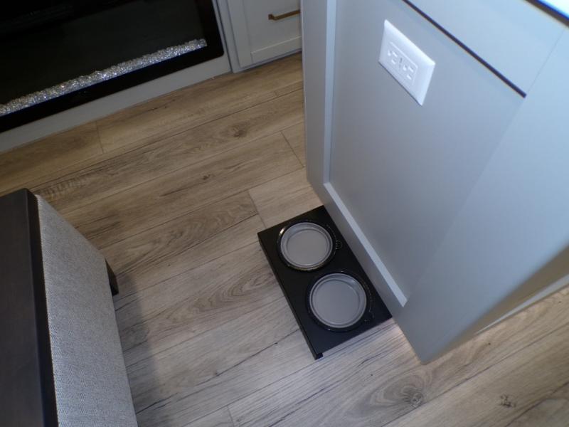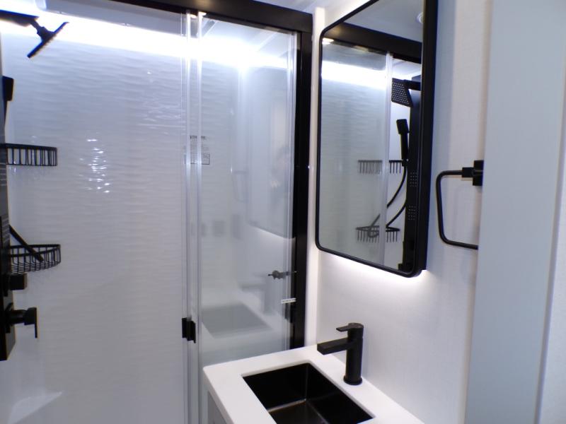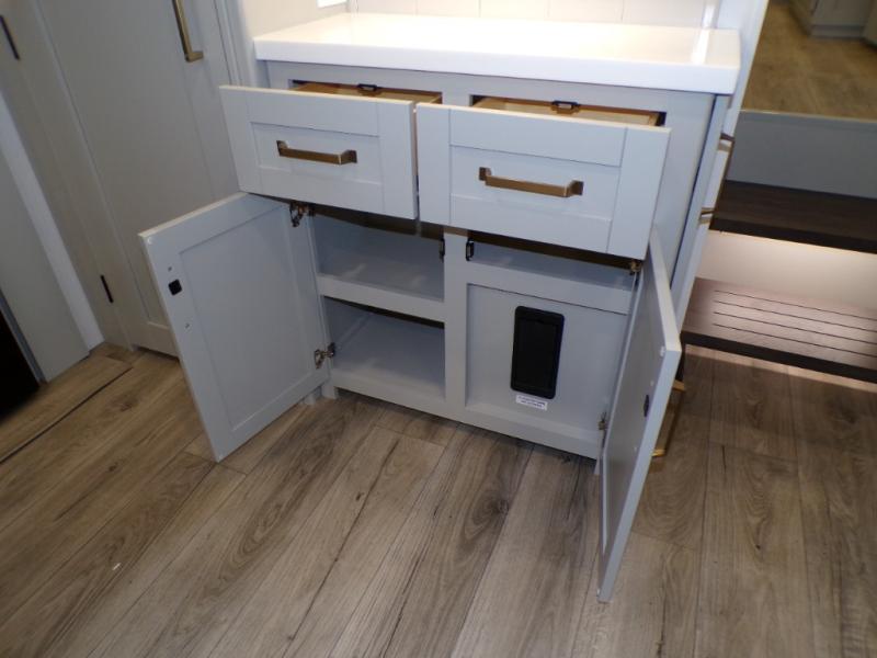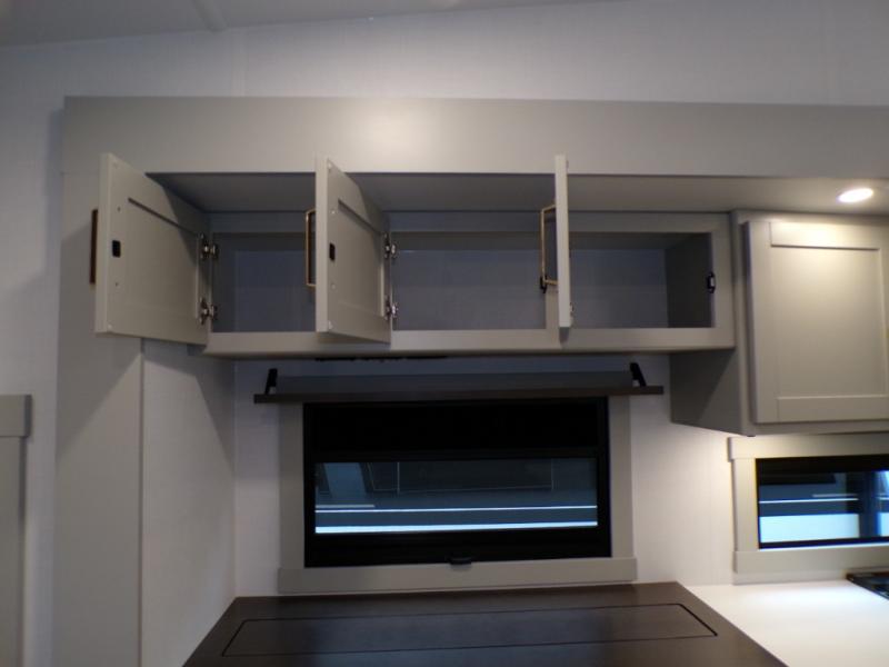 This Model Z luxury fifth wheel is bright and modern on the inside, with loads of amenities that will have you dreaming of your next trip! Enter and find a spacious combined living/kitchen space thanks to dual opposing slides. There is ample seating with a sliding desk/dining table, 62" theater seating, and a 72" tri-fold sofa along the rear wall. You can easily relax and enjoy the 50" Smart telescoping TV with a cozy fireplace below. The kitchen offers all that you need to prepare and cook meals just like home with a 16 cu. ft. refrigerator for your perishables, a 30" microwave oven, and three burner range top and oven. You will love the integrated spice rack, and the kitchen island all outfitted with dog bowls and double pull out trash bins with an integrated Stow 'N Go paper towel holder. There is also an 84" pantry with adjustable shelves for all of your canned and dry goods. Head up the steps to a private master suite with king bed slide. You can opt for the queen bed if you like. A sliding dresser top features hidden storage which is perfect for jewelry and other personal belongings. The front wardrobe features mirrored doors and the corner closet has been prepped for a stackable washer and dryer if you choose to add that option. Relax and enjoy a large bath featuring a linen cabinet, a 30" x 42" shower, and vanity with sink, plus medicine cabinet.