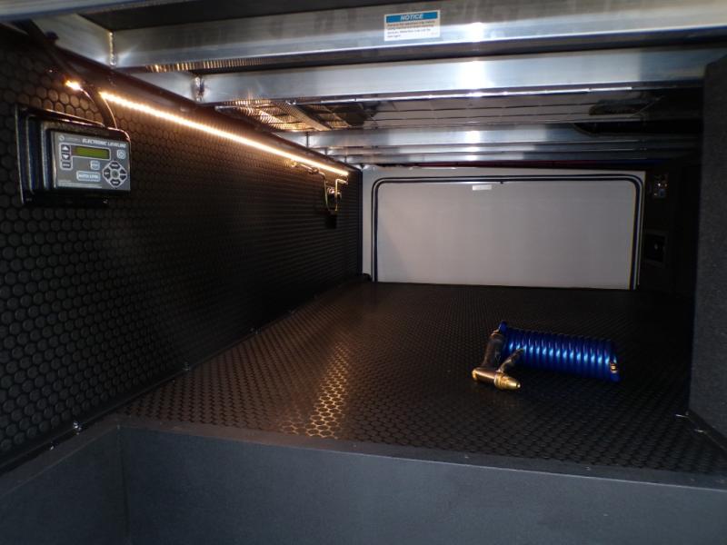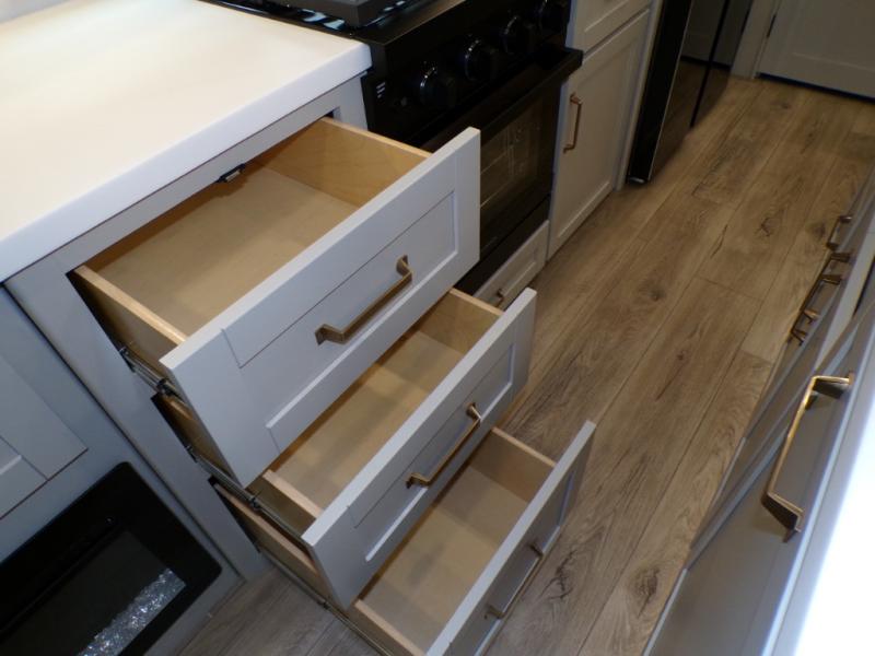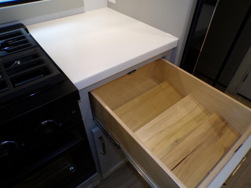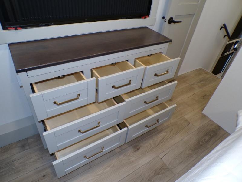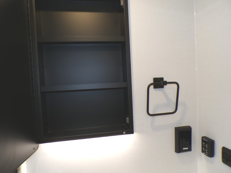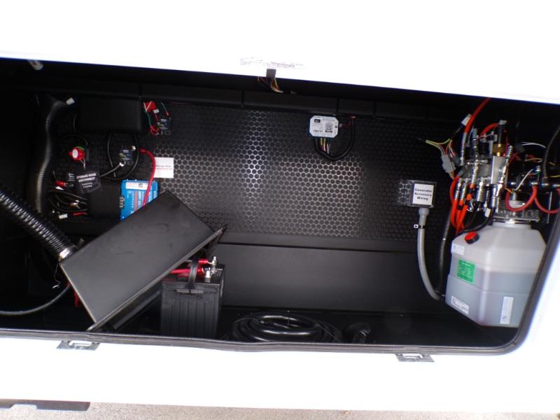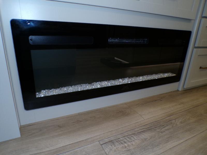 This Model Z luxury fifth wheel is bright and modern on the inside, with loads of amenities that will have you dreaming of your next trip! Enter and find a spacious combined living/kitchen space thanks to dual opposing slides. There is ample seating with a sliding desk/dining table, 62" theater seating, and a 72" tri-fold sofa along the rear wall. You can easily relax and enjoy the 50" Smart telescoping TV with a cozy fireplace below. The kitchen offers all that you need to prepare and cook meals just like home with a 16 cu. ft. refrigerator for your perishables, a 30" microwave oven, and three burner range top and oven. You will love the integrated spice rack, and the kitchen island all outfitted with dog bowls and double pull out trash bins with an integrated Stow 'N Go paper towel holder. There is also an 84" pantry with adjustable shelves for all of your canned and dry goods. Head up the steps to a private master suite with king bed slide. You can opt for the queen bed if you like. A sliding dresser top features hidden storage which is perfect for jewelry and other personal belongings. The front wardrobe features mirrored doors and the corner closet has been prepped for a stackable washer and dryer if you choose to add that option. Relax and enjoy a large bath featuring a linen cabinet, a 30" x 42" shower, and vanity with sink, plus medicine cabinet.