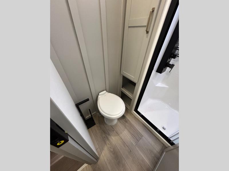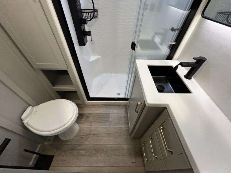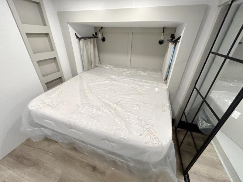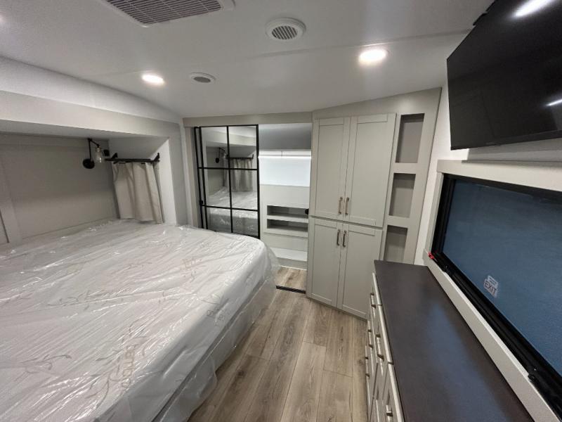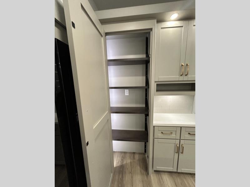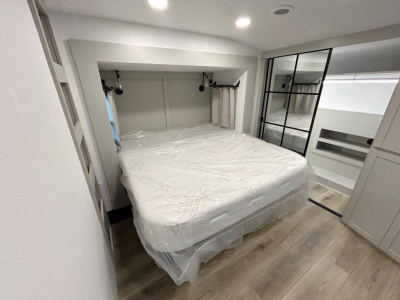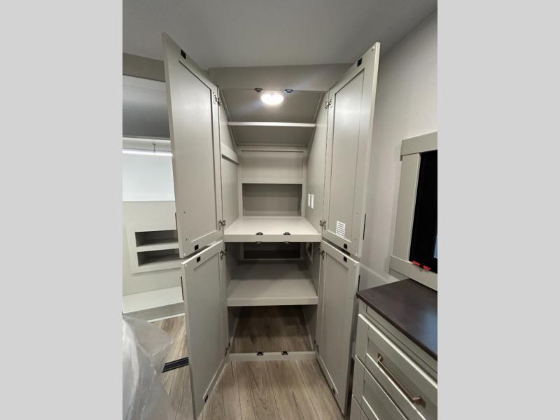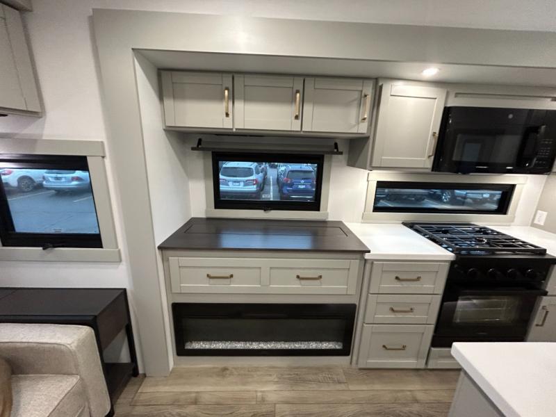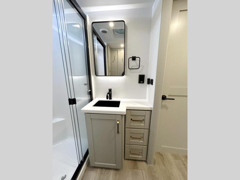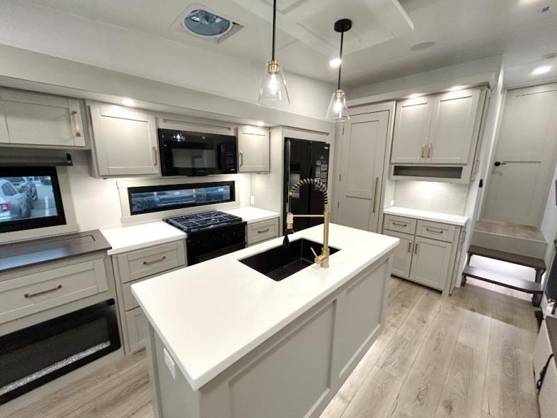 This Model Z luxury fifth wheel is bright and modern on the inside, with loads of amenities that will have you dreaming of your next trip! Enter and find a spacious combined living/kitchen space thanks to dual opposing slides. There is ample seating with a sliding desk/dining table, 62" theater seating, and a 72" tri-fold sofa along the rear wall. You can easily relax and enjoy the 50" Smart telescoping TV with a cozy fireplace below. The kitchen offers all that you need to prepare and cook meals just like home with a 16 cu. ft. refrigerator for your perishables, a 30" microwave oven, and three burner range top and oven. You will love the integrated spice rack, and the kitchen island all outfitted with dog bowls and double pull out trash bins with an integrated Stow 'N Go paper towel holder. There is also an 84" pantry with adjustable shelves for all of your canned and dry goods. Head up the steps to a private master suite with king bed slide. You can opt for the queen bed if you like. A sliding dresser top features hidden storage which is perfect for jewelry and other personal belongings. The front wardrobe features mirrored doors and the corner closet has been prepped for a stackable washer and dryer if you choose to add that option. Relax and enjoy a large bath featuring a linen cabinet, a 30" x 42" shower, and vanity with sink, plus medicine cabinet.