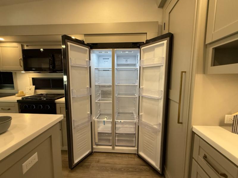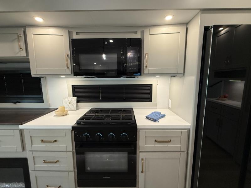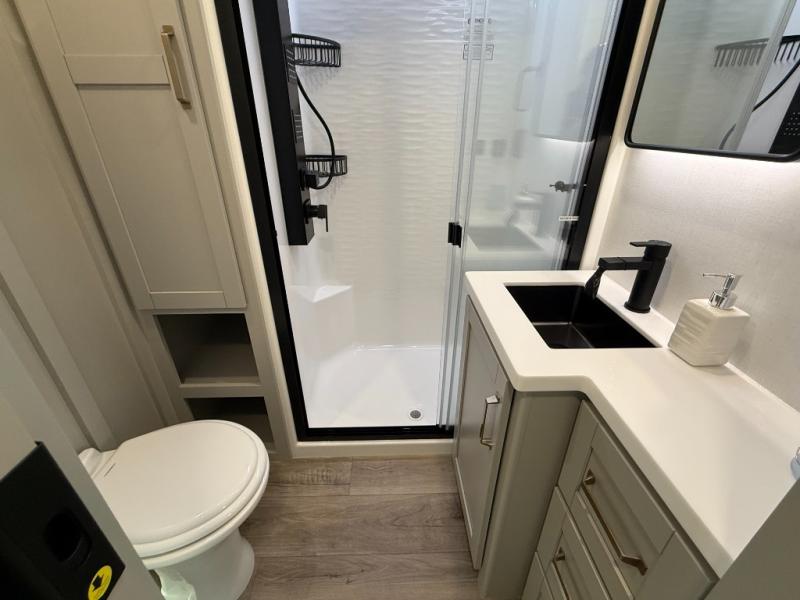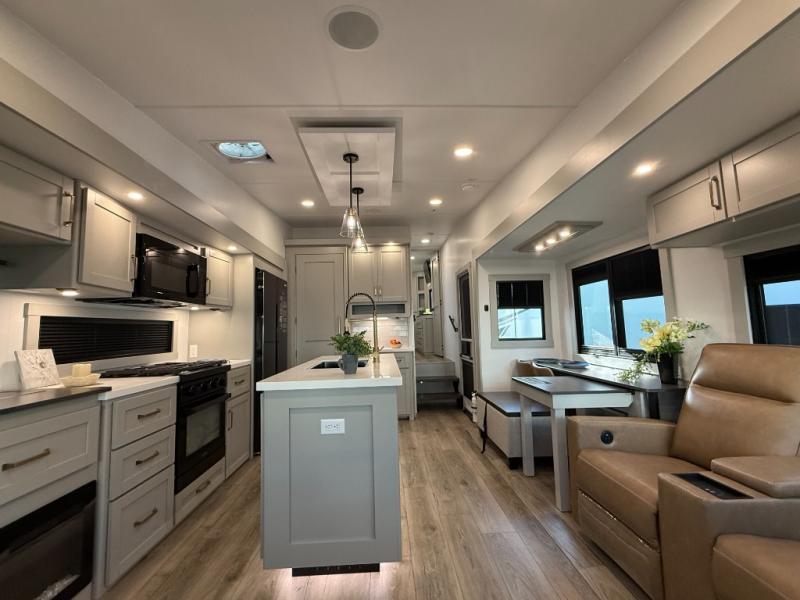 This Model Z luxury fifth wheel is bright and modern on the inside, with loads of amenities that will have you dreaming of your next trip! Enter and find a spacious combined living/kitchen space thanks to dual opposing slides. There is ample seating with a sliding desk/dining table, 62" theater seating, and a 72" tri-fold sofa along the rear wall. You can easily relax and enjoy the 50" Smart telescoping TV with a cozy fireplace below. The kitchen offers all that you need to prepare and cook meals just like home with a 16 cu. ft. refrigerator for your perishables, a 30" microwave oven, and three burner range top and oven. You will love the integrated spice rack, and the kitchen island all outfitted with dog bowls and double pull out trash bins with an integrated Stow 'N Go paper towel holder. There is also an 84" pantry with adjustable shelves for all of your canned and dry goods. Head up the steps to a private master suite with king bed slide. You can opt for the queen bed if you like. A sliding dresser top features hidden storage which is perfect for jewelry and other personal belongings. The front wardrobe features mirrored doors and the corner closet has been prepped for a stackable washer and dryer if you choose to add that option. Relax and enjoy a large bath featuring a linen cabinet, a 30" x 42" shower, and vanity with sink, plus medicine cabinet.