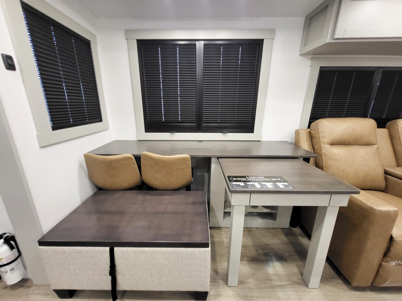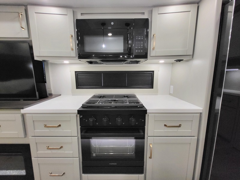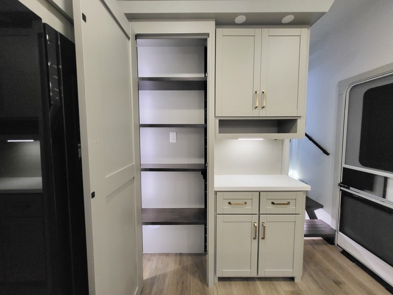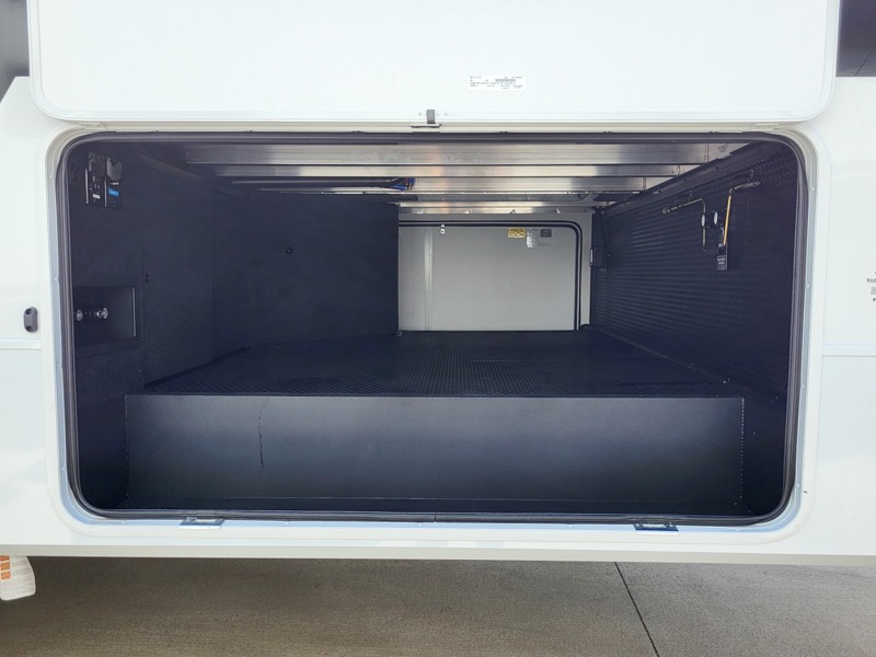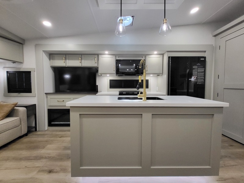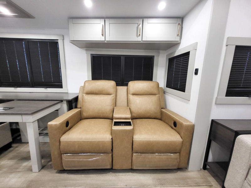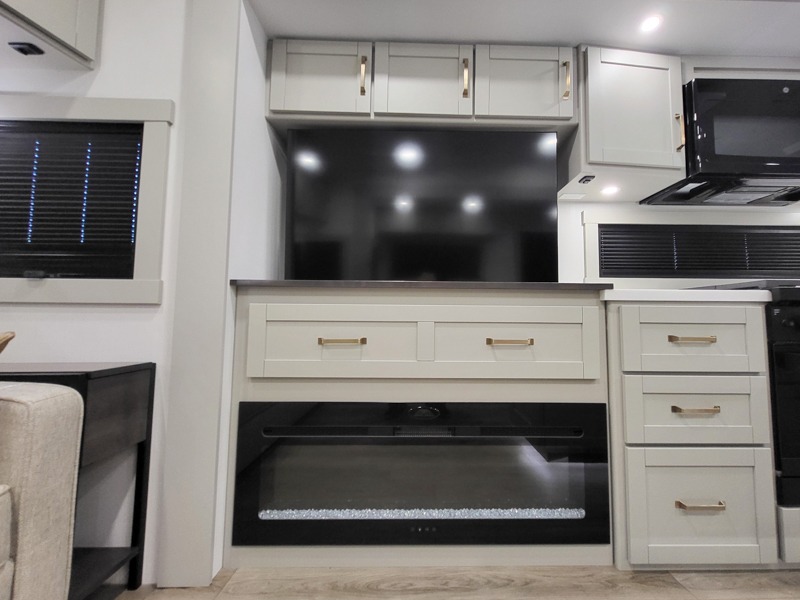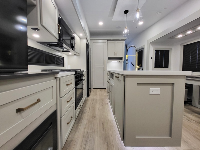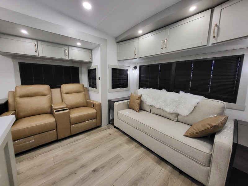 This Model Z luxury fifth wheel is bright and modern on the inside, with loads of amenities that will have you dreaming of your next trip! Enter and find a spacious combined living/kitchen space thanks to dual opposing slides. There is ample seating with a sliding desk/dining table, 62" theater seating, and a 72" tri-fold sofa along the rear wall. You can easily relax and enjoy the 50" Smart telescoping TV with a cozy fireplace below. The kitchen offers all that you need to prepare and cook meals just like home with a 16 cu. ft. refrigerator for your perishables, a 30" microwave oven, and three burner range top and oven. You will love the integrated spice rack, and the kitchen island all outfitted with dog bowls and double pull out trash bins with an integrated Stow 'N Go paper towel holder. There is also an 84" pantry with adjustable shelves for all of your canned and dry goods. Head up the steps to a private master suite with king bed slide. You can opt for the queen bed if you like. A sliding dresser top features hidden storage which is perfect for jewelry and other personal belongings. The front wardrobe features mirrored doors and the corner closet has been prepped for a stackable washer and dryer if you choose to add that option. Relax and enjoy a large bath featuring a linen cabinet, a 30" x 42" shower, and vanity with sink, plus medicine cabinet.