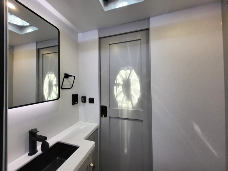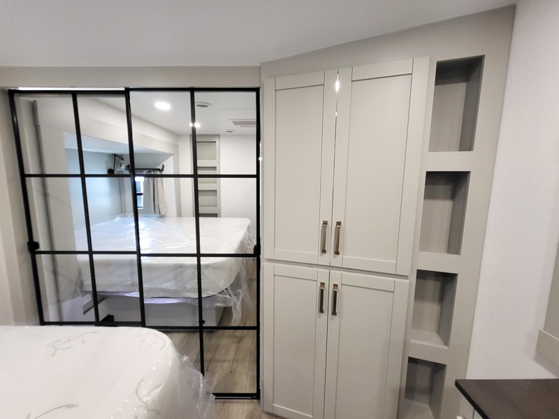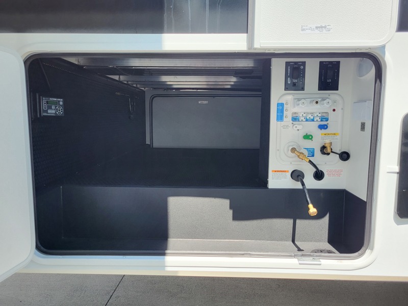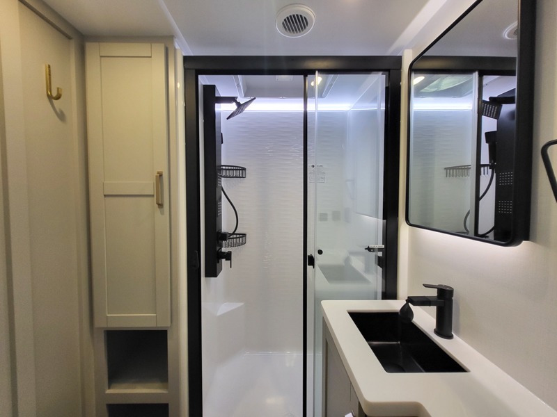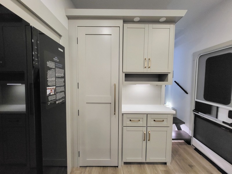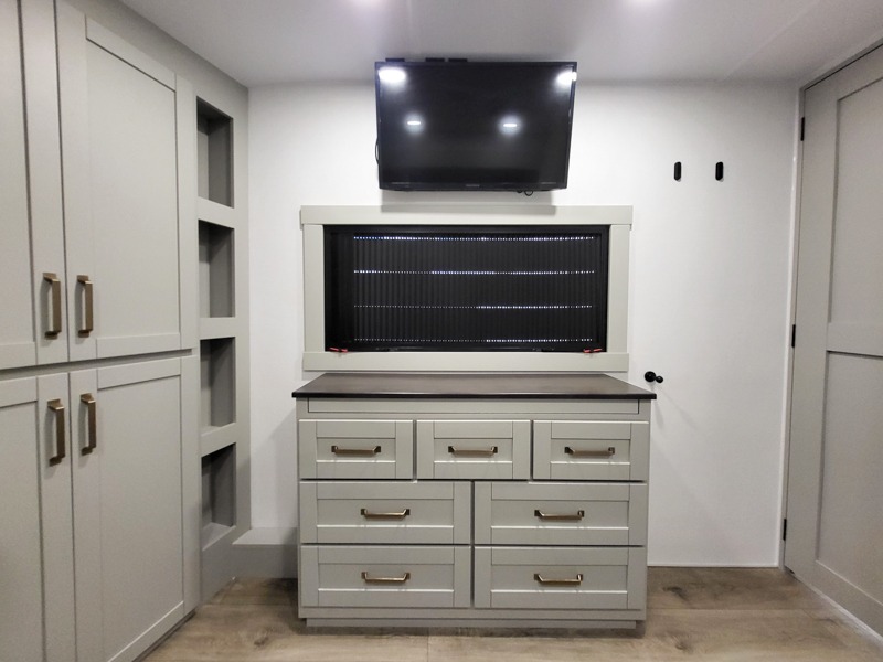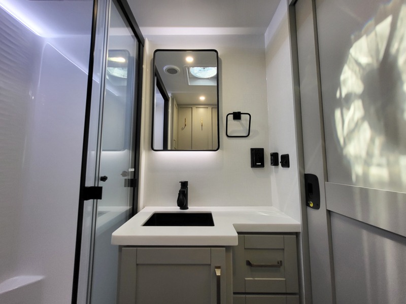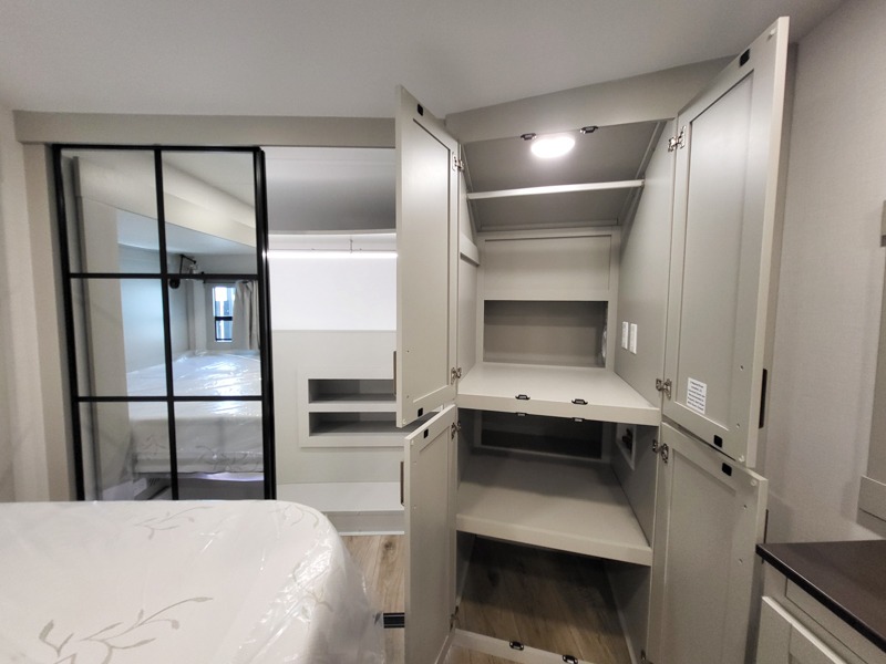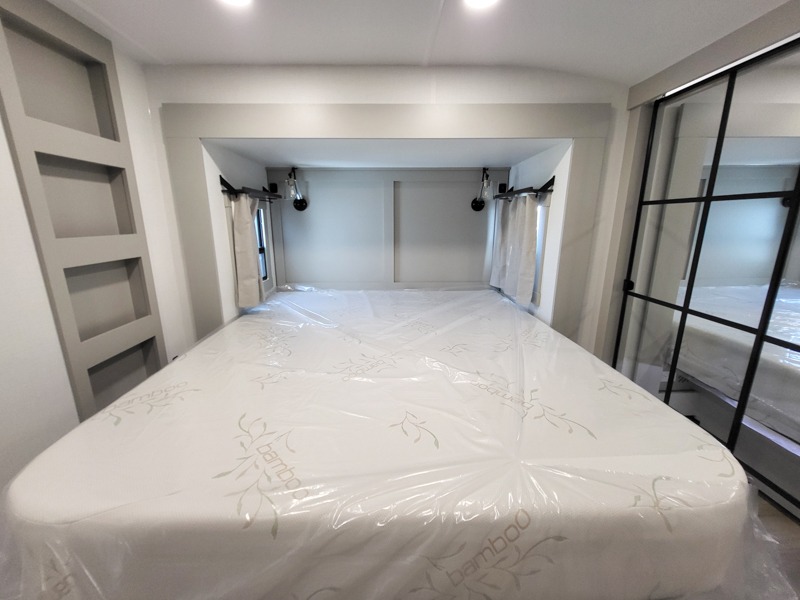 This Model Z luxury fifth wheel is bright and modern on the inside, with loads of amenities that will have you dreaming of your next trip! Enter and find a spacious combined living/kitchen space thanks to dual opposing slides. There is ample seating with a sliding desk/dining table, 62" theater seating, and a 72" tri-fold sofa along the rear wall. You can easily relax and enjoy the 50" Smart telescoping TV with a cozy fireplace below. The kitchen offers all that you need to prepare and cook meals just like home with a 16 cu. ft. refrigerator for your perishables, a 30" microwave oven, and three burner range top and oven. You will love the integrated spice rack, and the kitchen island all outfitted with dog bowls and double pull out trash bins with an integrated Stow 'N Go paper towel holder. There is also an 84" pantry with adjustable shelves for all of your canned and dry goods. Head up the steps to a private master suite with king bed slide. You can opt for the queen bed if you like. A sliding dresser top features hidden storage which is perfect for jewelry and other personal belongings. The front wardrobe features mirrored doors and the corner closet has been prepped for a stackable washer and dryer if you choose to add that option. Relax and enjoy a large bath featuring a linen cabinet, a 30" x 42" shower, and vanity with sink, plus medicine cabinet.