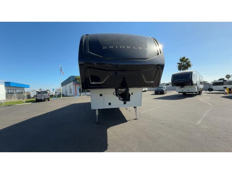 The Brinkley mid-profile Model Z fifth wheels bring you clean lines and an upscale look with plenty of style and exciting new features like the industry first brass plumbing connections. These units also feature an automotive grade front cap, plenty of exterior storage, dual exterior hot and cold showers, and wide stance leveling jacks for easy set up. Residential frameless windows provide a clean look and beautiful views, and ample electrical outlets and 6 USB/USB-C outlets allow all of your electronics and appliances to easily be used and charged.