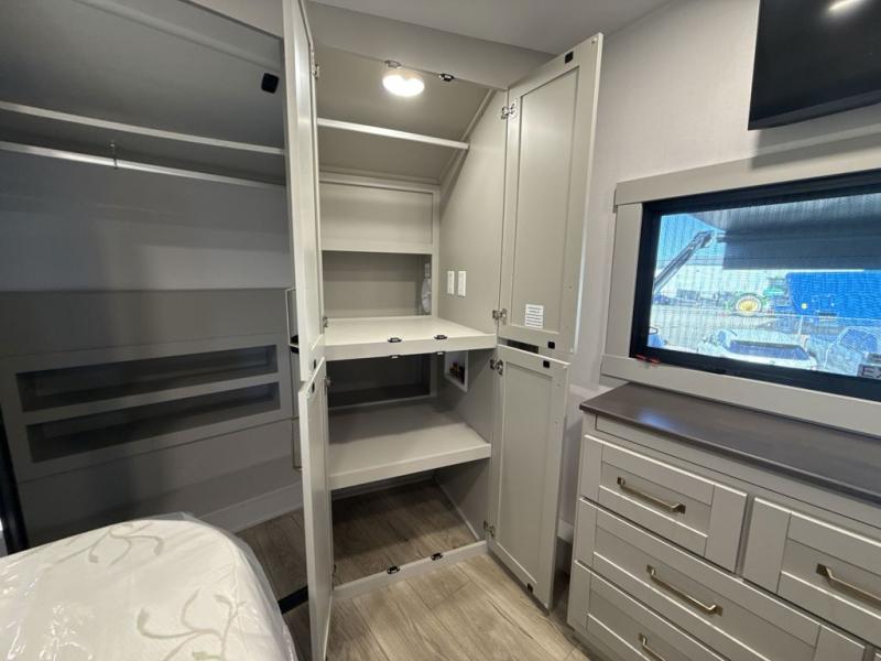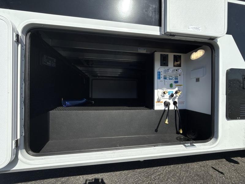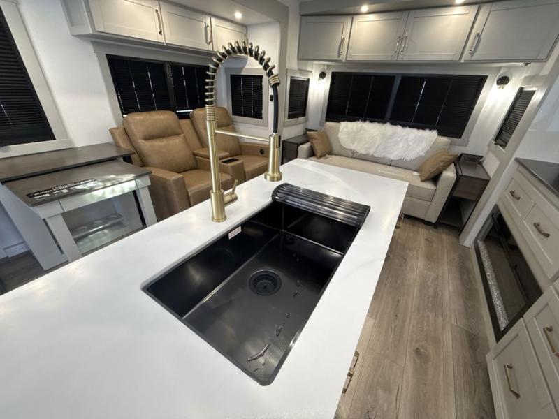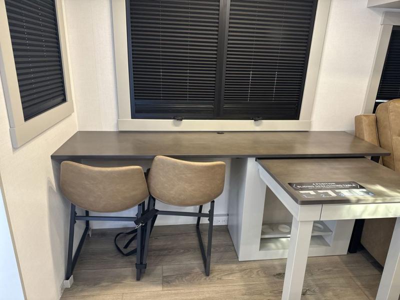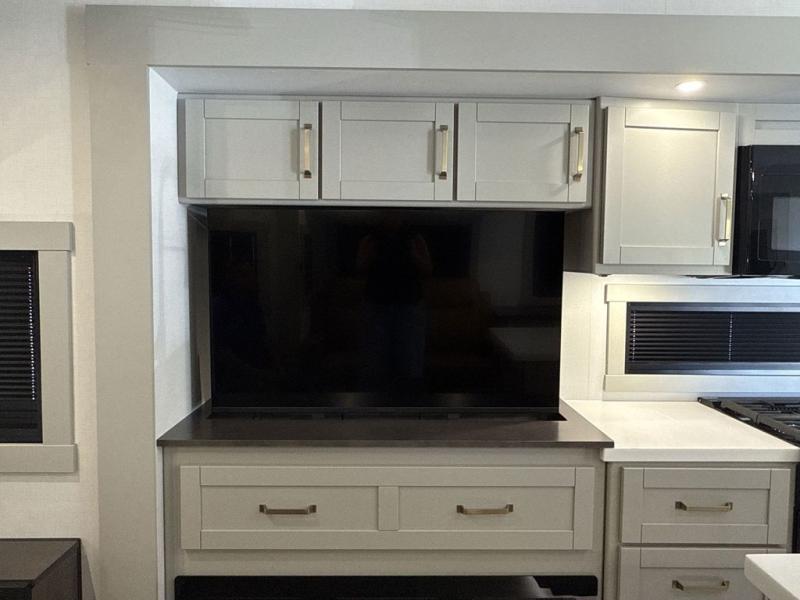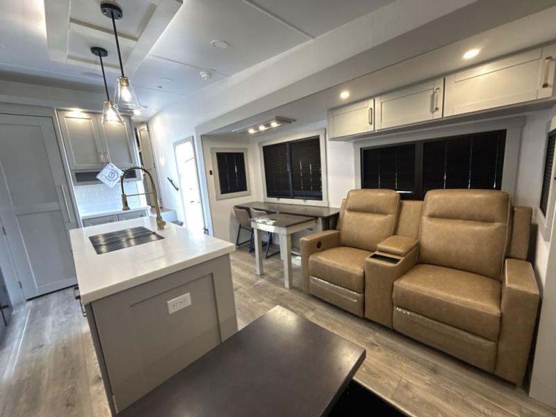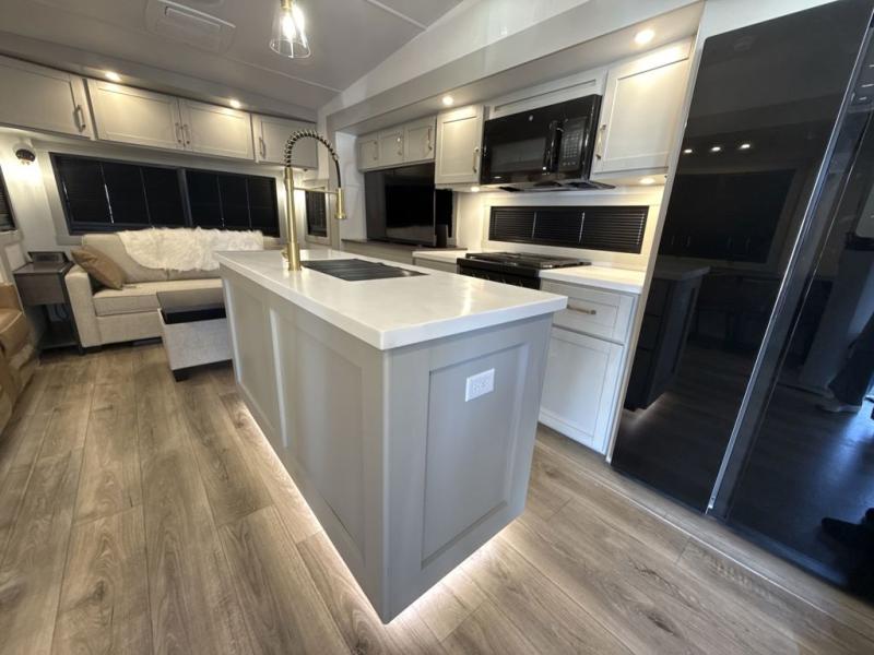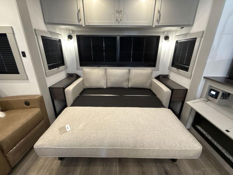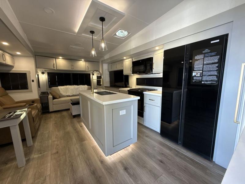 This Model Z luxury fifth wheel is bright and modern on the inside, with loads of amenities that will have you dreaming of your next trip! Enter and find a spacious combined living/kitchen space thanks to dual opposing slides. There is ample seating with a sliding desk/dining table, 62" theater seating, and a 72" tri-fold sofa along the rear wall. You can easily relax and enjoy the 50" Smart telescoping TV with a cozy fireplace below. The kitchen offers all that you need to prepare and cook meals just like home with a 16 cu. ft. refrigerator for your perishables, a 30" microwave oven, and three burner range top and oven. You will love the integrated spice rack, and the kitchen island all outfitted with dog bowls and double pull out trash bins with an integrated Stow 'N Go paper towel holder. There is also an 84" pantry with adjustable shelves for all of your canned and dry goods. Head up the steps to a private master suite with king bed slide. You can opt for the queen bed if you like. A sliding dresser top features hidden storage which is perfect for jewelry and other personal belongings. The front wardrobe features mirrored doors and the corner closet has been prepped for a stackable washer and dryer if you choose to add that option. Relax and enjoy a large bath featuring a linen cabinet, a 30" x 42" shower, and vanity with sink, plus medicine cabinet.