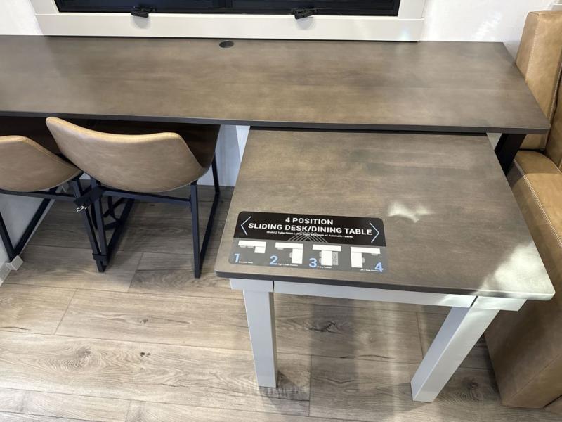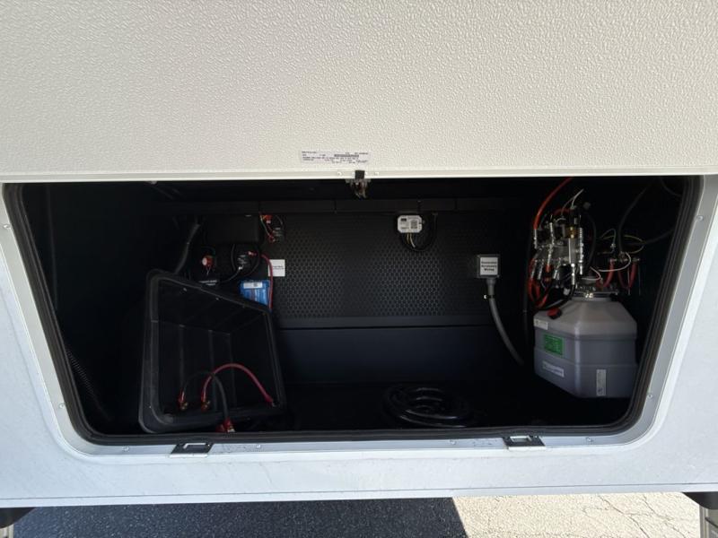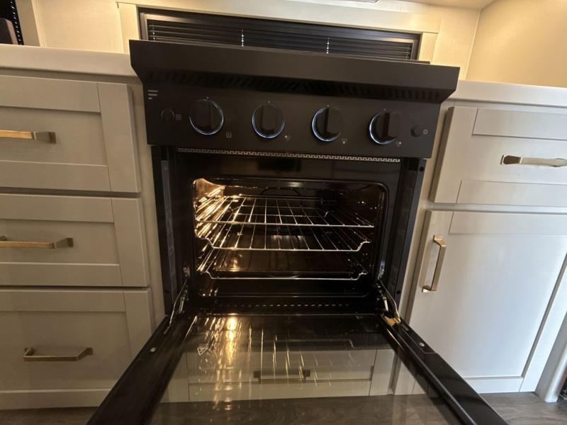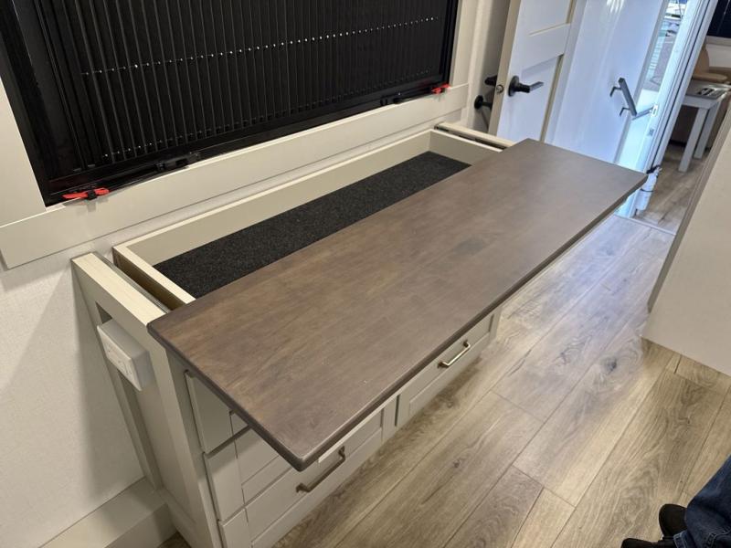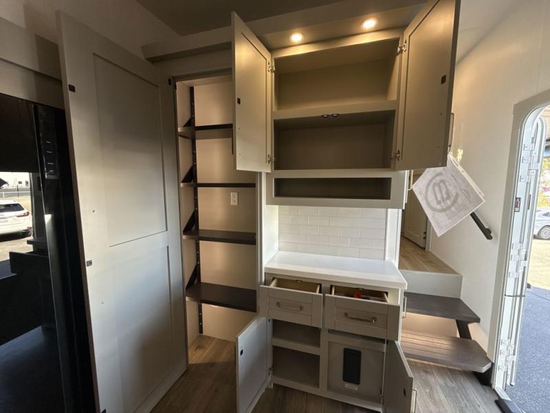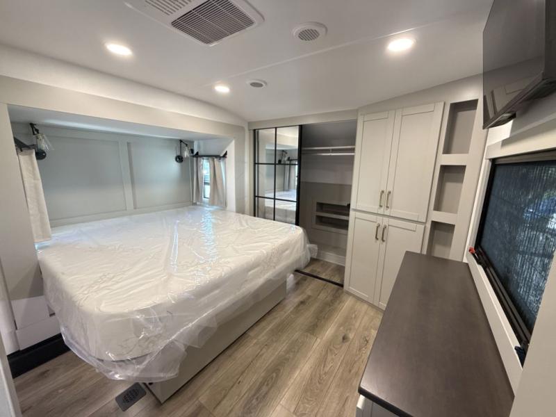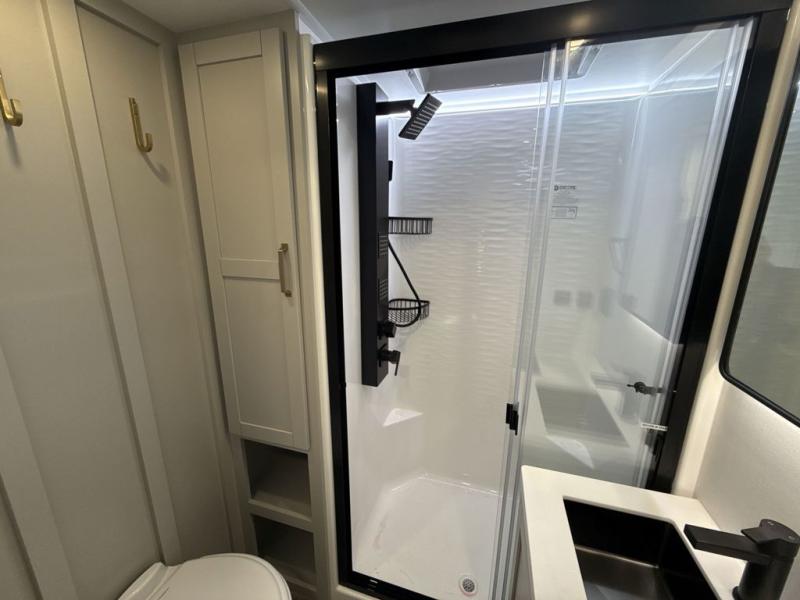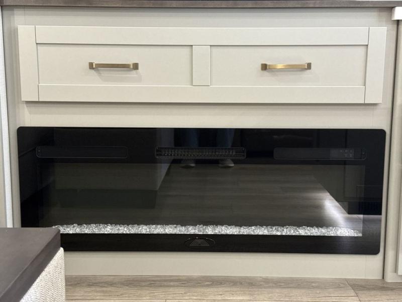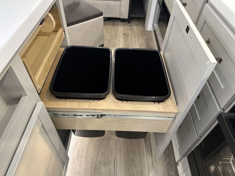 This Model Z luxury fifth wheel is bright and modern on the inside, with loads of amenities that will have you dreaming of your next trip! Enter and find a spacious combined living/kitchen space thanks to dual opposing slides. There is ample seating with a sliding desk/dining table, 62" theater seating, and a 72" tri-fold sofa along the rear wall. You can easily relax and enjoy the 50" Smart telescoping TV with a cozy fireplace below. The kitchen offers all that you need to prepare and cook meals just like home with a 16 cu. ft. refrigerator for your perishables, a 30" microwave oven, and three burner range top and oven. You will love the integrated spice rack, and the kitchen island all outfitted with dog bowls and double pull out trash bins with an integrated Stow 'N Go paper towel holder. There is also an 84" pantry with adjustable shelves for all of your canned and dry goods. Head up the steps to a private master suite with king bed slide. You can opt for the queen bed if you like. A sliding dresser top features hidden storage which is perfect for jewelry and other personal belongings. The front wardrobe features mirrored doors and the corner closet has been prepped for a stackable washer and dryer if you choose to add that option. Relax and enjoy a large bath featuring a linen cabinet, a 30" x 42" shower, and vanity with sink, plus medicine cabinet.