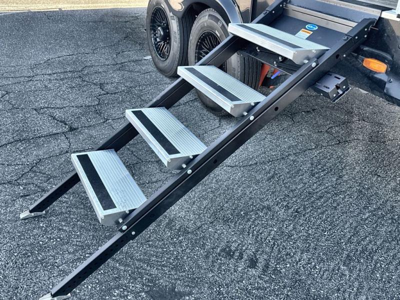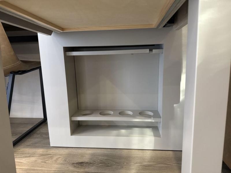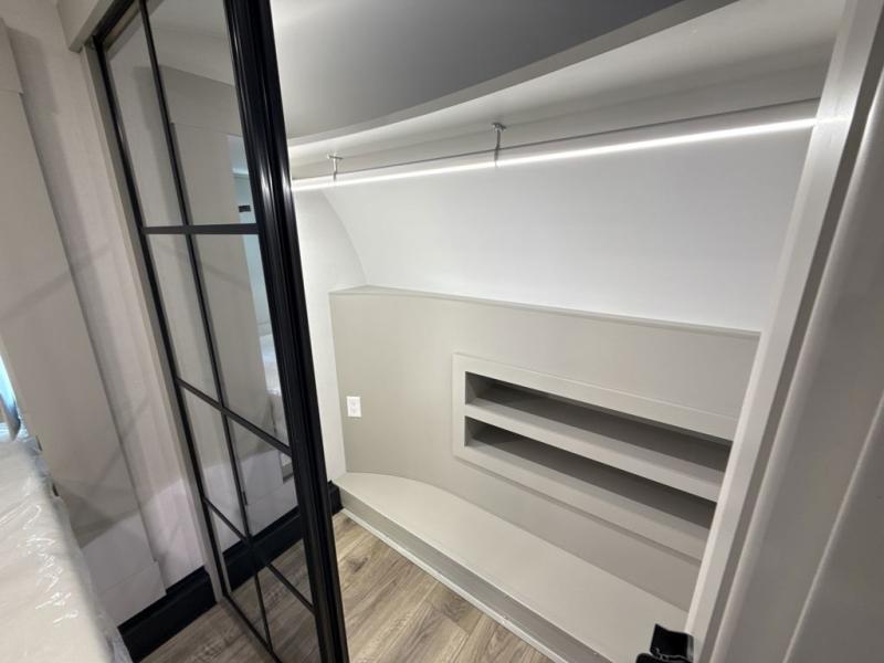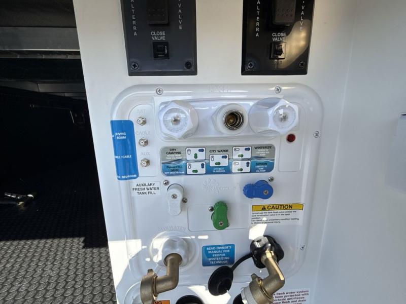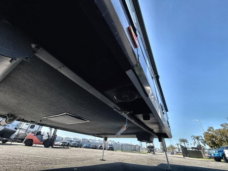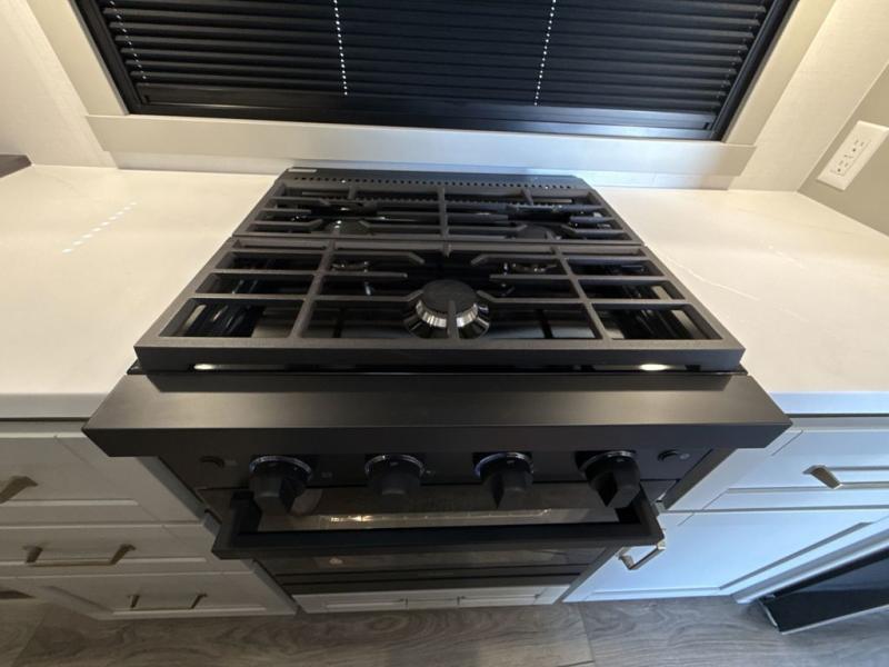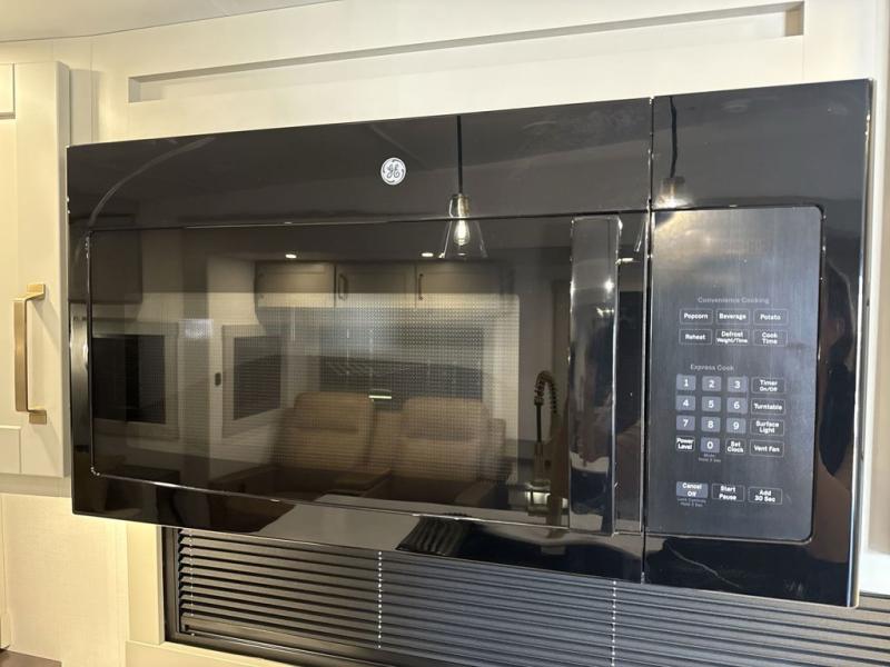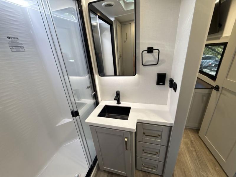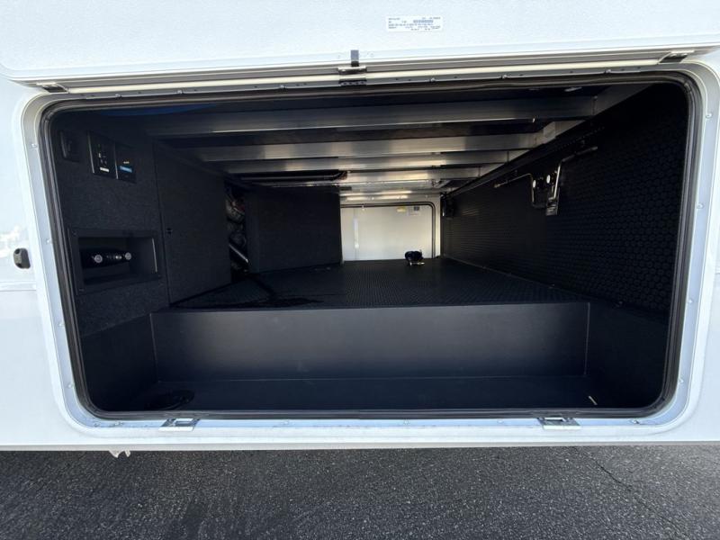 This Model Z luxury fifth wheel is bright and modern on the inside, with loads of amenities that will have you dreaming of your next trip! Enter and find a spacious combined living/kitchen space thanks to dual opposing slides. There is ample seating with a sliding desk/dining table, 62" theater seating, and a 72" tri-fold sofa along the rear wall. You can easily relax and enjoy the 50" Smart telescoping TV with a cozy fireplace below. The kitchen offers all that you need to prepare and cook meals just like home with a 16 cu. ft. refrigerator for your perishables, a 30" microwave oven, and three burner range top and oven. You will love the integrated spice rack, and the kitchen island all outfitted with dog bowls and double pull out trash bins with an integrated Stow 'N Go paper towel holder. There is also an 84" pantry with adjustable shelves for all of your canned and dry goods. Head up the steps to a private master suite with king bed slide. You can opt for the queen bed if you like. A sliding dresser top features hidden storage which is perfect for jewelry and other personal belongings. The front wardrobe features mirrored doors and the corner closet has been prepped for a stackable washer and dryer if you choose to add that option. Relax and enjoy a large bath featuring a linen cabinet, a 30" x 42" shower, and vanity with sink, plus medicine cabinet.