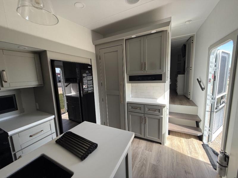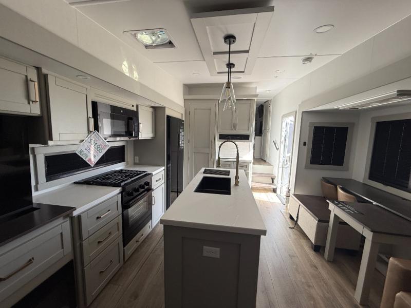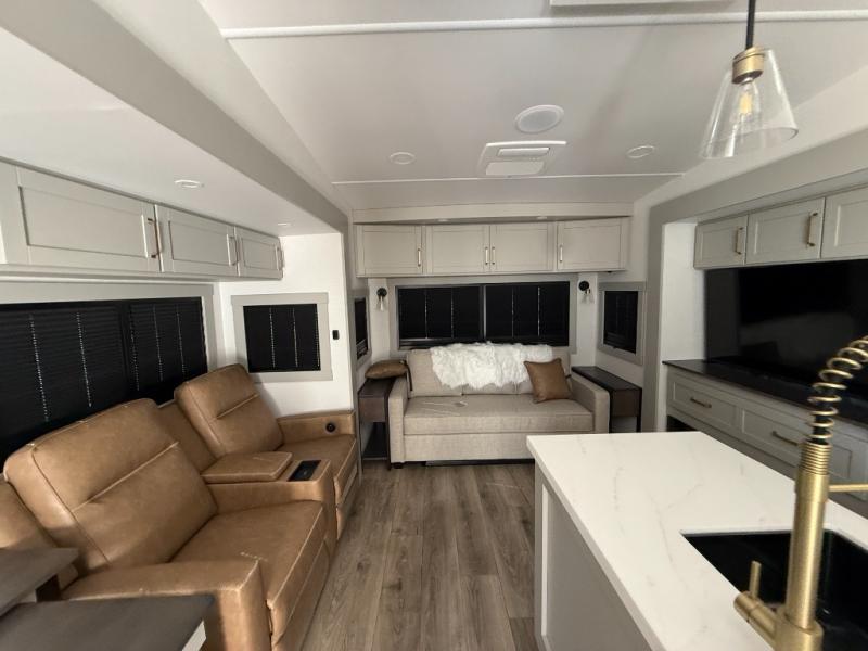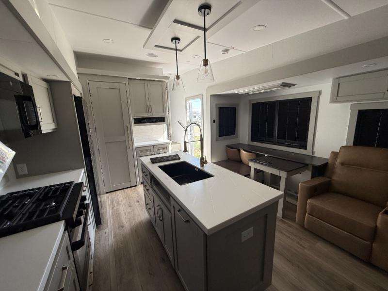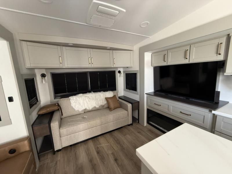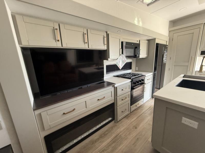 This Model Z luxury fifth wheel is bright and modern on the inside, with loads of amenities that will have you dreaming of your next trip! Enter and find a spacious combined living/kitchen space thanks to dual opposing slides. There is ample seating with a sliding desk/dining table, 62" theater seating, and a 72" tri-fold sofa along the rear wall. You can easily relax and enjoy the 50" Smart telescoping TV with a cozy fireplace below. The kitchen offers all that you need to prepare and cook meals just like home with a 16 cu. ft. refrigerator for your perishables, a 30" microwave oven, and three burner range top and oven. You will love the integrated spice rack, and the kitchen island all outfitted with dog bowls and double pull out trash bins with an integrated Stow 'N Go paper towel holder. There is also an 84" pantry with adjustable shelves for all of your canned and dry goods. Head up the steps to a private master suite with king bed slide. You can opt for the queen bed if you like. A sliding dresser top features hidden storage which is perfect for jewelry and other personal belongings. The front wardrobe features mirrored doors and the corner closet has been prepped for a stackable washer and dryer if you choose to add that option. Relax and enjoy a large bath featuring a linen cabinet, a 30" x 42" shower, and vanity with sink, plus medicine cabinet.