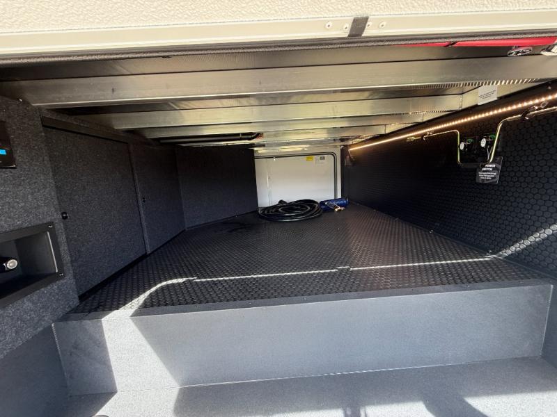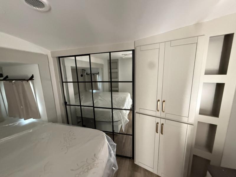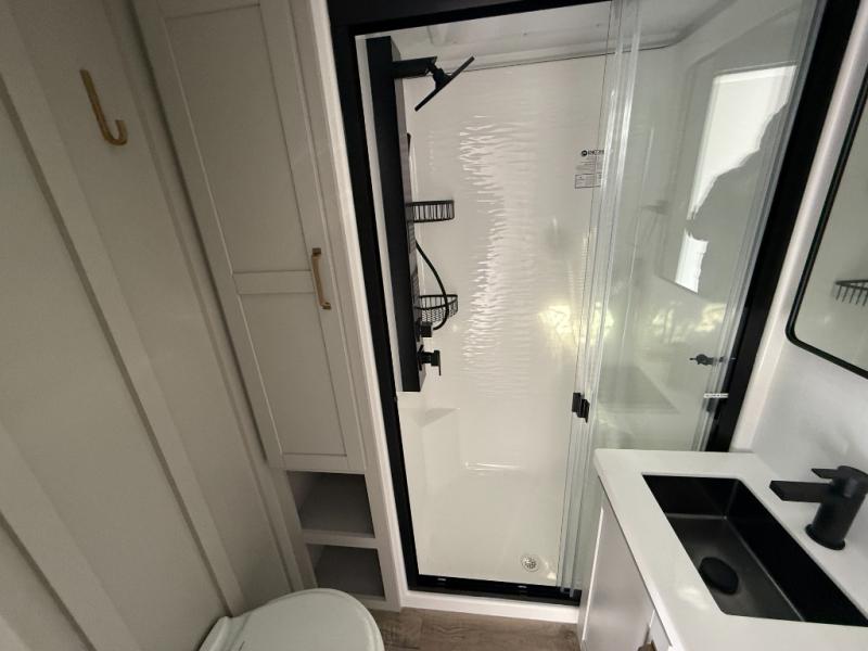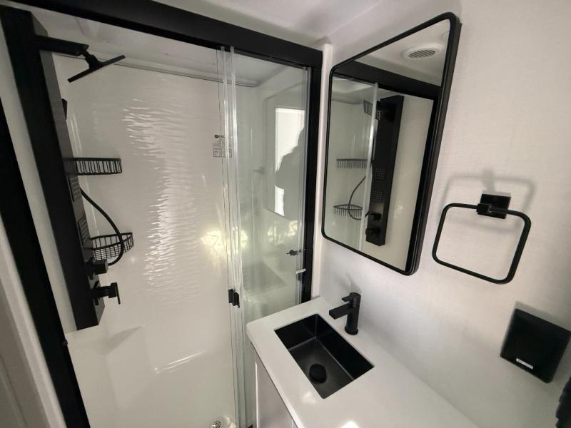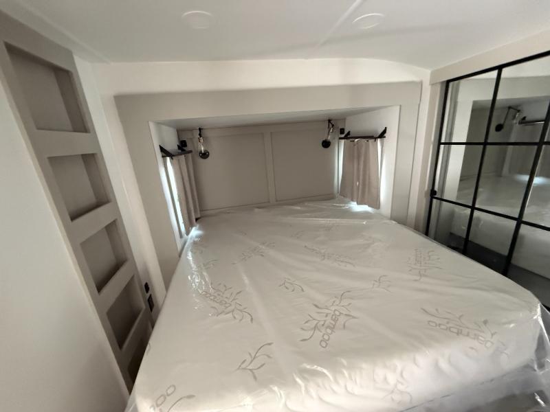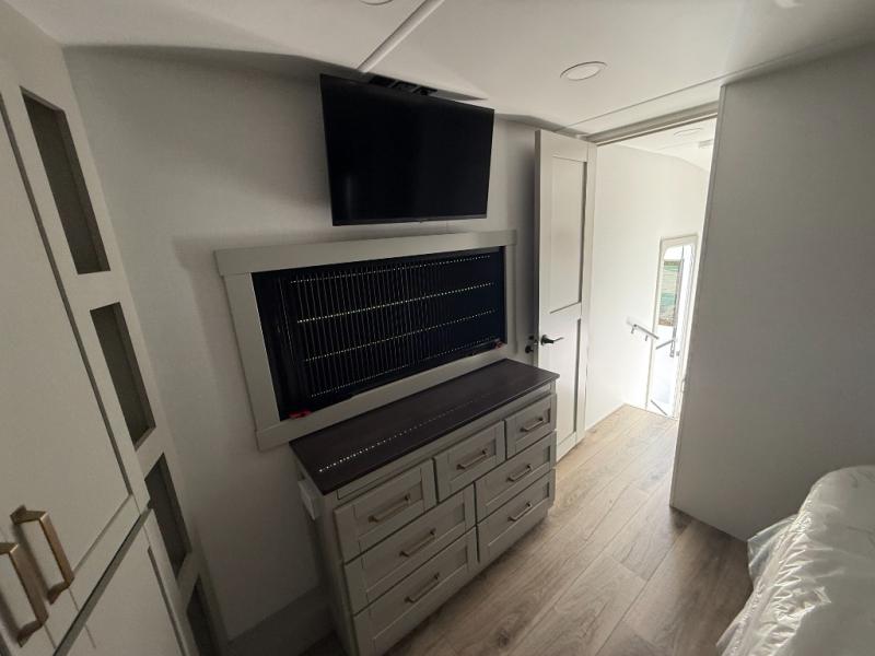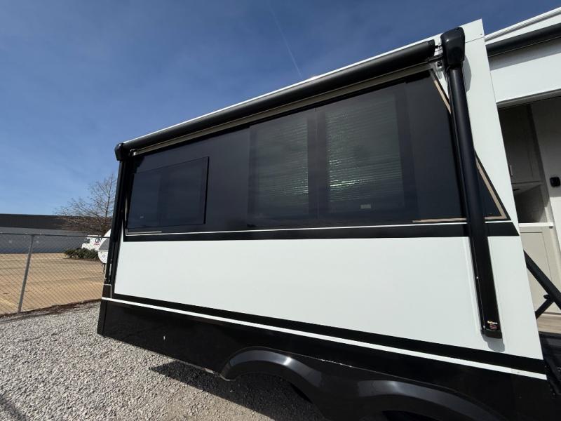 This Model Z luxury fifth wheel is bright and modern on the inside, with loads of amenities that will have you dreaming of your next trip! Enter and find a spacious combined living/kitchen space thanks to dual opposing slides. There is ample seating with a sliding desk/dining table, 62" theater seating, and a 72" tri-fold sofa along the rear wall. You can easily relax and enjoy the 50" Smart telescoping TV with a cozy fireplace below. The kitchen offers all that you need to prepare and cook meals just like home with a 16 cu. ft. refrigerator for your perishables, a 30" microwave oven, and three burner range top and oven. You will love the integrated spice rack, and the kitchen island all outfitted with dog bowls and double pull out trash bins with an integrated Stow 'N Go paper towel holder. There is also an 84" pantry with adjustable shelves for all of your canned and dry goods. Head up the steps to a private master suite with king bed slide. You can opt for the queen bed if you like. A sliding dresser top features hidden storage which is perfect for jewelry and other personal belongings. The front wardrobe features mirrored doors and the corner closet has been prepped for a stackable washer and dryer if you choose to add that option. Relax and enjoy a large bath featuring a linen cabinet, a 30" x 42" shower, and vanity with sink, plus medicine cabinet.