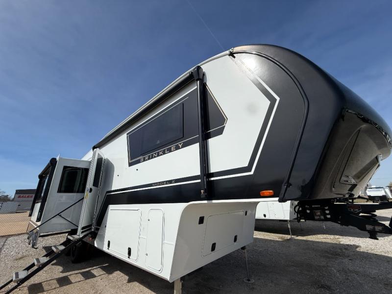 The Brinkley mid-profile Model Z fifth wheels bring you clean lines and an upscale look with plenty of style and exciting new features like the industry first brass plumbing connections. These units also feature an automotive grade front cap, plenty of exterior storage, dual exterior hot and cold showers, and wide stance leveling jacks for easy set up. Residential frameless windows provide a clean look and beautiful views, and ample electrical outlets and 6 USB/USB-C outlets allow all of your electronics and appliances to easily be used and charged.