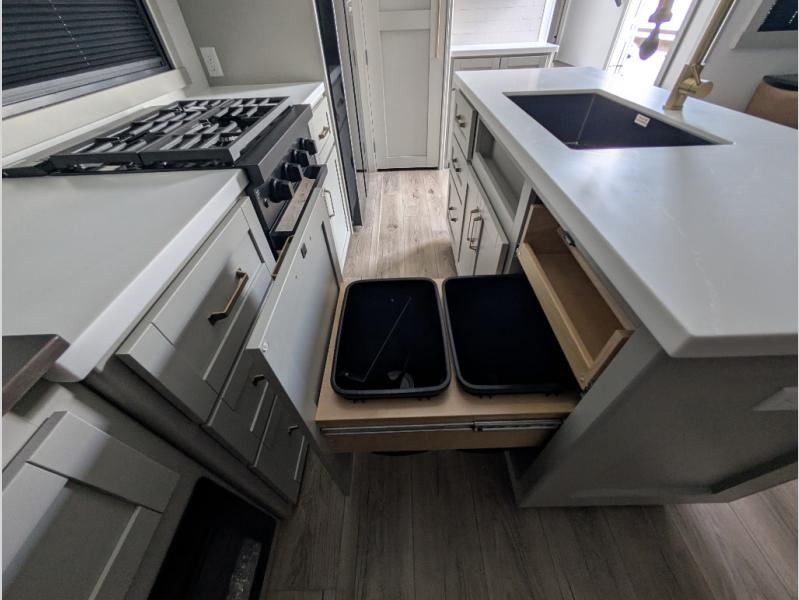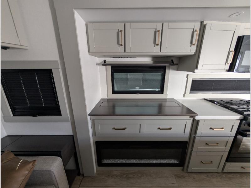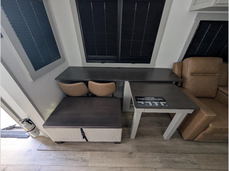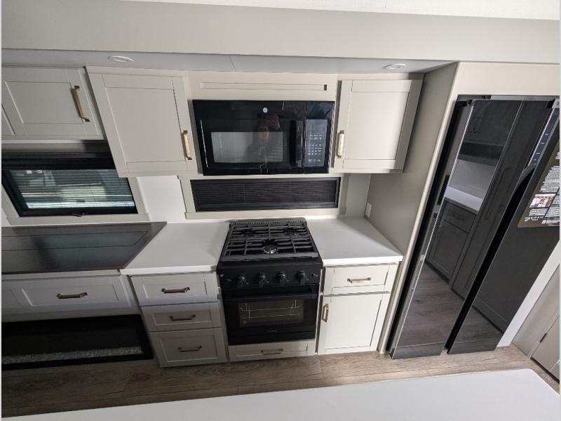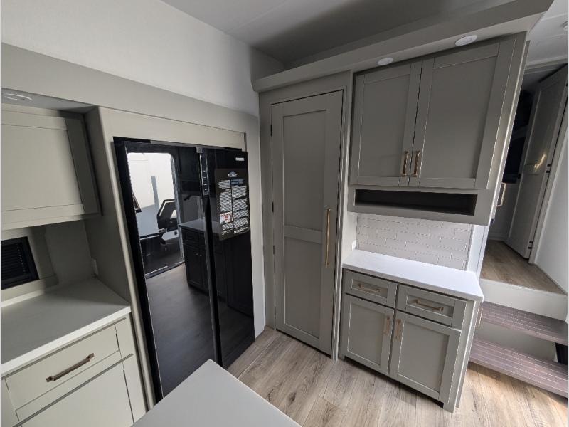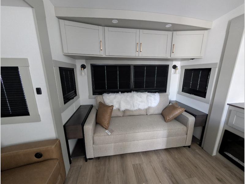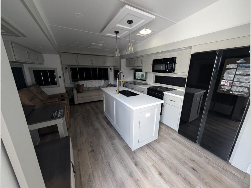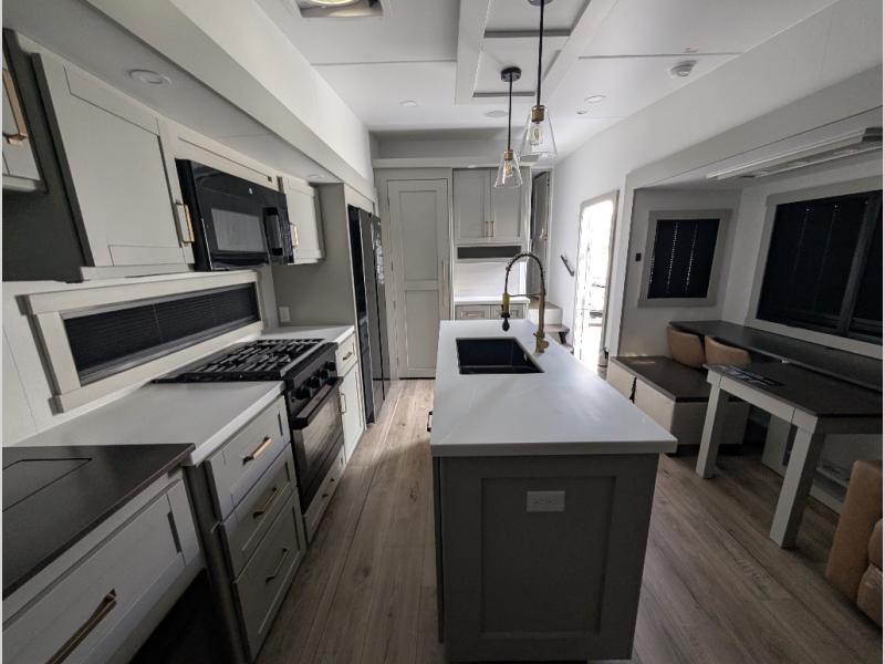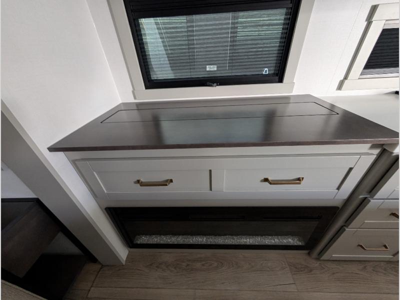 This Model Z luxury fifth wheel is bright and modern on the inside, with loads of amenities that will have you dreaming of your next trip! Enter and find a spacious combined living/kitchen space thanks to dual opposing slides. There is ample seating with a sliding desk/dining table, 62" theater seating, and a 72" tri-fold sofa along the rear wall. You can easily relax and enjoy the 50" Smart telescoping TV with a cozy fireplace below. The kitchen offers all that you need to prepare and cook meals just like home with a 16 cu. ft. refrigerator for your perishables, a 30" microwave oven, and three burner range top and oven. You will love the integrated spice rack, and the kitchen island all outfitted with dog bowls and double pull out trash bins with an integrated Stow 'N Go paper towel holder. There is also an 84" pantry with adjustable shelves for all of your canned and dry goods. Head up the steps to a private master suite with king bed slide. You can opt for the queen bed if you like. A sliding dresser top features hidden storage which is perfect for jewelry and other personal belongings. The front wardrobe features mirrored doors and the corner closet has been prepped for a stackable washer and dryer if you choose to add that option. Relax and enjoy a large bath featuring a linen cabinet, a 30" x 42" shower, and vanity with sink, plus medicine cabinet.