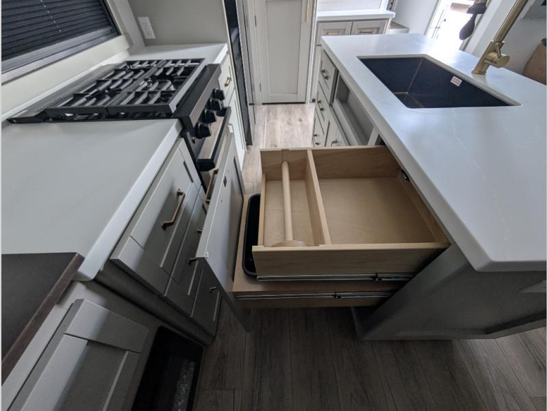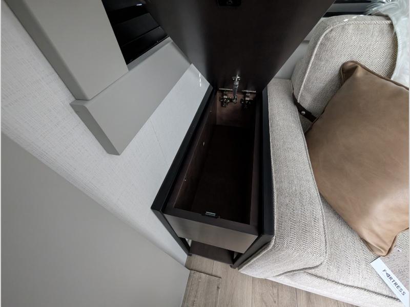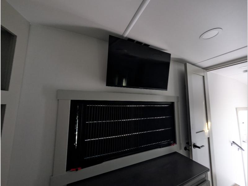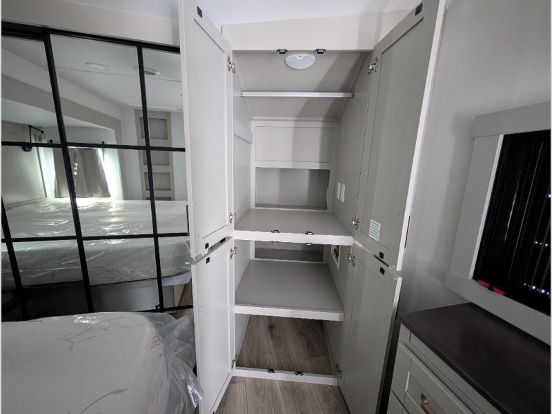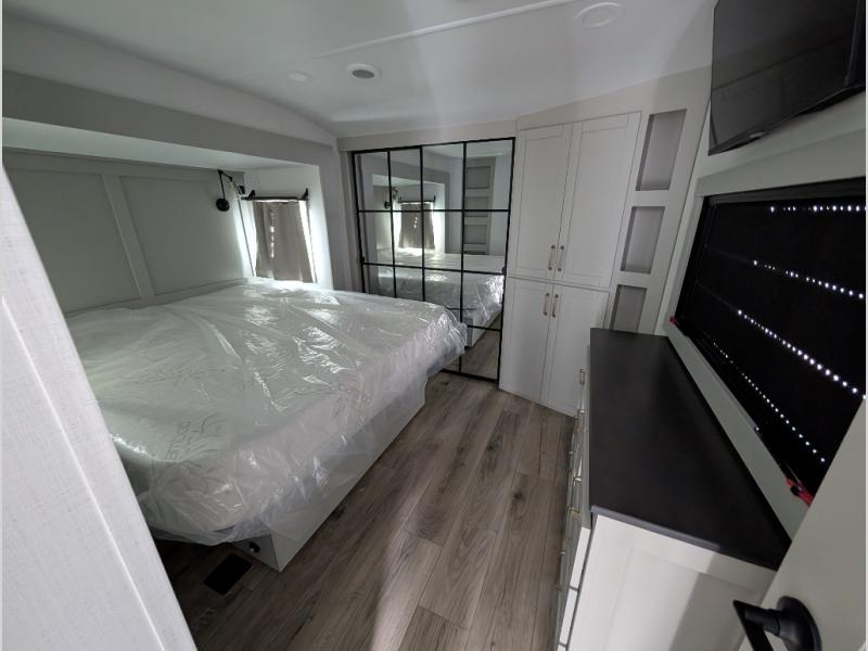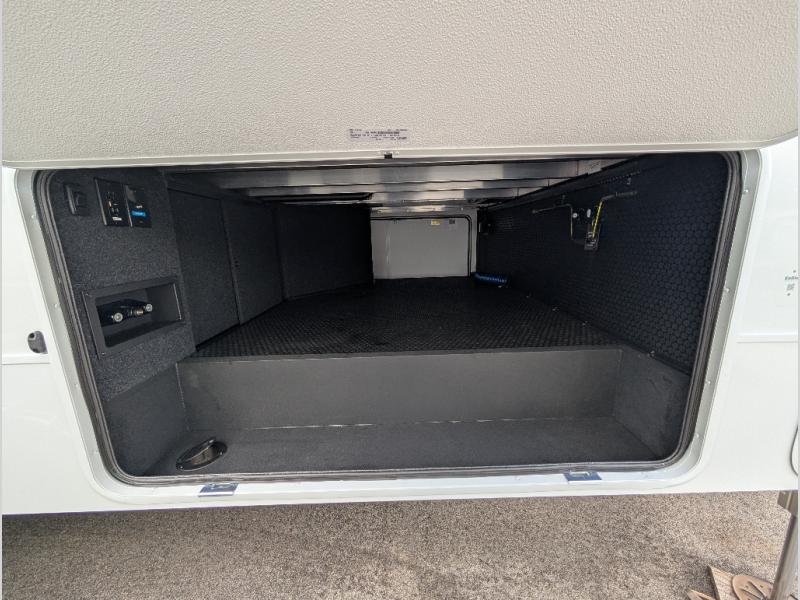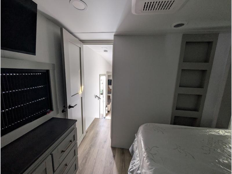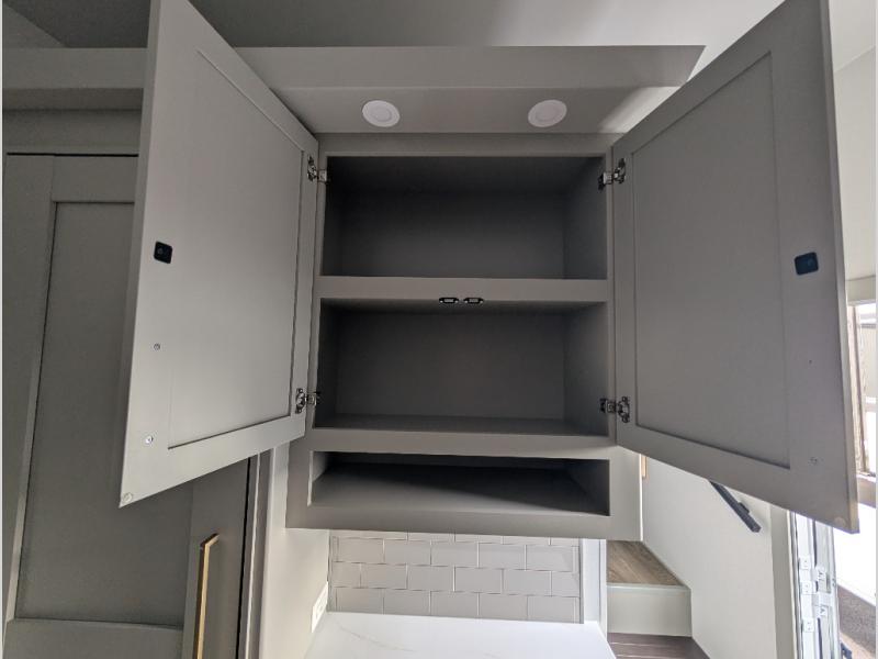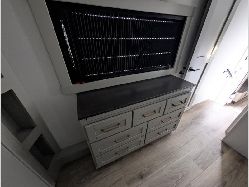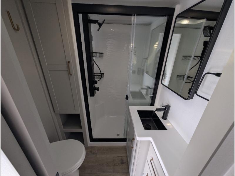 This Model Z luxury fifth wheel is bright and modern on the inside, with loads of amenities that will have you dreaming of your next trip! Enter and find a spacious combined living/kitchen space thanks to dual opposing slides. There is ample seating with a sliding desk/dining table, 62" theater seating, and a 72" tri-fold sofa along the rear wall. You can easily relax and enjoy the 50" Smart telescoping TV with a cozy fireplace below. The kitchen offers all that you need to prepare and cook meals just like home with a 16 cu. ft. refrigerator for your perishables, a 30" microwave oven, and three burner range top and oven. You will love the integrated spice rack, and the kitchen island all outfitted with dog bowls and double pull out trash bins with an integrated Stow 'N Go paper towel holder. There is also an 84" pantry with adjustable shelves for all of your canned and dry goods. Head up the steps to a private master suite with king bed slide. You can opt for the queen bed if you like. A sliding dresser top features hidden storage which is perfect for jewelry and other personal belongings. The front wardrobe features mirrored doors and the corner closet has been prepped for a stackable washer and dryer if you choose to add that option. Relax and enjoy a large bath featuring a linen cabinet, a 30" x 42" shower, and vanity with sink, plus medicine cabinet.