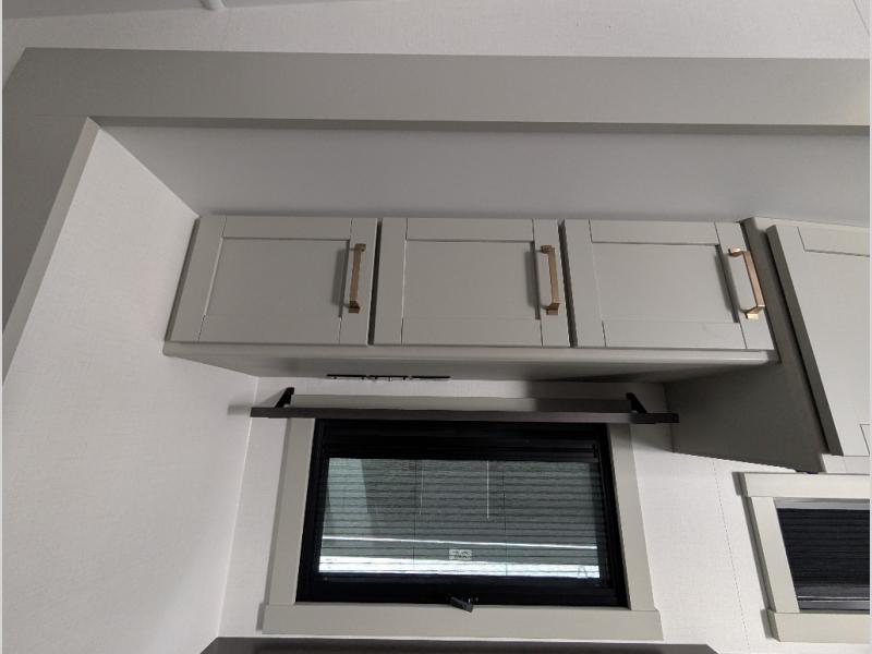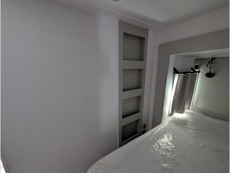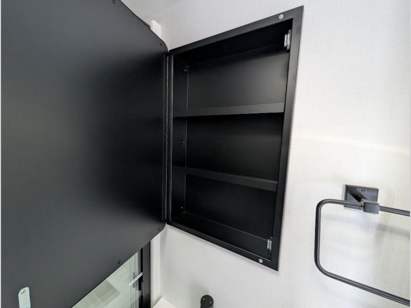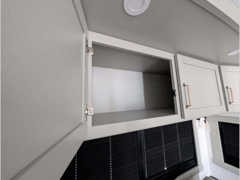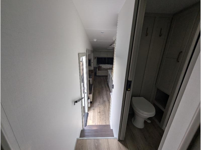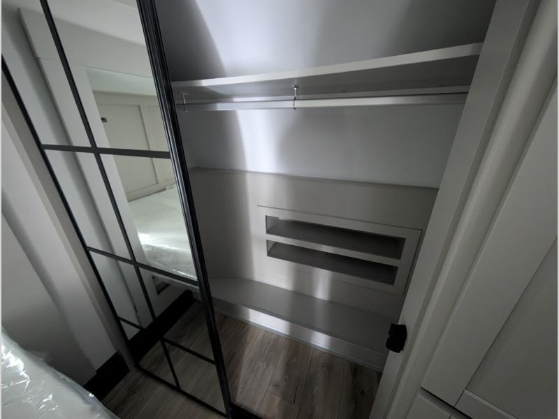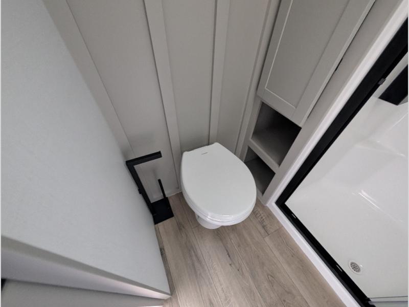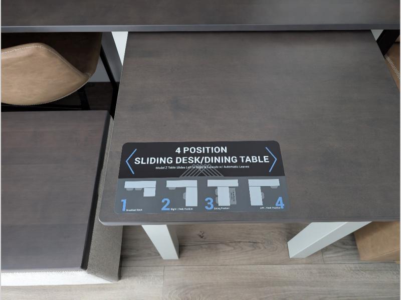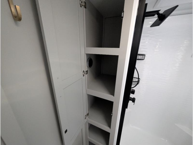 This Model Z luxury fifth wheel is bright and modern on the inside, with loads of amenities that will have you dreaming of your next trip! Enter and find a spacious combined living/kitchen space thanks to dual opposing slides. There is ample seating with a sliding desk/dining table, 62" theater seating, and a 72" tri-fold sofa along the rear wall. You can easily relax and enjoy the 50" Smart telescoping TV with a cozy fireplace below. The kitchen offers all that you need to prepare and cook meals just like home with a 16 cu. ft. refrigerator for your perishables, a 30" microwave oven, and three burner range top and oven. You will love the integrated spice rack, and the kitchen island all outfitted with dog bowls and double pull out trash bins with an integrated Stow 'N Go paper towel holder. There is also an 84" pantry with adjustable shelves for all of your canned and dry goods. Head up the steps to a private master suite with king bed slide. You can opt for the queen bed if you like. A sliding dresser top features hidden storage which is perfect for jewelry and other personal belongings. The front wardrobe features mirrored doors and the corner closet has been prepped for a stackable washer and dryer if you choose to add that option. Relax and enjoy a large bath featuring a linen cabinet, a 30" x 42" shower, and vanity with sink, plus medicine cabinet.