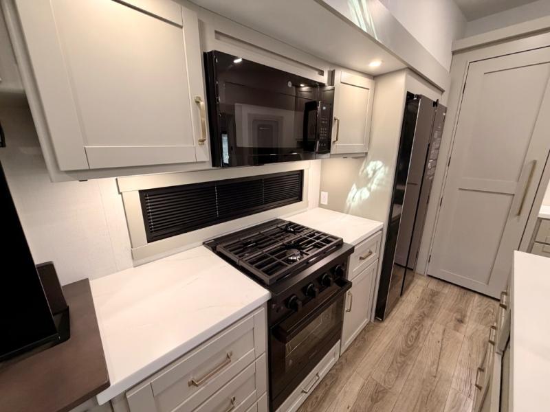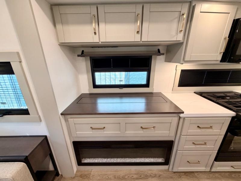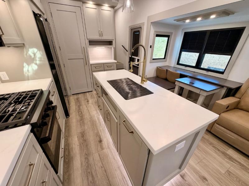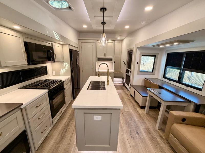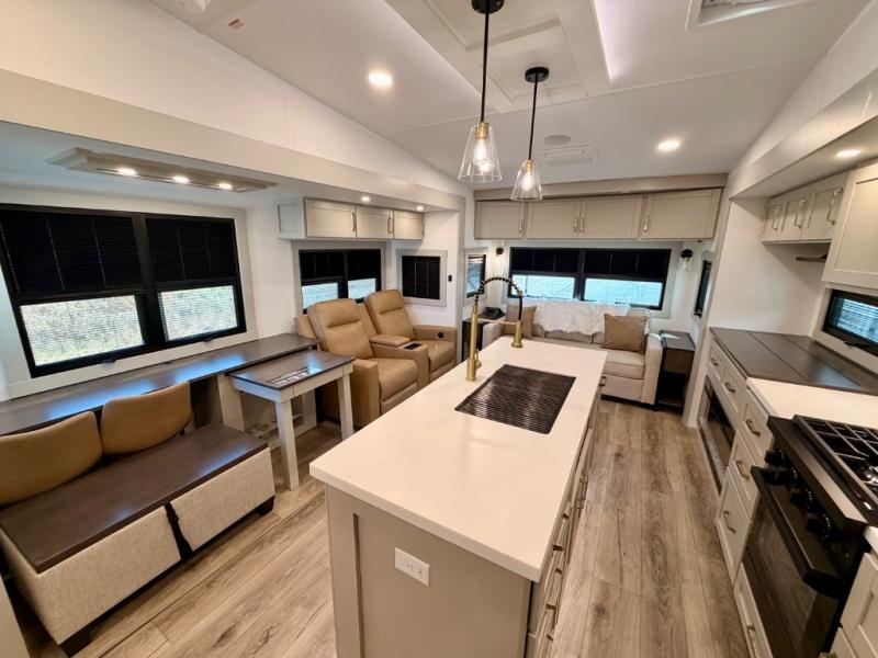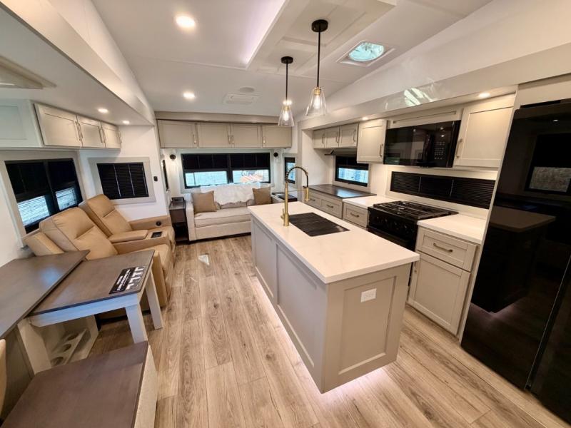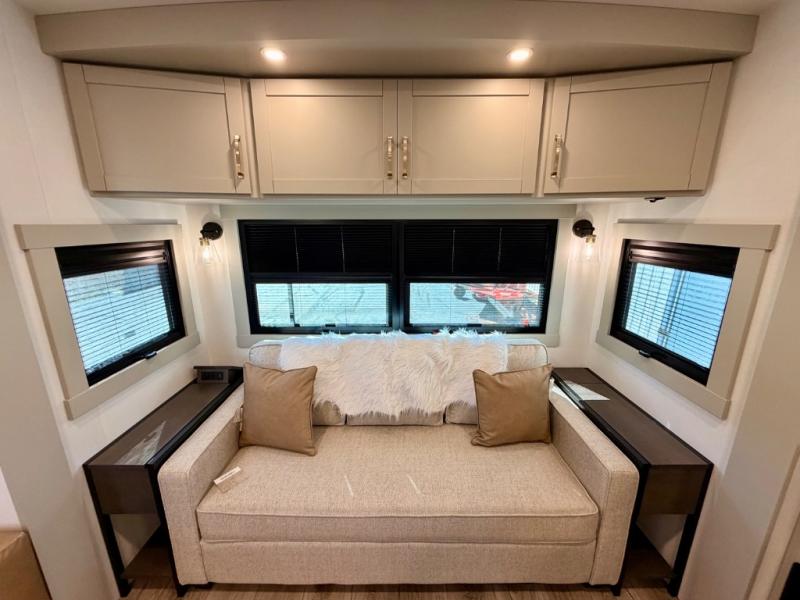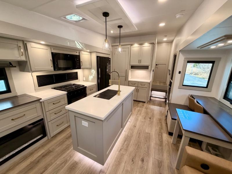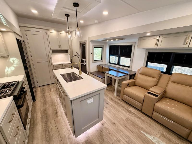 This Model Z luxury fifth wheel is bright and modern on the inside, with loads of amenities that will have you dreaming of your next trip! Enter and find a spacious combined living/kitchen space thanks to dual opposing slides. There is ample seating with a sliding desk/dining table, 62" theater seating, and a 72" tri-fold sofa along the rear wall. You can easily relax and enjoy the 50" Smart telescoping TV with a cozy fireplace below. The kitchen offers all that you need to prepare and cook meals just like home with a 16 cu. ft. refrigerator for your perishables, a 30" microwave oven, and three burner range top and oven. You will love the integrated spice rack, and the kitchen island all outfitted with dog bowls and double pull out trash bins with an integrated Stow 'N Go paper towel holder. There is also an 84" pantry with adjustable shelves for all of your canned and dry goods. Head up the steps to a private master suite with king bed slide. You can opt for the queen bed if you like. A sliding dresser top features hidden storage which is perfect for jewelry and other personal belongings. The front wardrobe features mirrored doors and the corner closet has been prepped for a stackable washer and dryer if you choose to add that option. Relax and enjoy a large bath featuring a linen cabinet, a 30" x 42" shower, and vanity with sink, plus medicine cabinet.