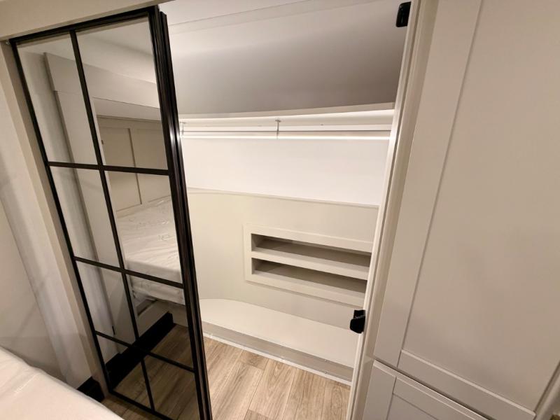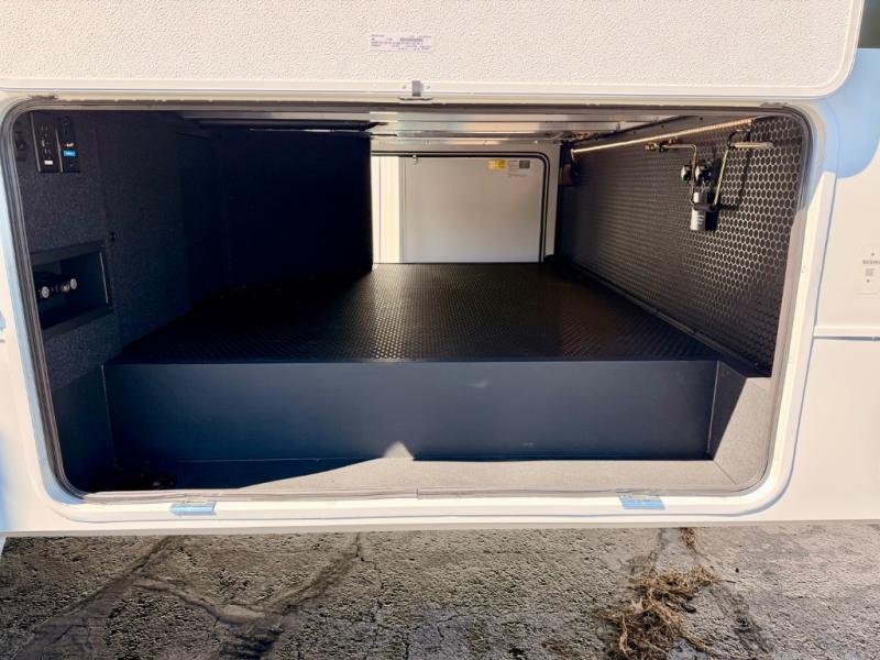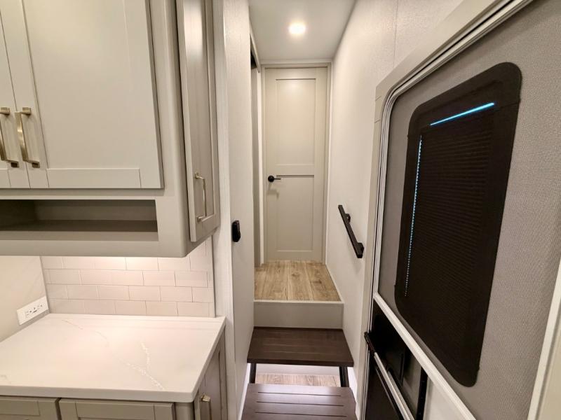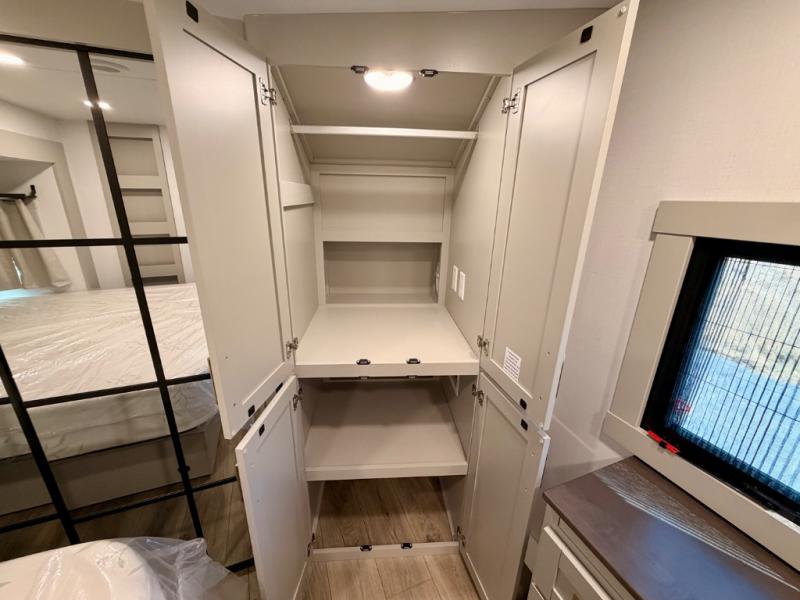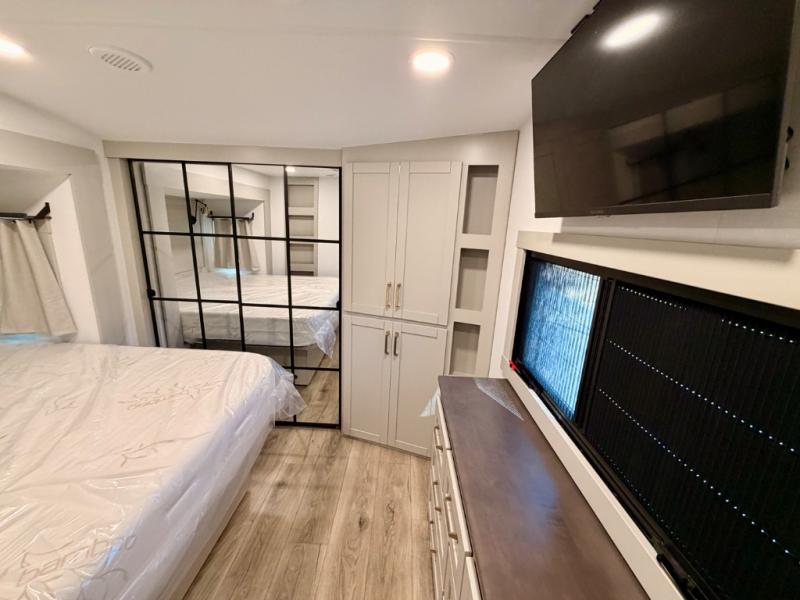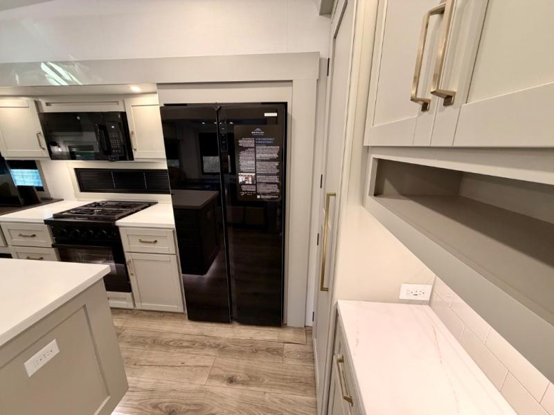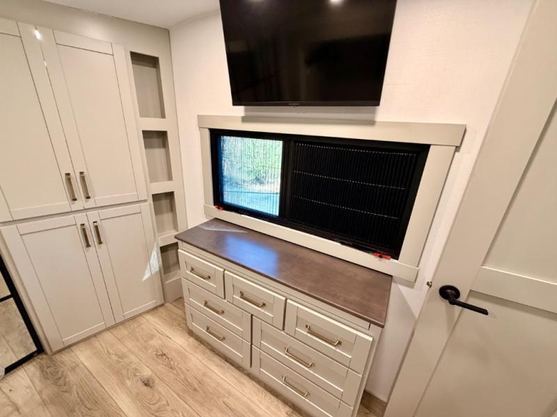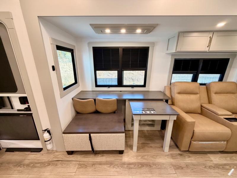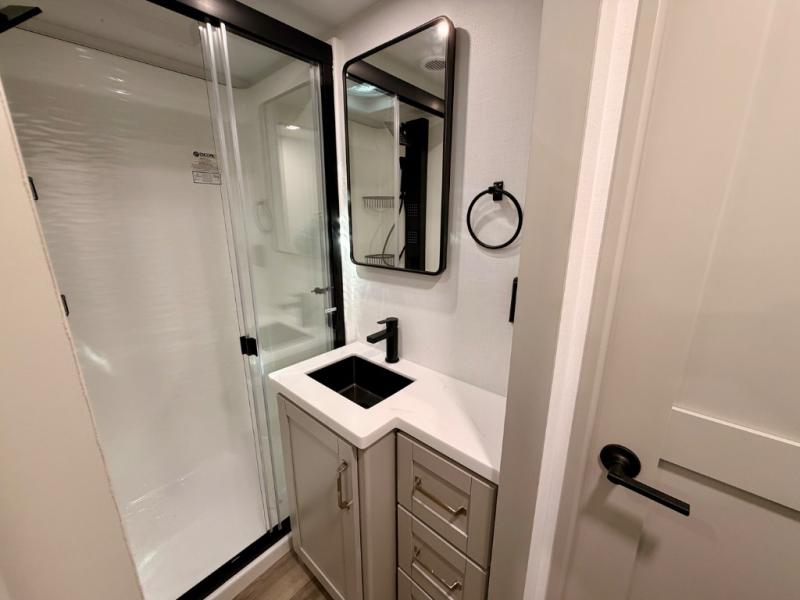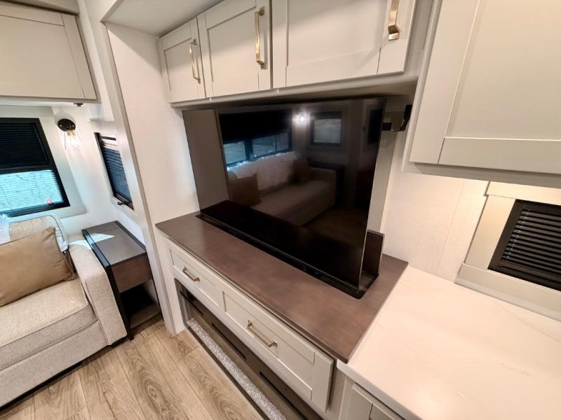This Model Z luxury fifth wheel is bright and modern on the inside, with loads of amenities that will have you dreaming of your next trip! Enter and find a spacious combined living/kitchen space thanks to dual opposing slides. There is ample seating with a sliding desk/dining table, 62" theater seating, and a 72" tri-fold sofa along the rear wall. You can easily relax and enjoy the 50" Smart telescoping TV with a cozy fireplace below. The kitchen offers all that you need to prepare and cook meals just like home with a 16 cu. ft. refrigerator for your perishables, a 30" microwave oven, and three burner range top and oven. You will love the integrated spice rack, and the kitchen island all outfitted with dog bowls and double pull out trash bins with an integrated Stow 'N Go paper towel holder. There is also an 84" pantry with adjustable shelves for all of your canned and dry goods. Head up the steps to a private master suite with king bed slide. You can opt for the queen bed if you like. A sliding dresser top features hidden storage which is perfect for jewelry and other personal belongings. The front wardrobe features mirrored doors and the corner closet has been prepped for a stackable washer and dryer if you choose to add that option. Relax and enjoy a large bath featuring a linen cabinet, a 30" x 42" shower, and vanity with sink, plus medicine cabinet.