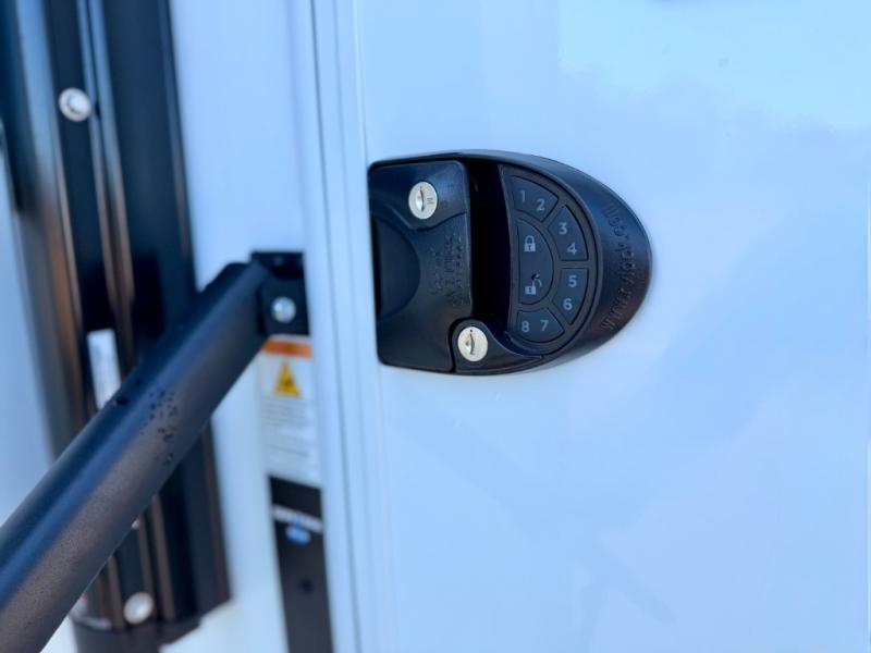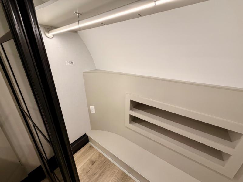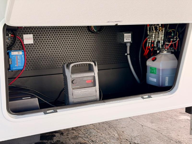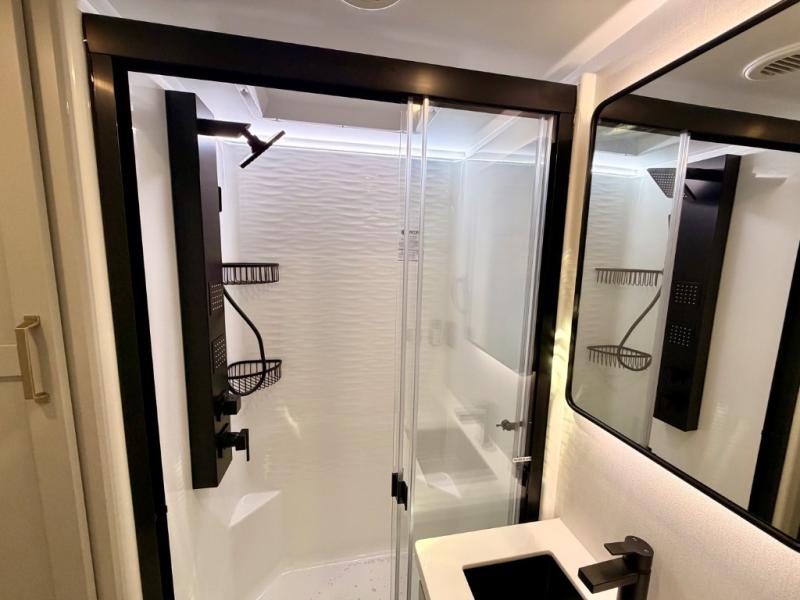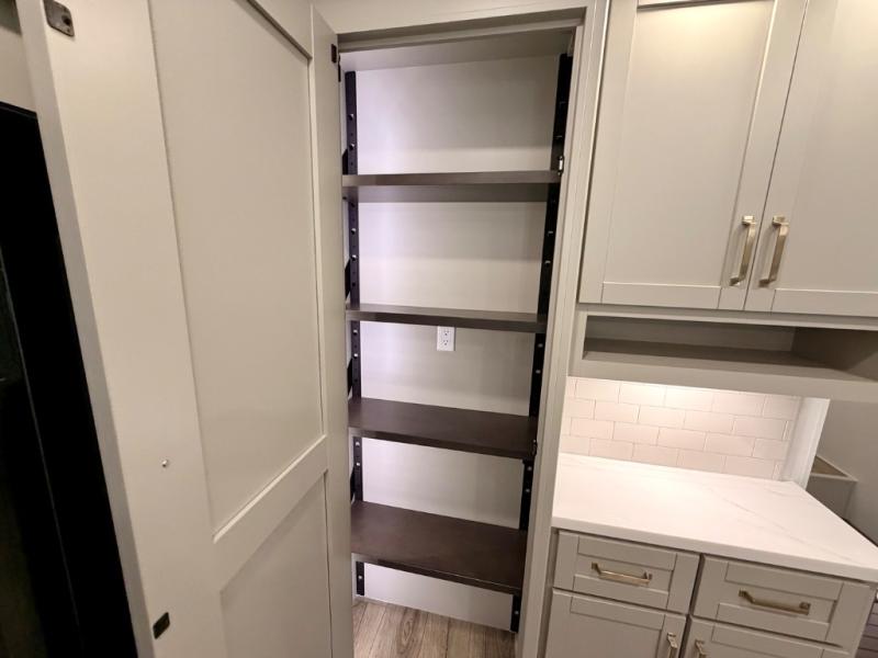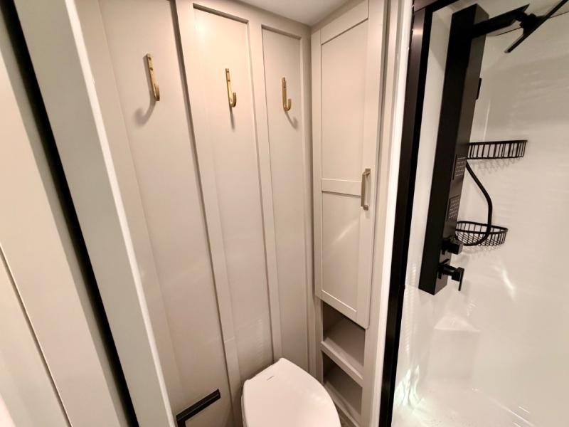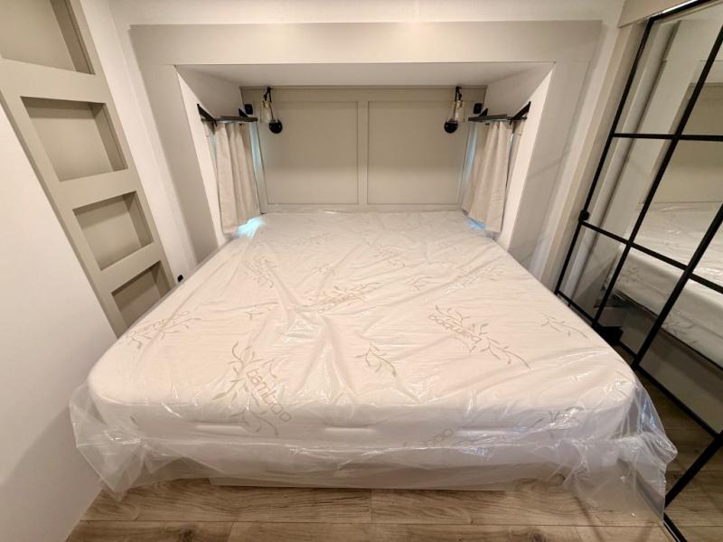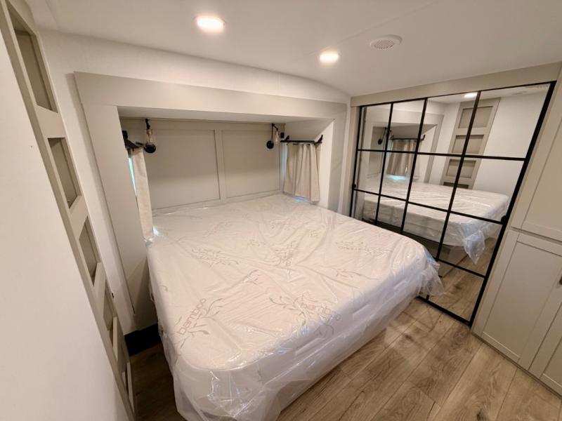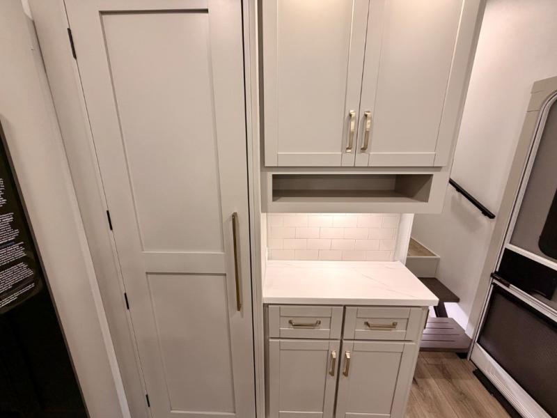This Model Z luxury fifth wheel is bright and modern on the inside, with loads of amenities that will have you dreaming of your next trip! Enter and find a spacious combined living/kitchen space thanks to dual opposing slides. There is ample seating with a sliding desk/dining table, 62" theater seating, and a 72" tri-fold sofa along the rear wall. You can easily relax and enjoy the 50" Smart telescoping TV with a cozy fireplace below. The kitchen offers all that you need to prepare and cook meals just like home with a 16 cu. ft. refrigerator for your perishables, a 30" microwave oven, and three burner range top and oven. You will love the integrated spice rack, and the kitchen island all outfitted with dog bowls and double pull out trash bins with an integrated Stow 'N Go paper towel holder. There is also an 84" pantry with adjustable shelves for all of your canned and dry goods. Head up the steps to a private master suite with king bed slide. You can opt for the queen bed if you like. A sliding dresser top features hidden storage which is perfect for jewelry and other personal belongings. The front wardrobe features mirrored doors and the corner closet has been prepped for a stackable washer and dryer if you choose to add that option. Relax and enjoy a large bath featuring a linen cabinet, a 30" x 42" shower, and vanity with sink, plus medicine cabinet.