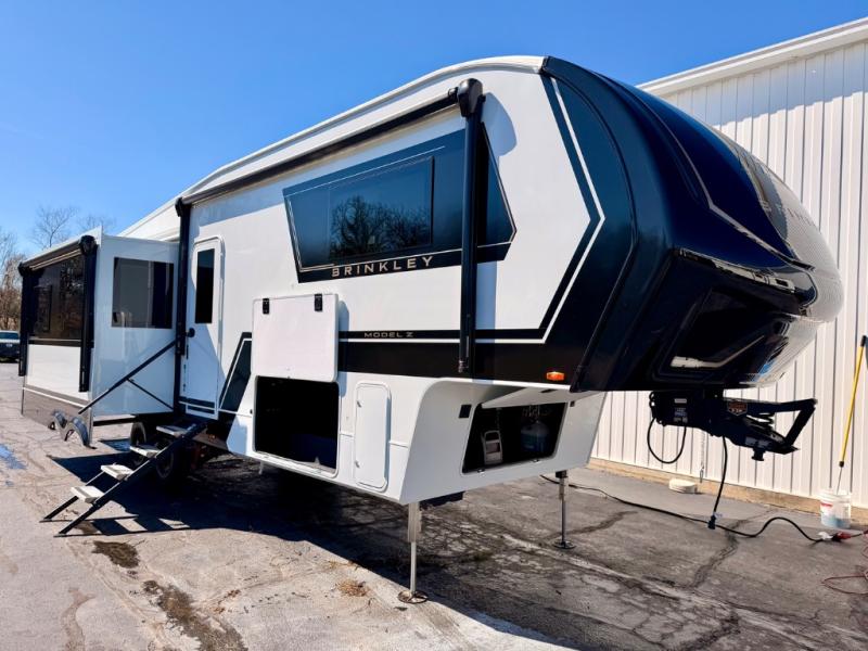 The Brinkley mid-profile Model Z fifth wheels bring you clean lines and an upscale look with plenty of style and exciting new features like the industry first brass plumbing connections. These units also feature an automotive grade front cap, plenty of exterior storage, dual exterior hot and cold showers, and wide stance leveling jacks for easy set up. Residential frameless windows provide a clean look and beautiful views, and ample electrical outlets and 6 USB/USB-C outlets allow all of your electronics and appliances to easily be used and charged.