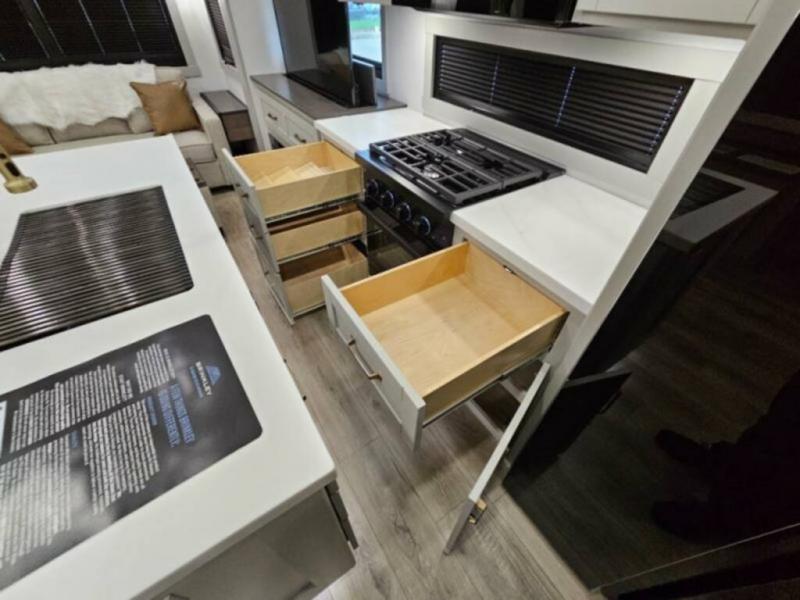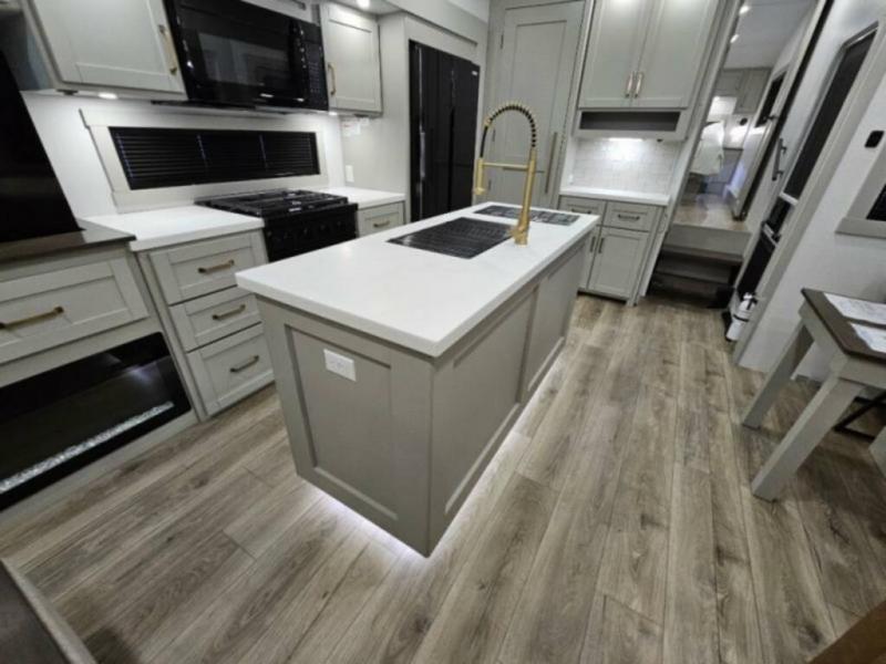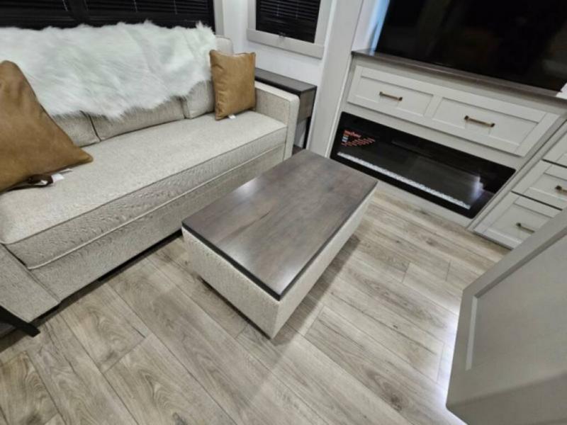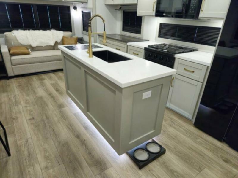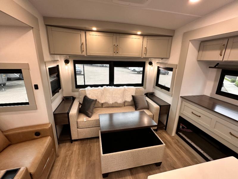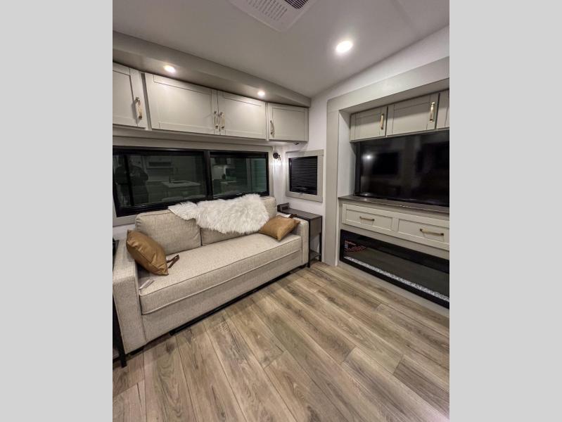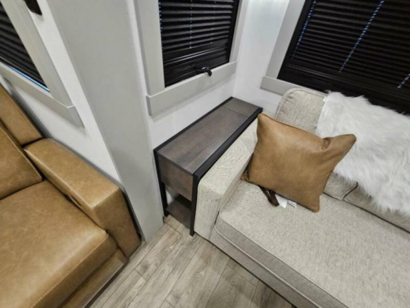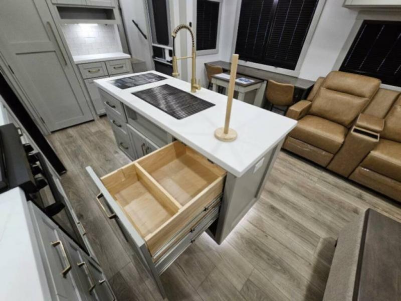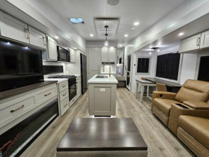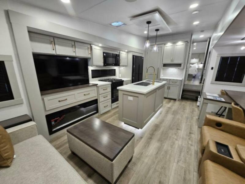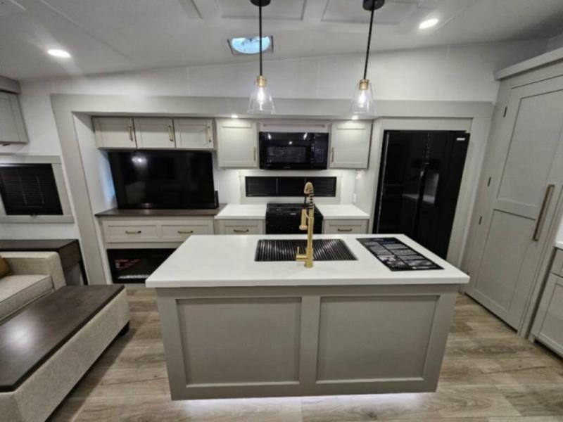 This Model Z luxury fifth wheel is bright and modern on the inside, with loads of amenities that will have you dreaming of your next trip! Enter and find a spacious combined living/kitchen space thanks to dual opposing slides. There is ample seating with a sliding desk/dining table, 62" theater seating, and a 72" tri-fold sofa along the rear wall. You can easily relax and enjoy the 50" Smart telescoping TV with a cozy fireplace below. The kitchen offers all that you need to prepare and cook meals just like home with a 16 cu. ft. refrigerator for your perishables, a 30" microwave oven, and three burner range top and oven. You will love the integrated spice rack, and the kitchen island all outfitted with dog bowls and double pull out trash bins with an integrated Stow 'N Go paper towel holder. There is also an 84" pantry with adjustable shelves for all of your canned and dry goods. Head up the steps to a private master suite with king bed slide. You can opt for the queen bed if you like. A sliding dresser top features hidden storage which is perfect for jewelry and other personal belongings. The front wardrobe features mirrored doors and the corner closet has been prepped for a stackable washer and dryer if you choose to add that option. Relax and enjoy a large bath featuring a linen cabinet, a 30" x 42" shower, and vanity with sink, plus medicine cabinet.