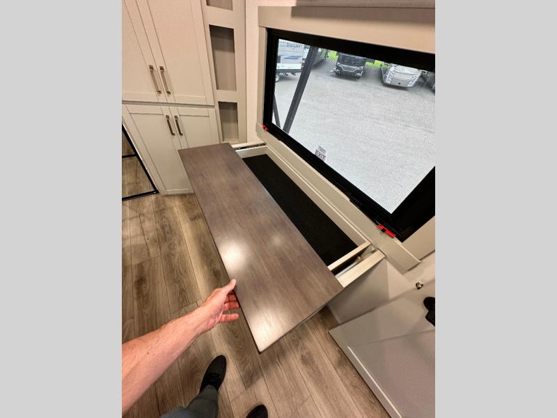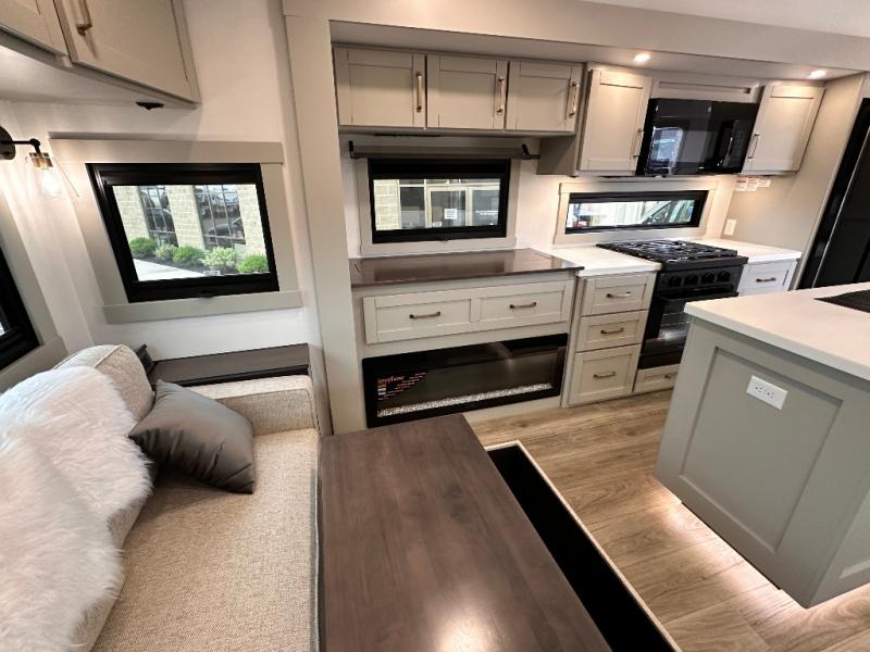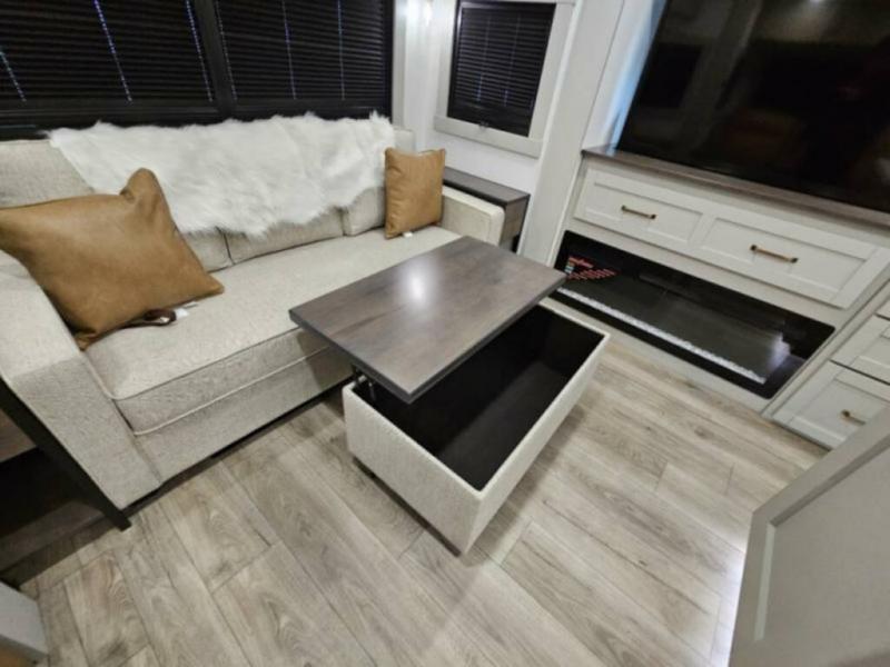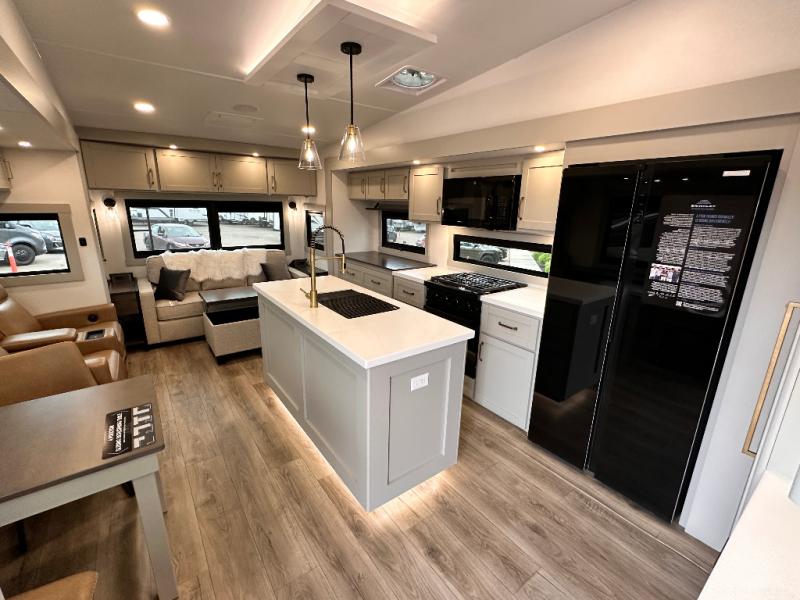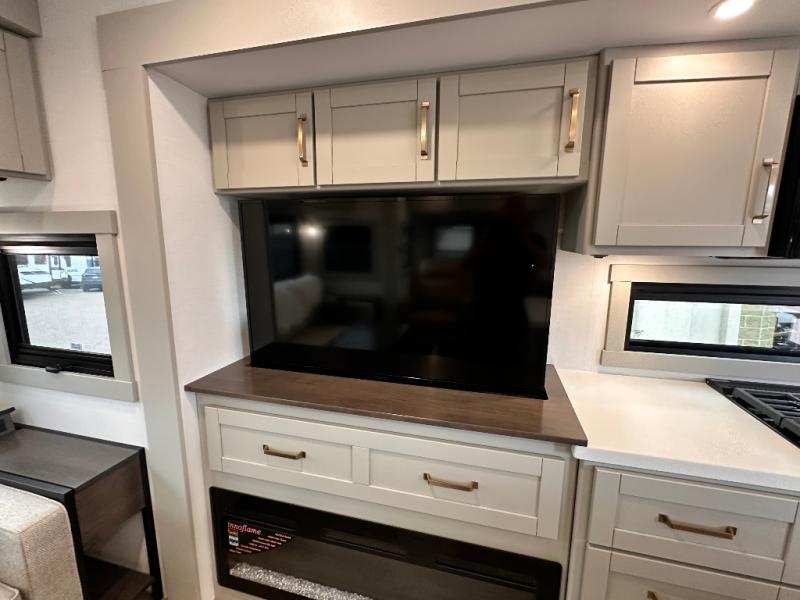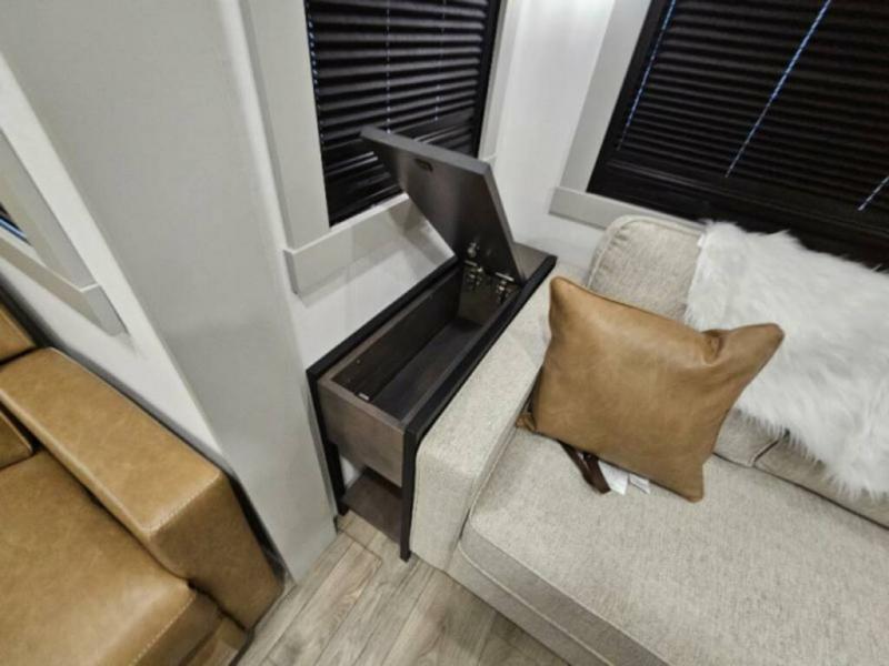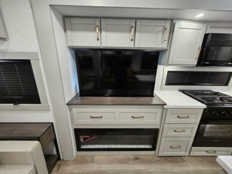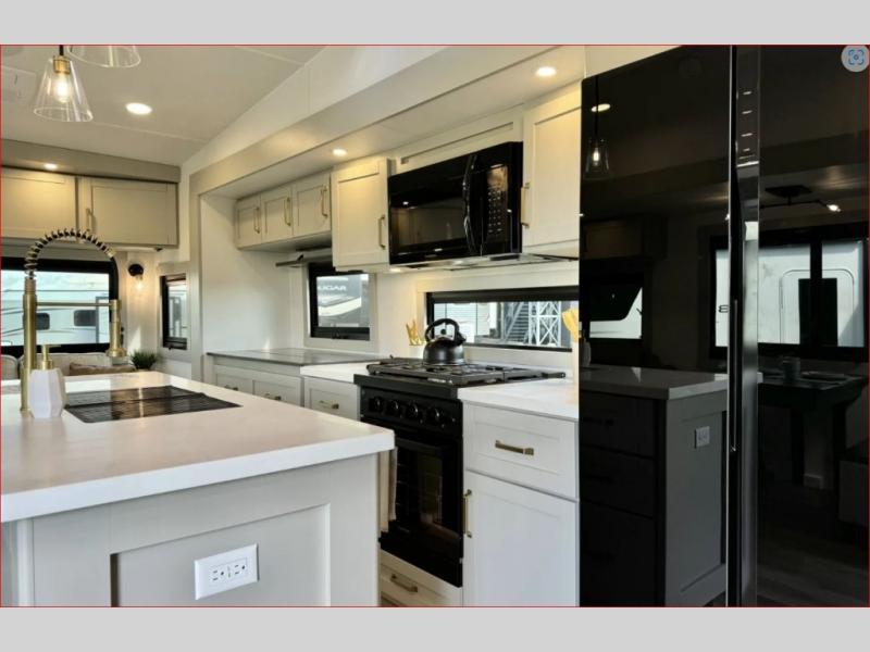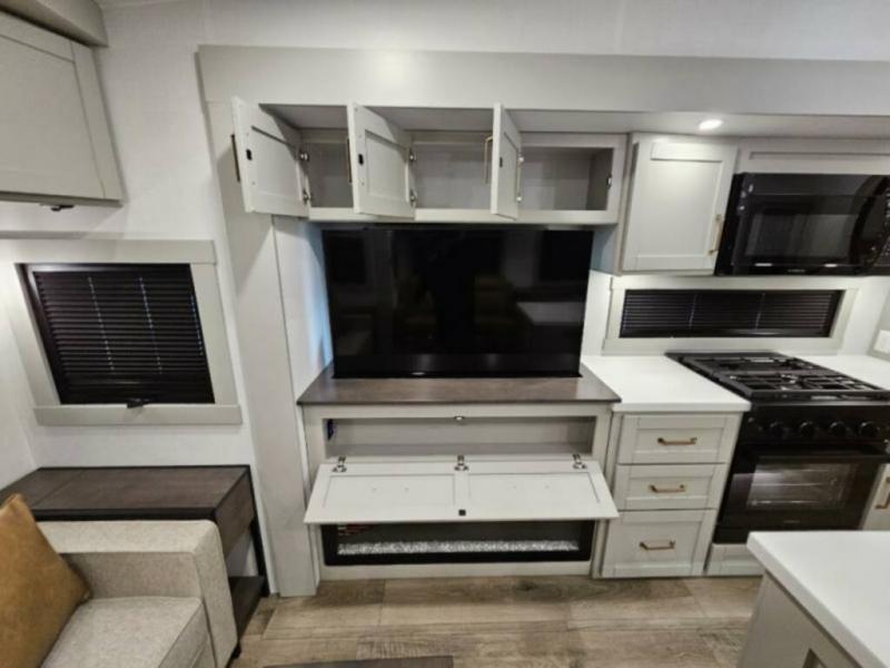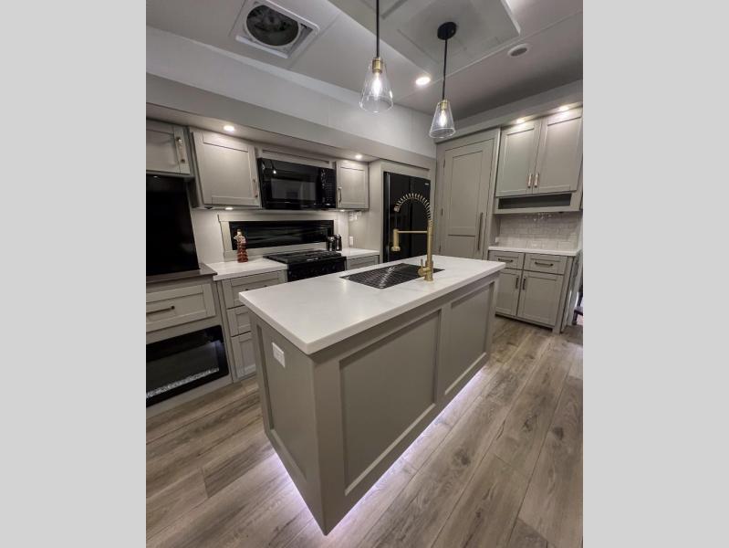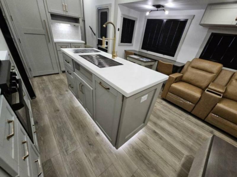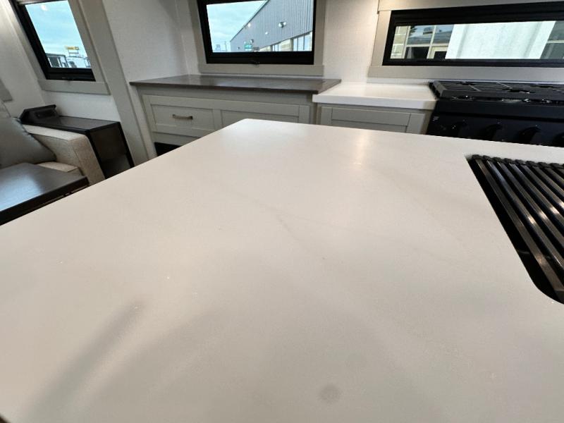 This Model Z luxury fifth wheel is bright and modern on the inside, with loads of amenities that will have you dreaming of your next trip! Enter and find a spacious combined living/kitchen space thanks to dual opposing slides. There is ample seating with a sliding desk/dining table, 62" theater seating, and a 72" tri-fold sofa along the rear wall. You can easily relax and enjoy the 50" Smart telescoping TV with a cozy fireplace below. The kitchen offers all that you need to prepare and cook meals just like home with a 16 cu. ft. refrigerator for your perishables, a 30" microwave oven, and three burner range top and oven. You will love the integrated spice rack, and the kitchen island all outfitted with dog bowls and double pull out trash bins with an integrated Stow 'N Go paper towel holder. There is also an 84" pantry with adjustable shelves for all of your canned and dry goods. Head up the steps to a private master suite with king bed slide. You can opt for the queen bed if you like. A sliding dresser top features hidden storage which is perfect for jewelry and other personal belongings. The front wardrobe features mirrored doors and the corner closet has been prepped for a stackable washer and dryer if you choose to add that option. Relax and enjoy a large bath featuring a linen cabinet, a 30" x 42" shower, and vanity with sink, plus medicine cabinet.