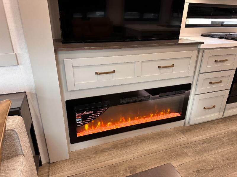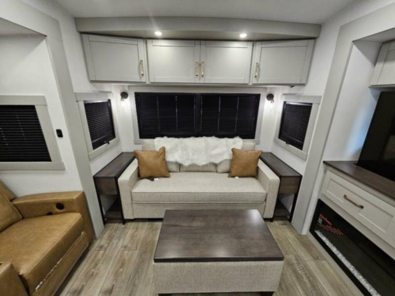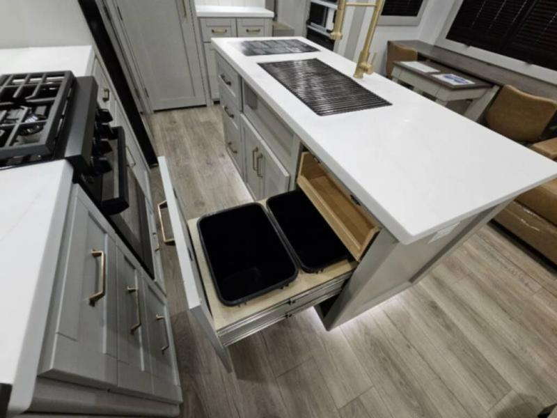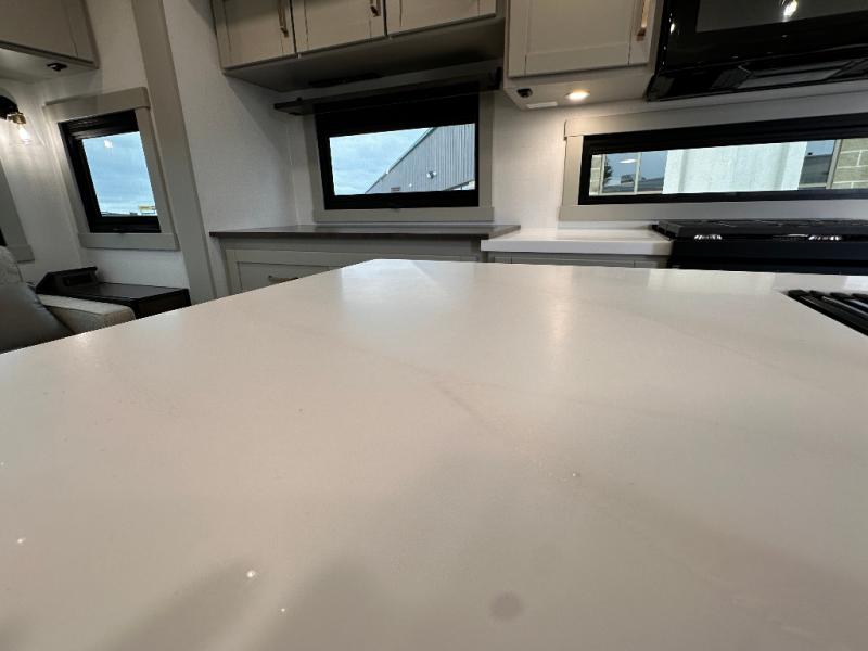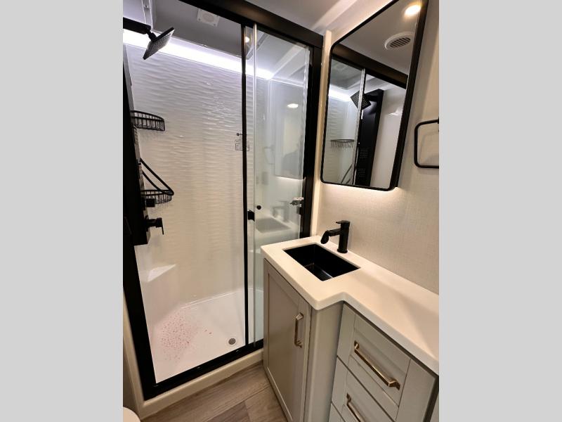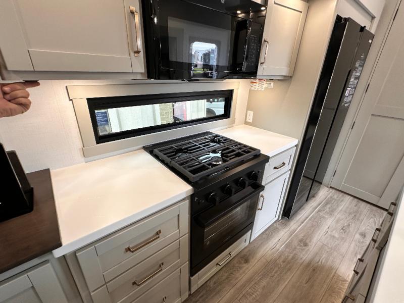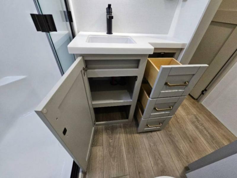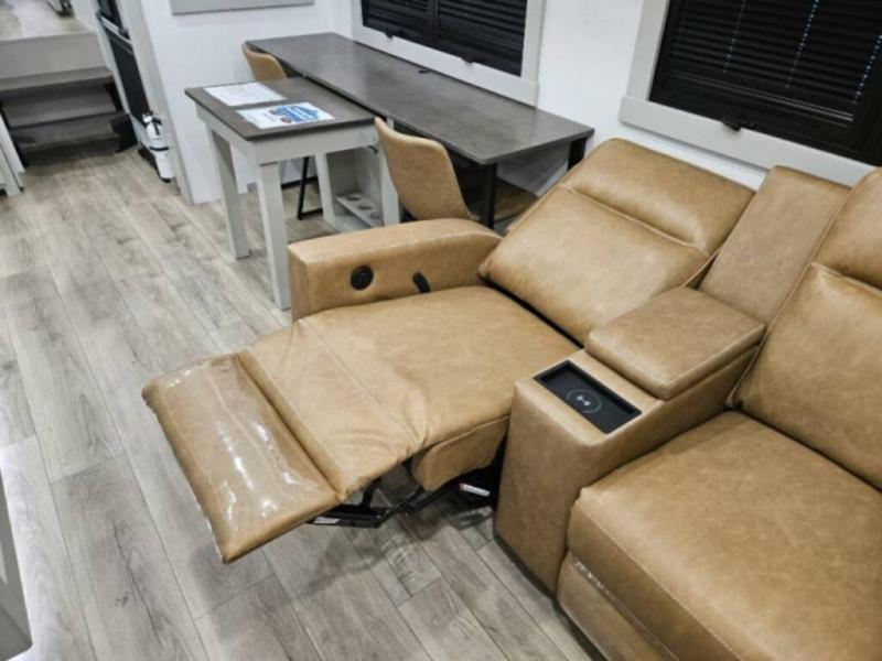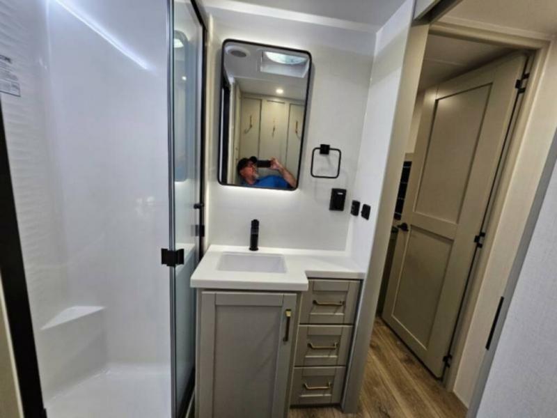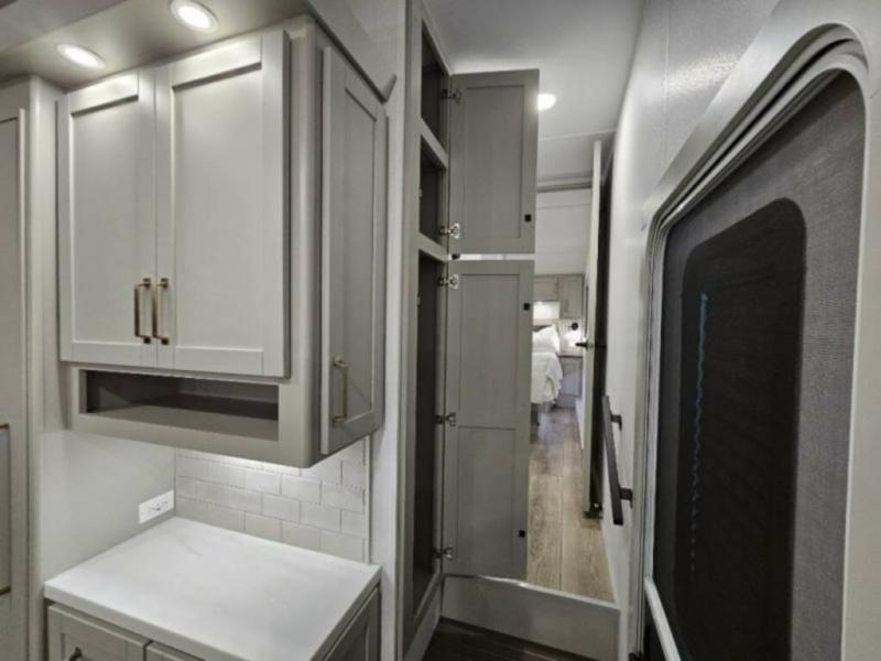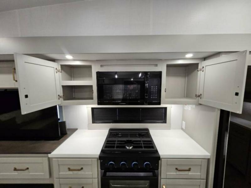 This Model Z luxury fifth wheel is bright and modern on the inside, with loads of amenities that will have you dreaming of your next trip! Enter and find a spacious combined living/kitchen space thanks to dual opposing slides. There is ample seating with a sliding desk/dining table, 62" theater seating, and a 72" tri-fold sofa along the rear wall. You can easily relax and enjoy the 50" Smart telescoping TV with a cozy fireplace below. The kitchen offers all that you need to prepare and cook meals just like home with a 16 cu. ft. refrigerator for your perishables, a 30" microwave oven, and three burner range top and oven. You will love the integrated spice rack, and the kitchen island all outfitted with dog bowls and double pull out trash bins with an integrated Stow 'N Go paper towel holder. There is also an 84" pantry with adjustable shelves for all of your canned and dry goods. Head up the steps to a private master suite with king bed slide. You can opt for the queen bed if you like. A sliding dresser top features hidden storage which is perfect for jewelry and other personal belongings. The front wardrobe features mirrored doors and the corner closet has been prepped for a stackable washer and dryer if you choose to add that option. Relax and enjoy a large bath featuring a linen cabinet, a 30" x 42" shower, and vanity with sink, plus medicine cabinet.