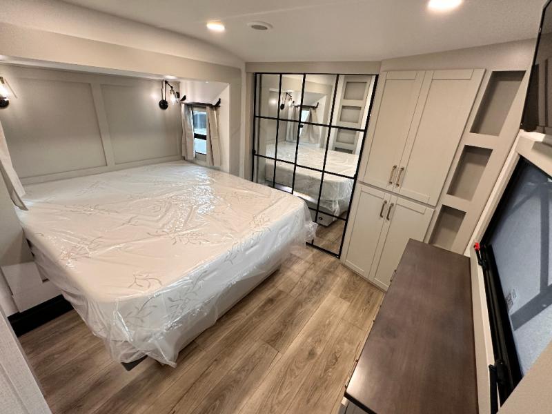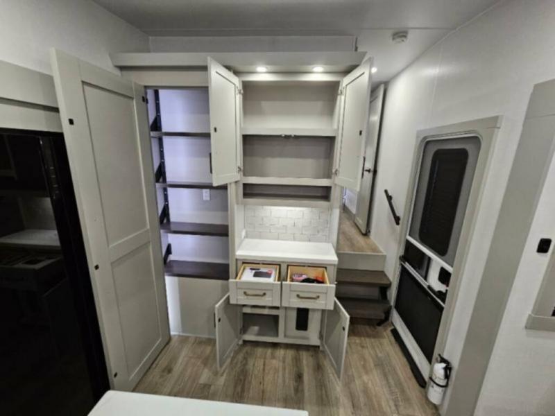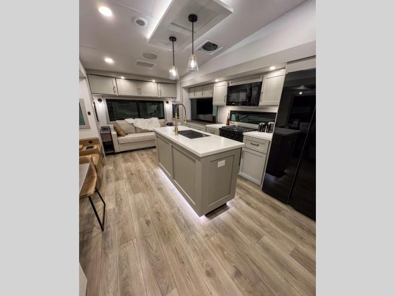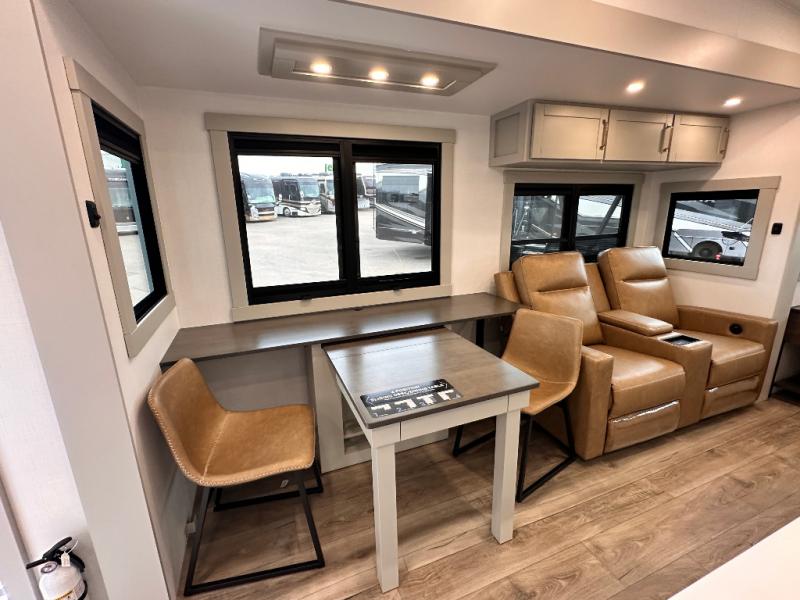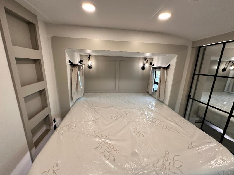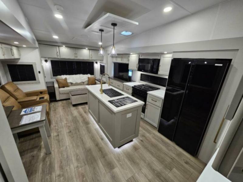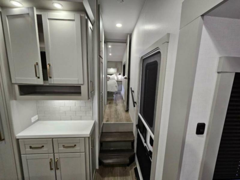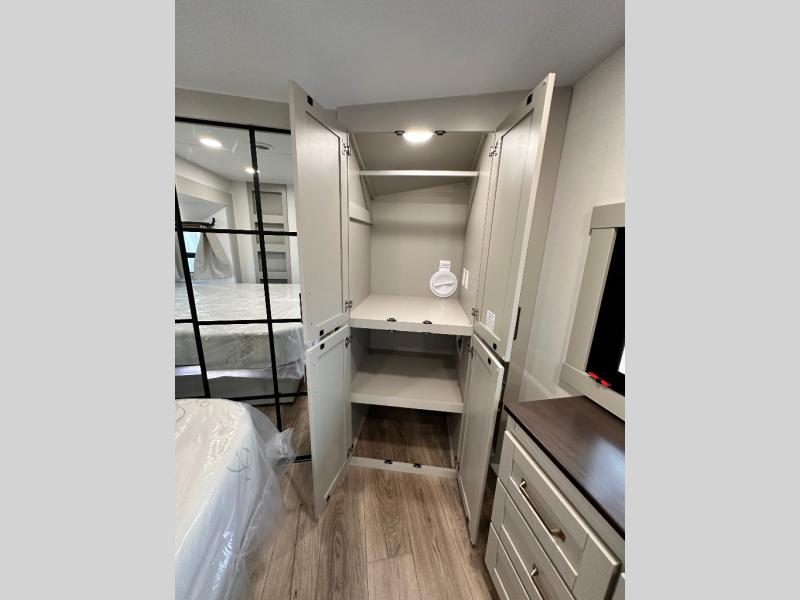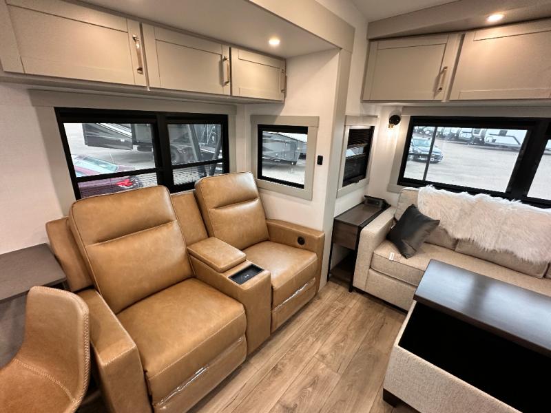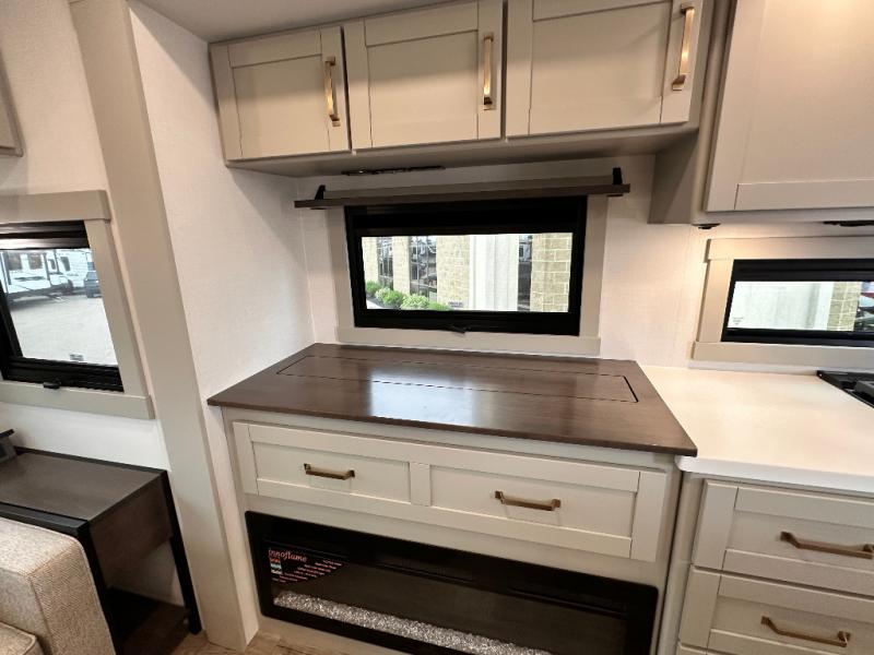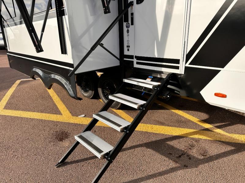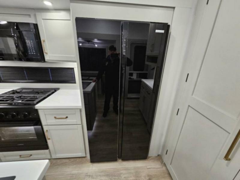 This Model Z luxury fifth wheel is bright and modern on the inside, with loads of amenities that will have you dreaming of your next trip! Enter and find a spacious combined living/kitchen space thanks to dual opposing slides. There is ample seating with a sliding desk/dining table, 62" theater seating, and a 72" tri-fold sofa along the rear wall. You can easily relax and enjoy the 50" Smart telescoping TV with a cozy fireplace below. The kitchen offers all that you need to prepare and cook meals just like home with a 16 cu. ft. refrigerator for your perishables, a 30" microwave oven, and three burner range top and oven. You will love the integrated spice rack, and the kitchen island all outfitted with dog bowls and double pull out trash bins with an integrated Stow 'N Go paper towel holder. There is also an 84" pantry with adjustable shelves for all of your canned and dry goods. Head up the steps to a private master suite with king bed slide. You can opt for the queen bed if you like. A sliding dresser top features hidden storage which is perfect for jewelry and other personal belongings. The front wardrobe features mirrored doors and the corner closet has been prepped for a stackable washer and dryer if you choose to add that option. Relax and enjoy a large bath featuring a linen cabinet, a 30" x 42" shower, and vanity with sink, plus medicine cabinet.