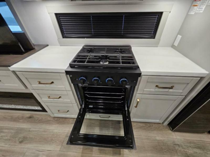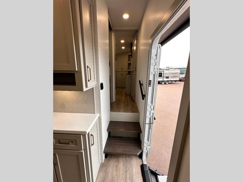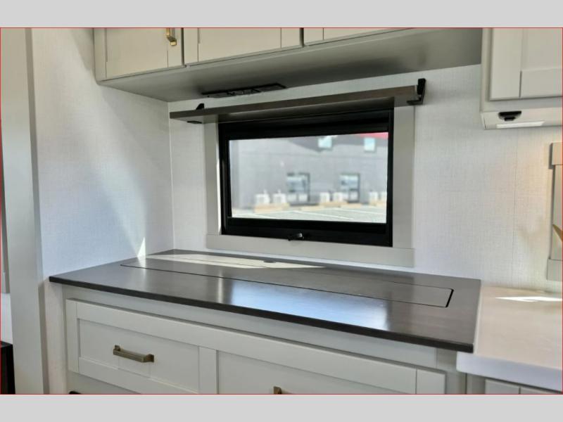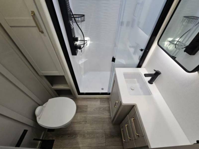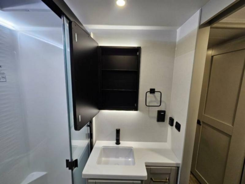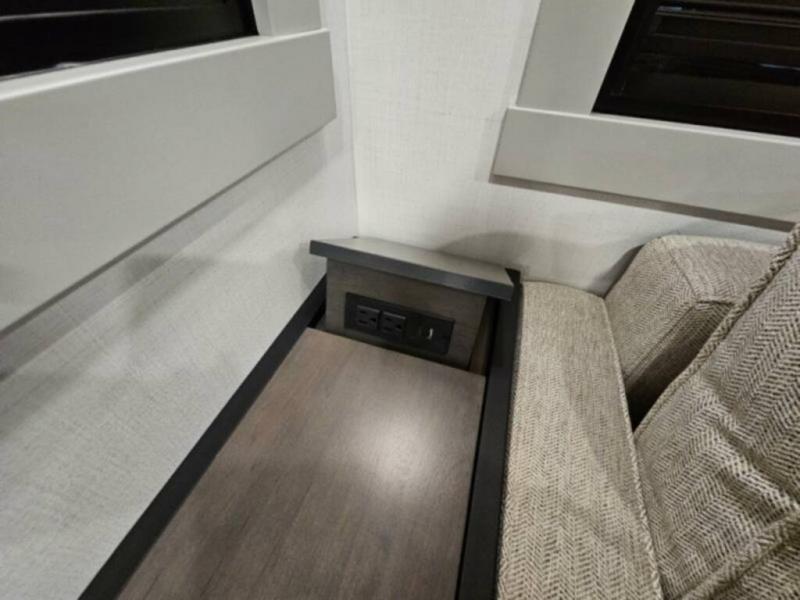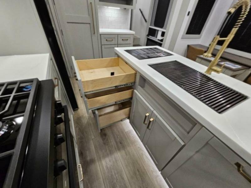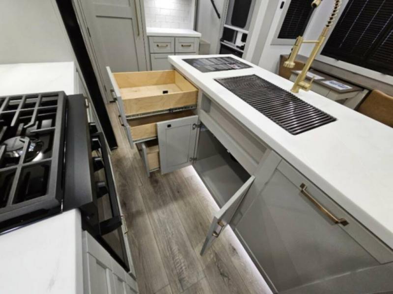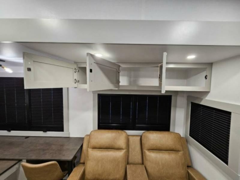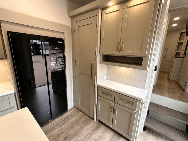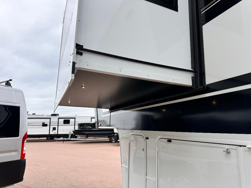 This Model Z luxury fifth wheel is bright and modern on the inside, with loads of amenities that will have you dreaming of your next trip! Enter and find a spacious combined living/kitchen space thanks to dual opposing slides. There is ample seating with a sliding desk/dining table, 62" theater seating, and a 72" tri-fold sofa along the rear wall. You can easily relax and enjoy the 50" Smart telescoping TV with a cozy fireplace below. The kitchen offers all that you need to prepare and cook meals just like home with a 16 cu. ft. refrigerator for your perishables, a 30" microwave oven, and three burner range top and oven. You will love the integrated spice rack, and the kitchen island all outfitted with dog bowls and double pull out trash bins with an integrated Stow 'N Go paper towel holder. There is also an 84" pantry with adjustable shelves for all of your canned and dry goods. Head up the steps to a private master suite with king bed slide. You can opt for the queen bed if you like. A sliding dresser top features hidden storage which is perfect for jewelry and other personal belongings. The front wardrobe features mirrored doors and the corner closet has been prepped for a stackable washer and dryer if you choose to add that option. Relax and enjoy a large bath featuring a linen cabinet, a 30" x 42" shower, and vanity with sink, plus medicine cabinet.