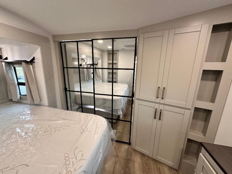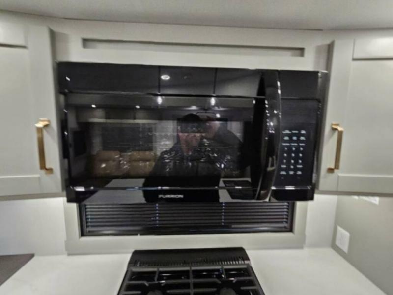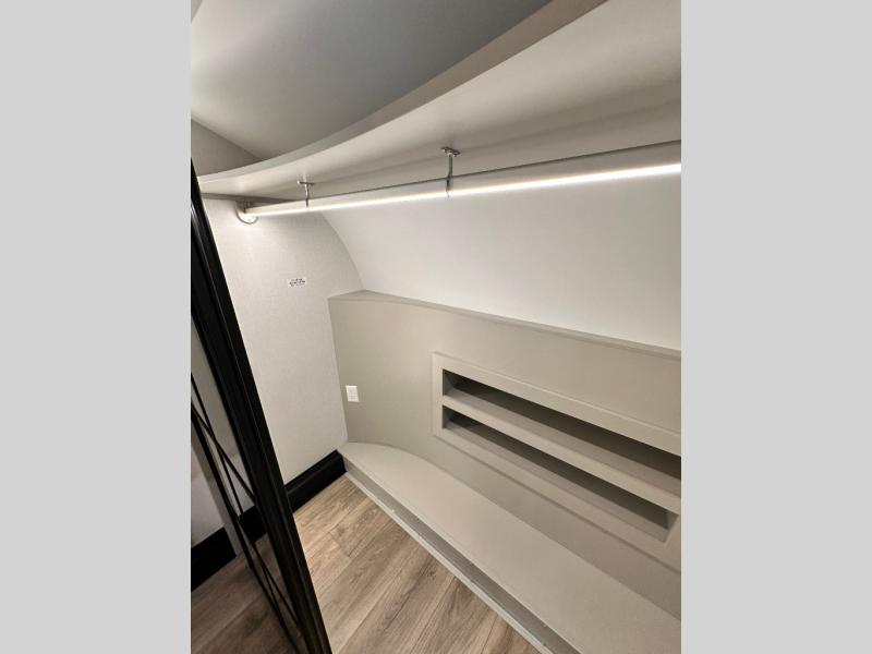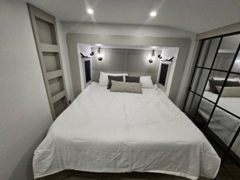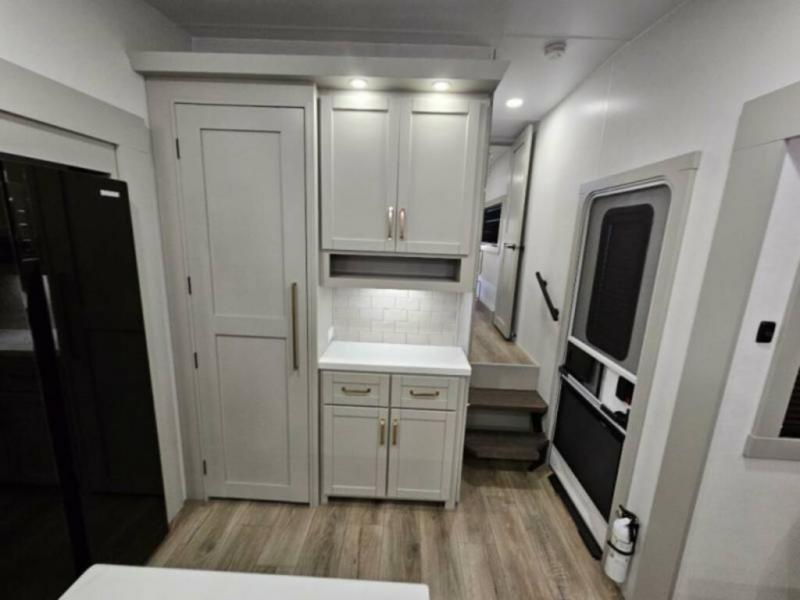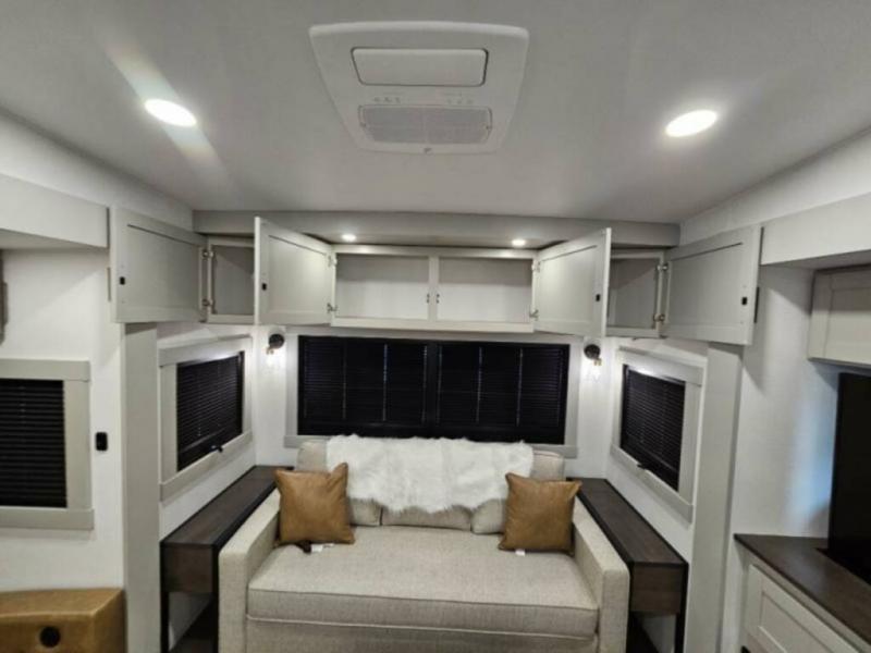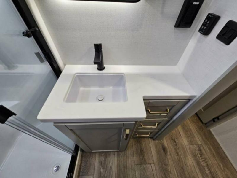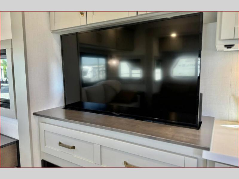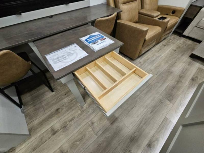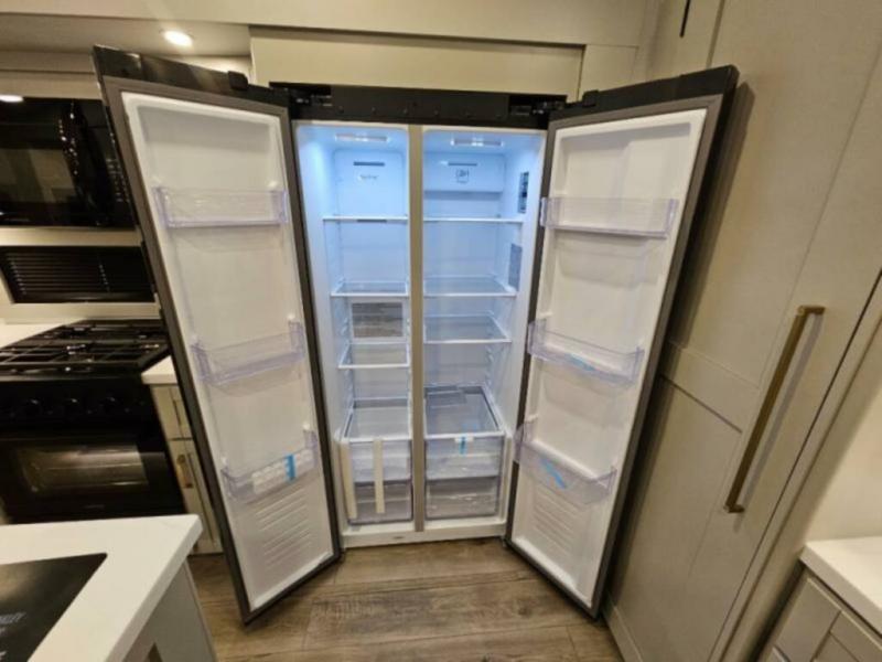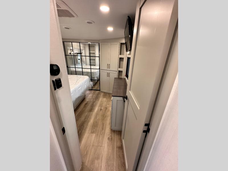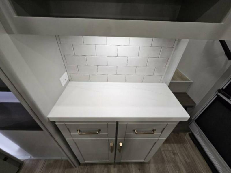 This Model Z luxury fifth wheel is bright and modern on the inside, with loads of amenities that will have you dreaming of your next trip! Enter and find a spacious combined living/kitchen space thanks to dual opposing slides. There is ample seating with a sliding desk/dining table, 62" theater seating, and a 72" tri-fold sofa along the rear wall. You can easily relax and enjoy the 50" Smart telescoping TV with a cozy fireplace below. The kitchen offers all that you need to prepare and cook meals just like home with a 16 cu. ft. refrigerator for your perishables, a 30" microwave oven, and three burner range top and oven. You will love the integrated spice rack, and the kitchen island all outfitted with dog bowls and double pull out trash bins with an integrated Stow 'N Go paper towel holder. There is also an 84" pantry with adjustable shelves for all of your canned and dry goods. Head up the steps to a private master suite with king bed slide. You can opt for the queen bed if you like. A sliding dresser top features hidden storage which is perfect for jewelry and other personal belongings. The front wardrobe features mirrored doors and the corner closet has been prepped for a stackable washer and dryer if you choose to add that option. Relax and enjoy a large bath featuring a linen cabinet, a 30" x 42" shower, and vanity with sink, plus medicine cabinet.