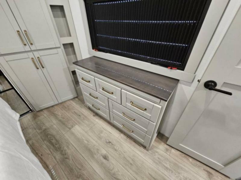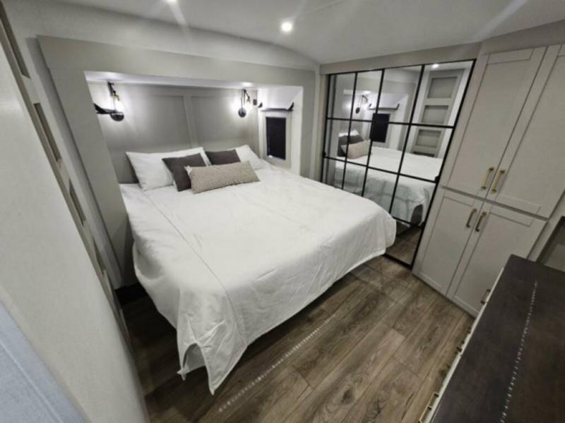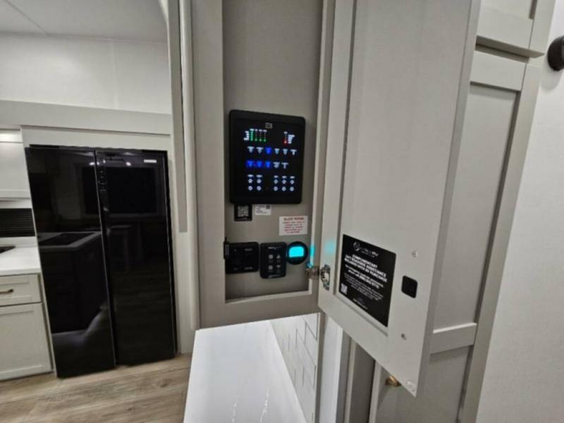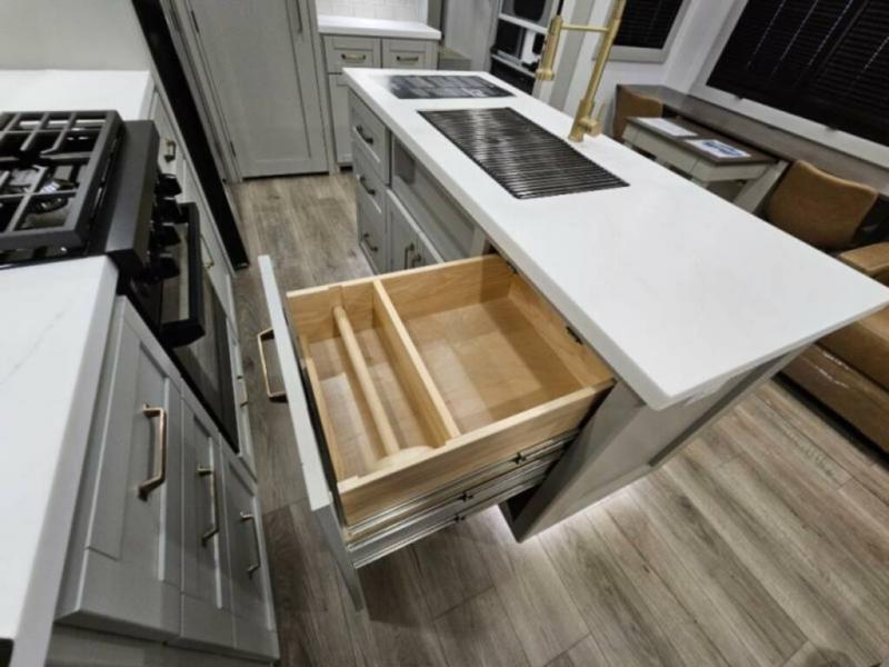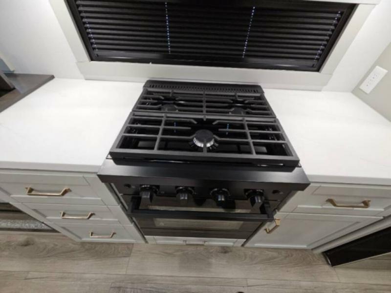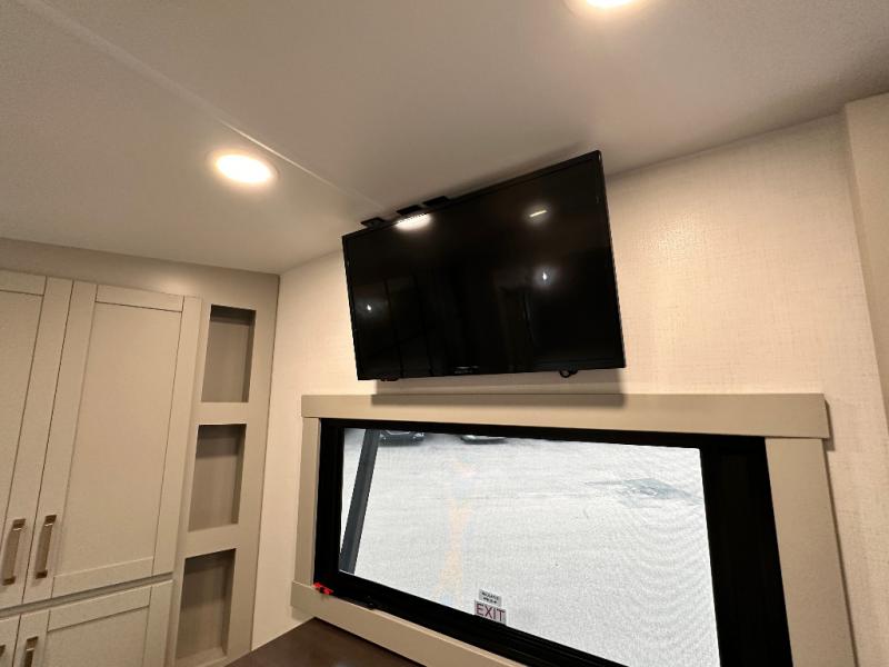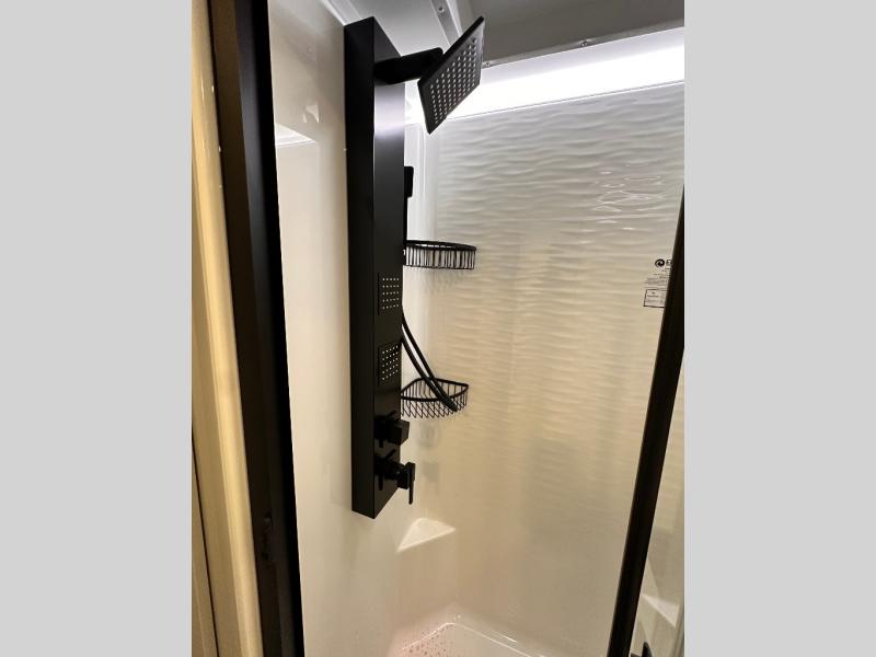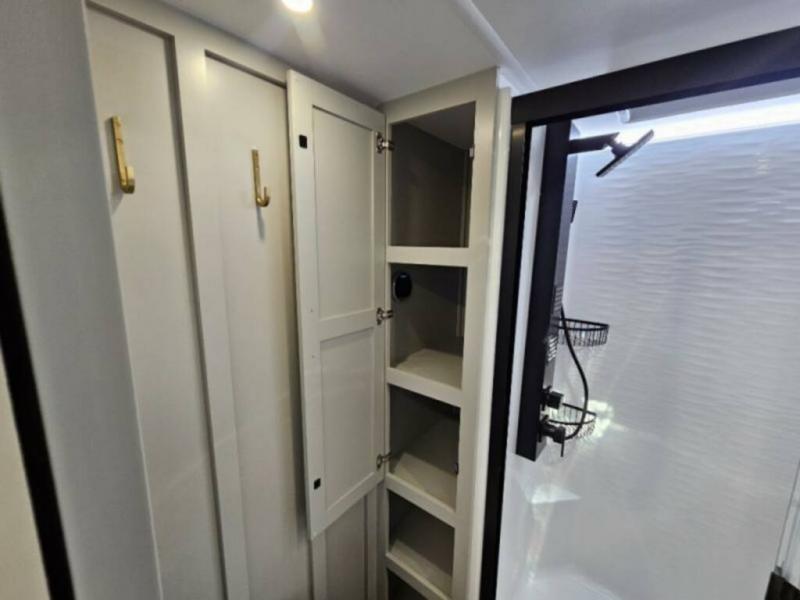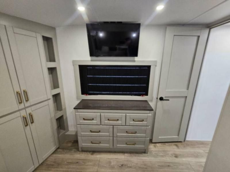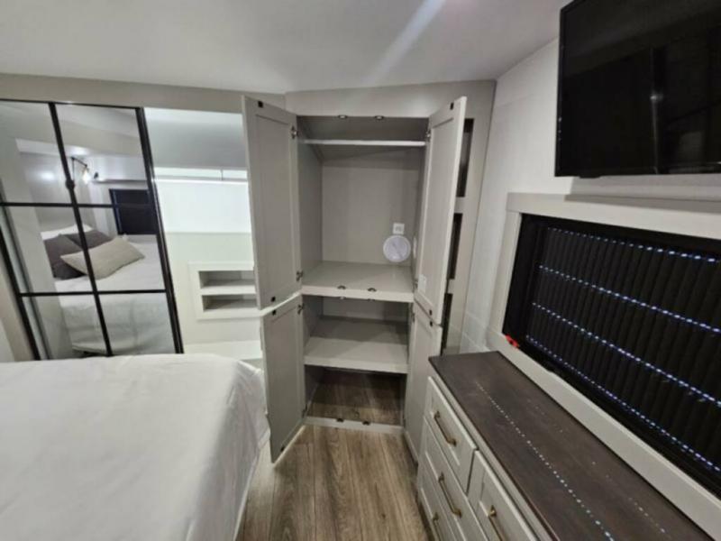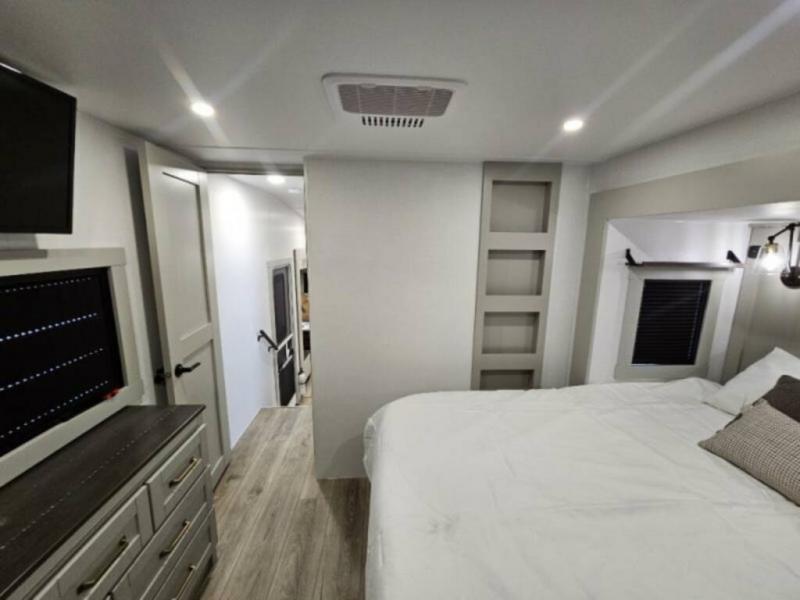 This Model Z luxury fifth wheel is bright and modern on the inside, with loads of amenities that will have you dreaming of your next trip! Enter and find a spacious combined living/kitchen space thanks to dual opposing slides. There is ample seating with a sliding desk/dining table, 62" theater seating, and a 72" tri-fold sofa along the rear wall. You can easily relax and enjoy the 50" Smart telescoping TV with a cozy fireplace below. The kitchen offers all that you need to prepare and cook meals just like home with a 16 cu. ft. refrigerator for your perishables, a 30" microwave oven, and three burner range top and oven. You will love the integrated spice rack, and the kitchen island all outfitted with dog bowls and double pull out trash bins with an integrated Stow 'N Go paper towel holder. There is also an 84" pantry with adjustable shelves for all of your canned and dry goods. Head up the steps to a private master suite with king bed slide. You can opt for the queen bed if you like. A sliding dresser top features hidden storage which is perfect for jewelry and other personal belongings. The front wardrobe features mirrored doors and the corner closet has been prepped for a stackable washer and dryer if you choose to add that option. Relax and enjoy a large bath featuring a linen cabinet, a 30" x 42" shower, and vanity with sink, plus medicine cabinet.
