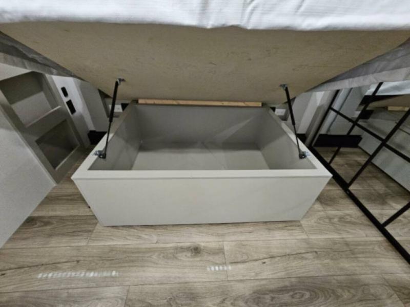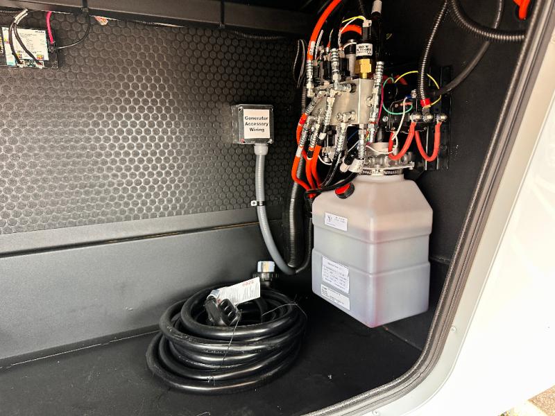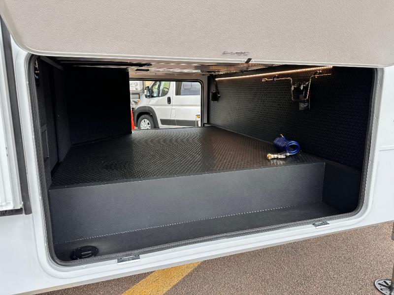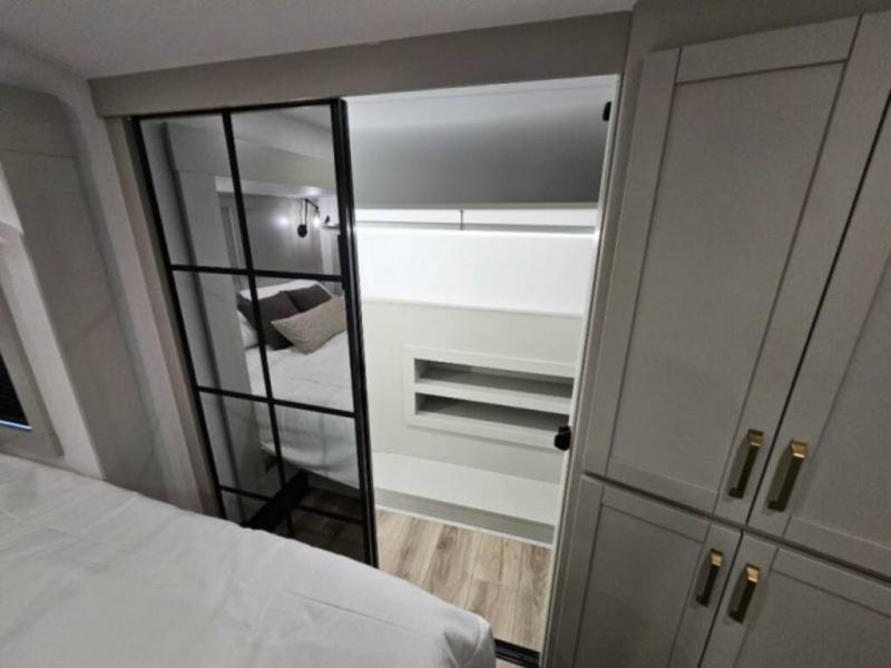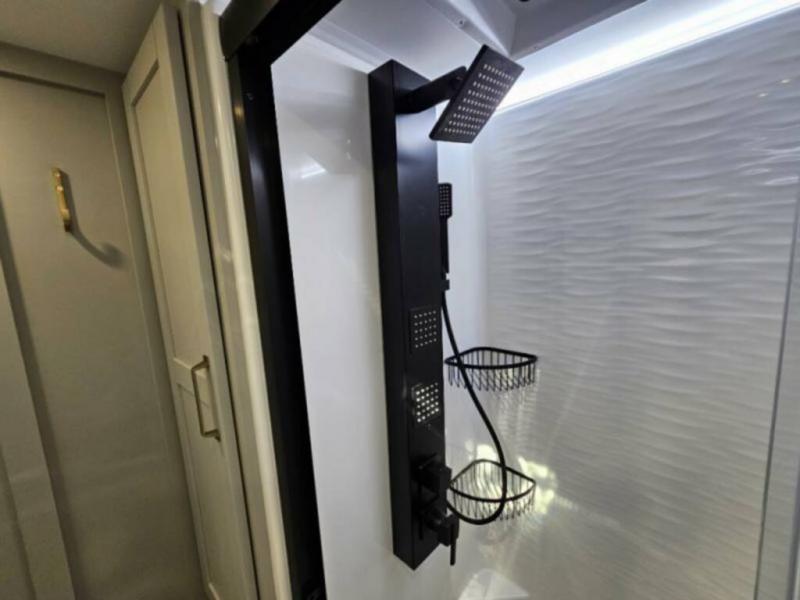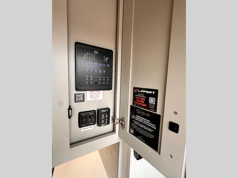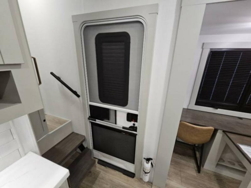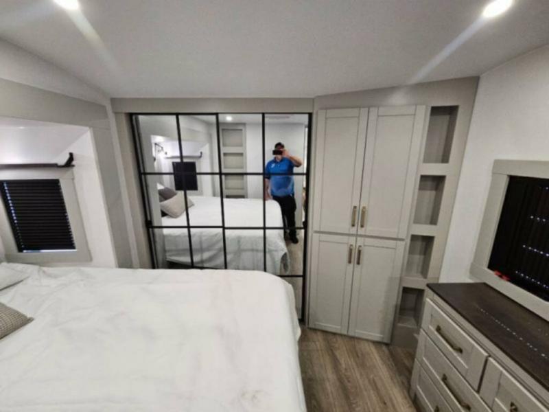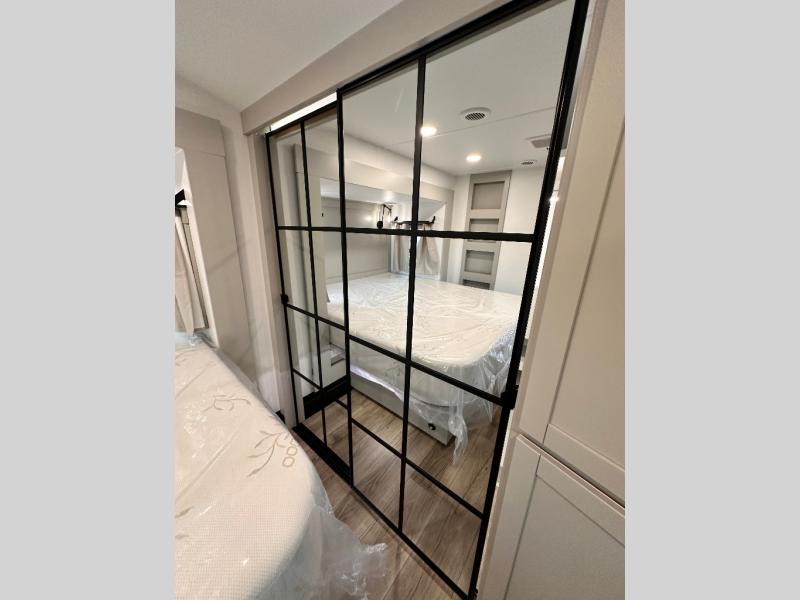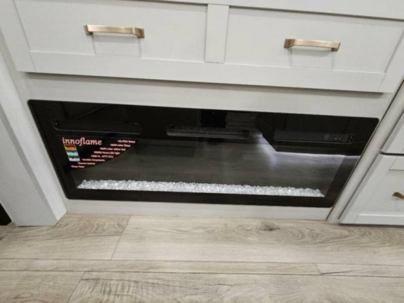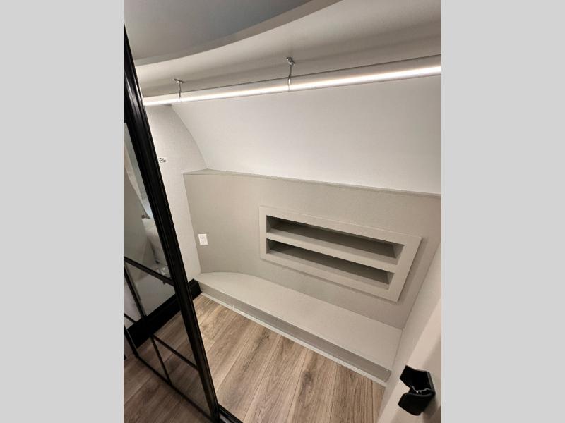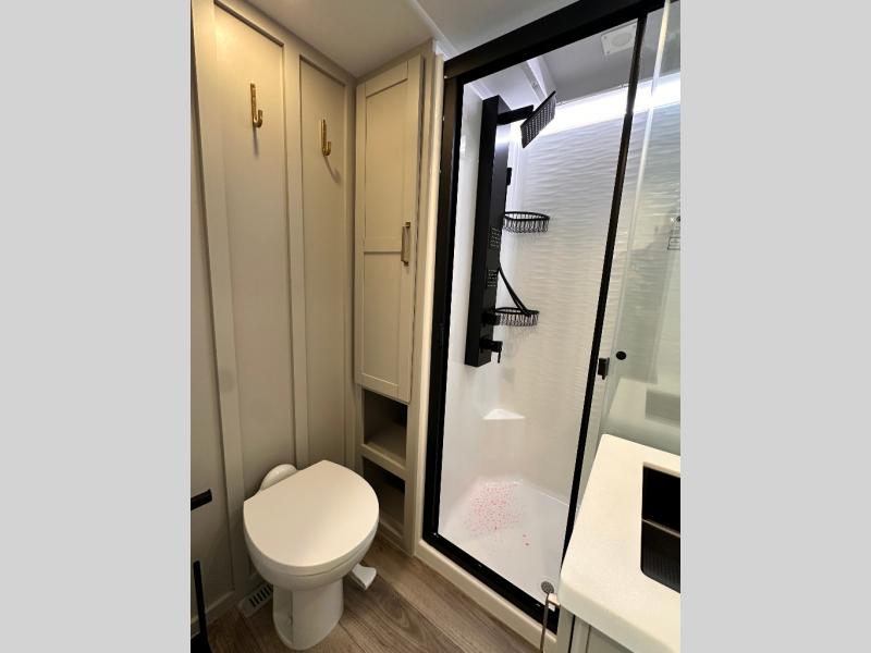 This Model Z luxury fifth wheel is bright and modern on the inside, with loads of amenities that will have you dreaming of your next trip! Enter and find a spacious combined living/kitchen space thanks to dual opposing slides. There is ample seating with a sliding desk/dining table, 62" theater seating, and a 72" tri-fold sofa along the rear wall. You can easily relax and enjoy the 50" Smart telescoping TV with a cozy fireplace below. The kitchen offers all that you need to prepare and cook meals just like home with a 16 cu. ft. refrigerator for your perishables, a 30" microwave oven, and three burner range top and oven. You will love the integrated spice rack, and the kitchen island all outfitted with dog bowls and double pull out trash bins with an integrated Stow 'N Go paper towel holder. There is also an 84" pantry with adjustable shelves for all of your canned and dry goods. Head up the steps to a private master suite with king bed slide. You can opt for the queen bed if you like. A sliding dresser top features hidden storage which is perfect for jewelry and other personal belongings. The front wardrobe features mirrored doors and the corner closet has been prepped for a stackable washer and dryer if you choose to add that option. Relax and enjoy a large bath featuring a linen cabinet, a 30" x 42" shower, and vanity with sink, plus medicine cabinet.