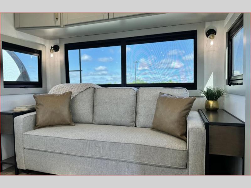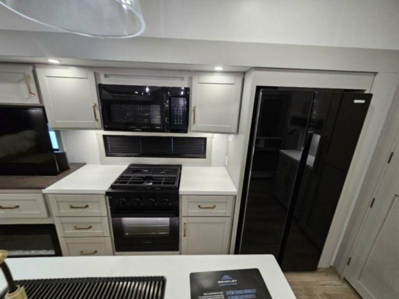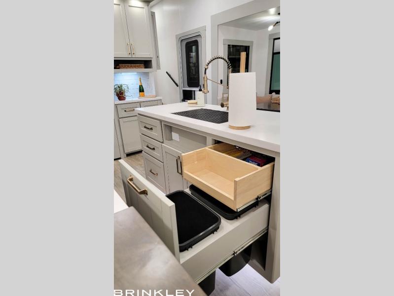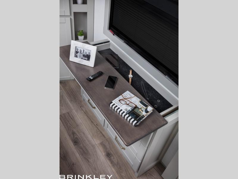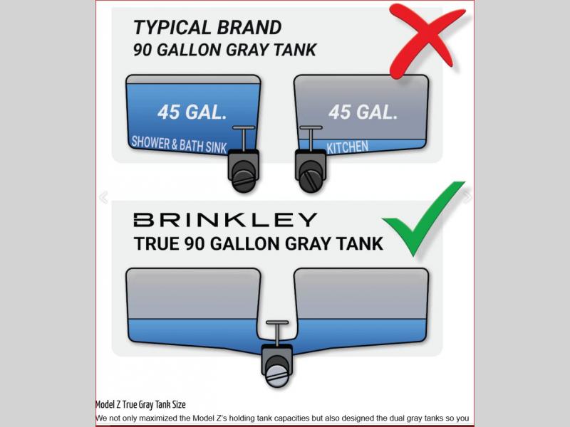 The Brinkley mid-profile Model Z fifth wheels bring you clean lines and an upscale look with plenty of style and exciting new features like the industry first brass plumbing connections. These units also feature an automotive grade front cap, plenty of exterior storage, dual exterior hot and cold showers, and wide stance leveling jacks for easy set up. Residential frameless windows provide a clean look and beautiful views, and ample electrical outlets and 6 USB/USB-C outlets allow all of your electronics and appliances to easily be used and charged.
