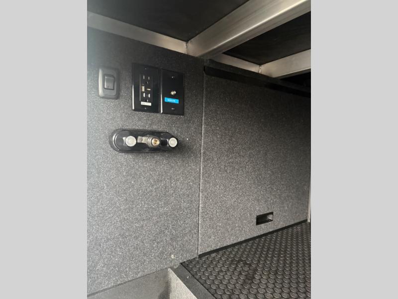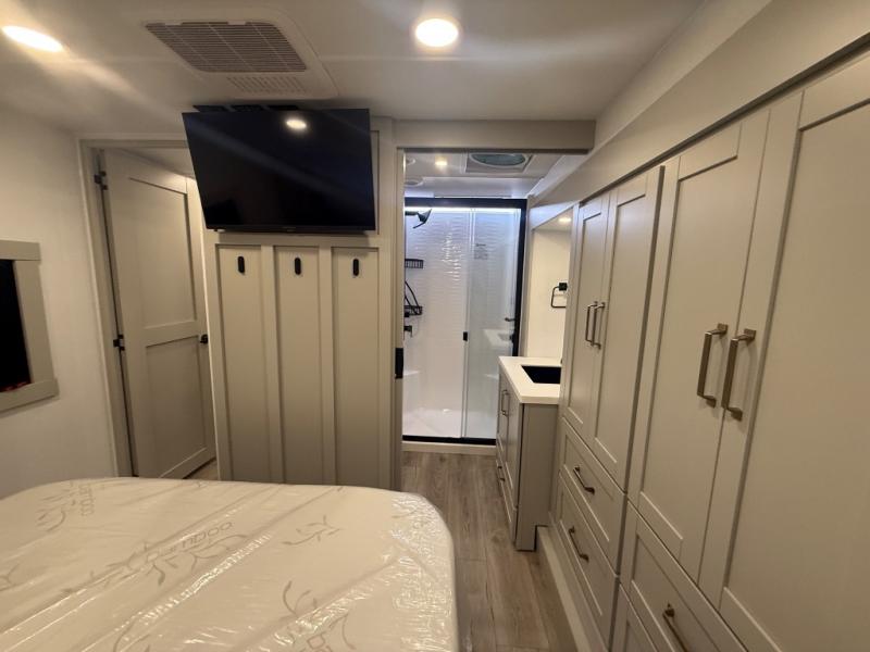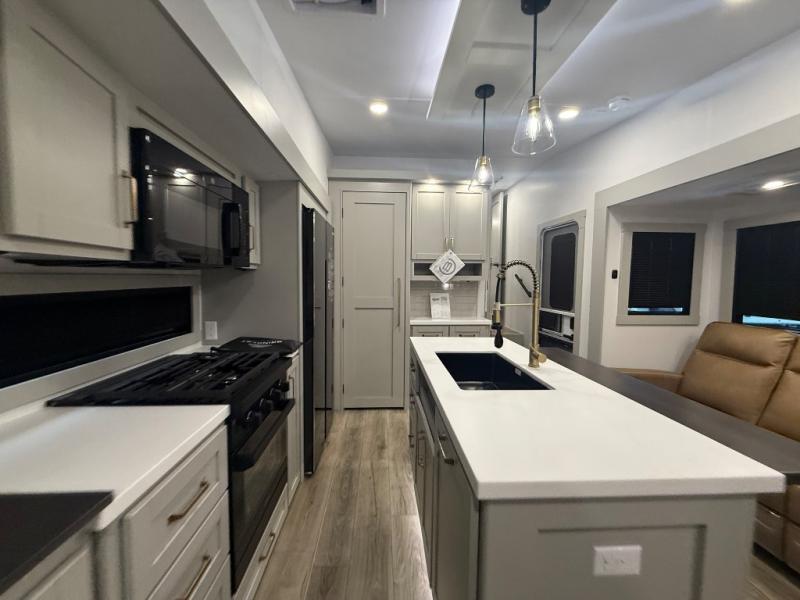 This Model Z luxury fifth wheel is bright and modern on the inside, with loads of amenities that will have you dreaming of your next trip! Enter and find a spacious combined living/kitchen space thanks to dual opposing slides. There is ample seating with a sliding desk/dining table, 62" theater seating, and a 72" tri-fold sofa along the rear wall. You can easily relax and enjoy the 50" Smart telescoping TV with a cozy fireplace below. The kitchen offers all that you need to prepare and cook meals just like home with a 16 cu. ft. refrigerator for your perishables, a 30" microwave oven, and three burner range top and oven. You will love the integrated spice rack, and the kitchen island all outfitted with dog bowls and double pull out trash bins with an integrated Stow 'N Go paper towel holder. There is also an 84" pantry with adjustable shelves for all of your canned and dry goods. Head up the steps to a private master suite with king bed slide. You can opt for the queen bed if you like. A sliding dresser top features hidden storage which is perfect for jewelry and other personal belongings. The front wardrobe features mirrored doors and the corner closet has been prepped for a stackable washer and dryer if you choose to add that option. Relax and enjoy a large bath featuring a linen cabinet, a 30" x 42" shower, and vanity with sink, plus medicine cabinet.