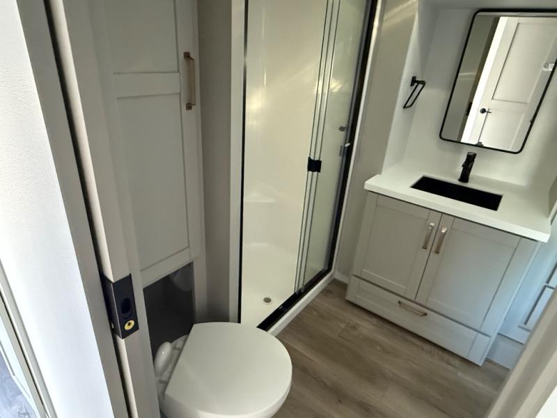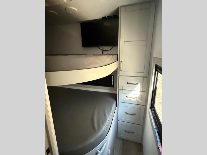 The perfect unit for your larger family, this Model Z can sleep eight! Step inside and find a wide open combined kitchen and living room. There is a large slide out theater seat with two recliners and seating for four, plus a 60" tri-fold sofa, and a televator and fireplace in the appliance slide along the roadside. The center island features dual trash bins and stow & go paper towel holder, a large sink, and even dog bowls for your favorite furry friend. A 16 cu. ft. refrigerator will house all of your perishables, and you will also have an 84" pantry with adjustable shelves for all of your dry goods and snacks. Head up the steps to your right, just inside the entry, to find a private master bedroom and bath at the end of the hall. Here you will find a queen bed, slide out wardrobe with a dresser, and the bathroom vanity. A large 30" x 42" shower will welcome you each morning or night to keep clean and refreshed. At the very back of the unit, guests will enjoy a private bunkhouse with 54" x 74" bunk beds, a TV, and wardrobe with drawers beneath. The outside features over 160 cu. ft. of exterior storage with mid-coach pass-through and exterior storage access, plus two awnings for added outdoor living.