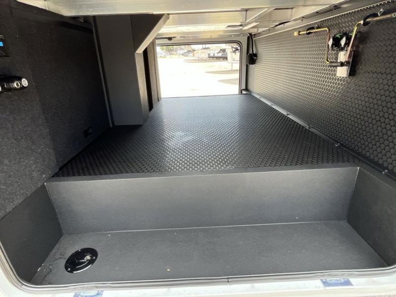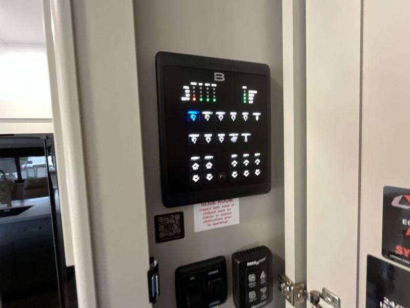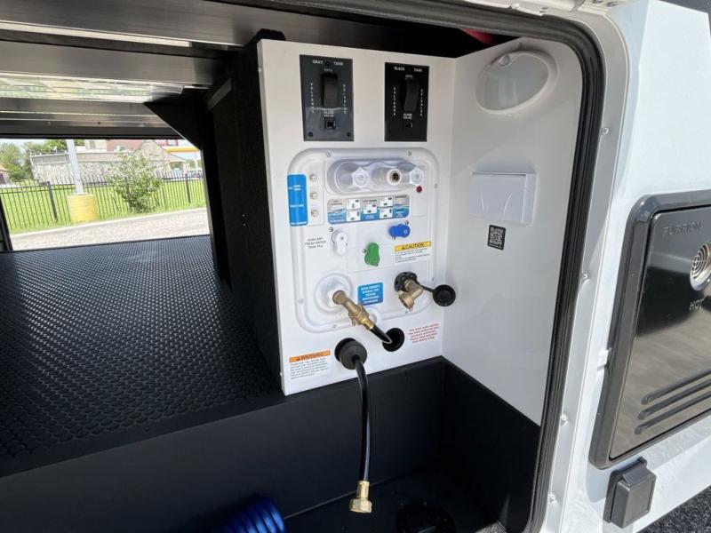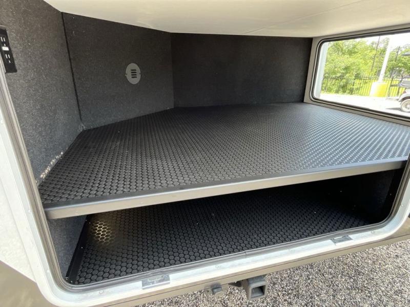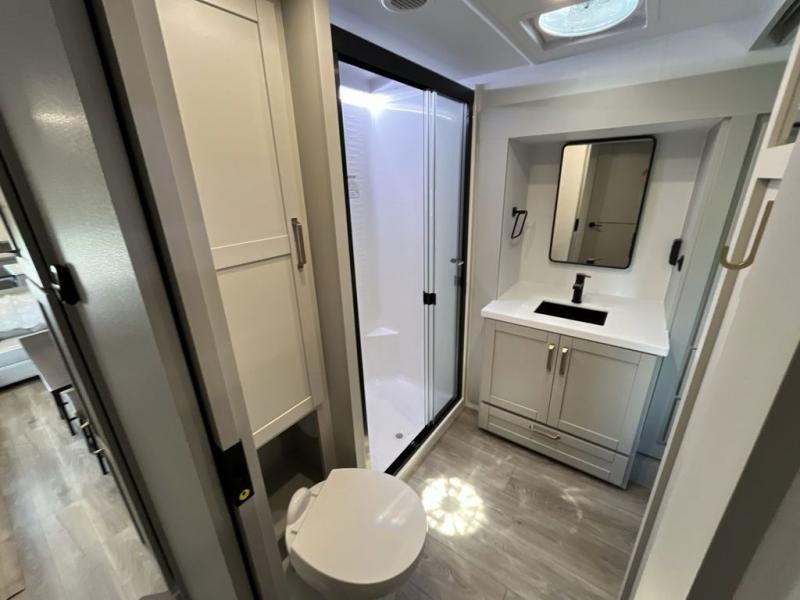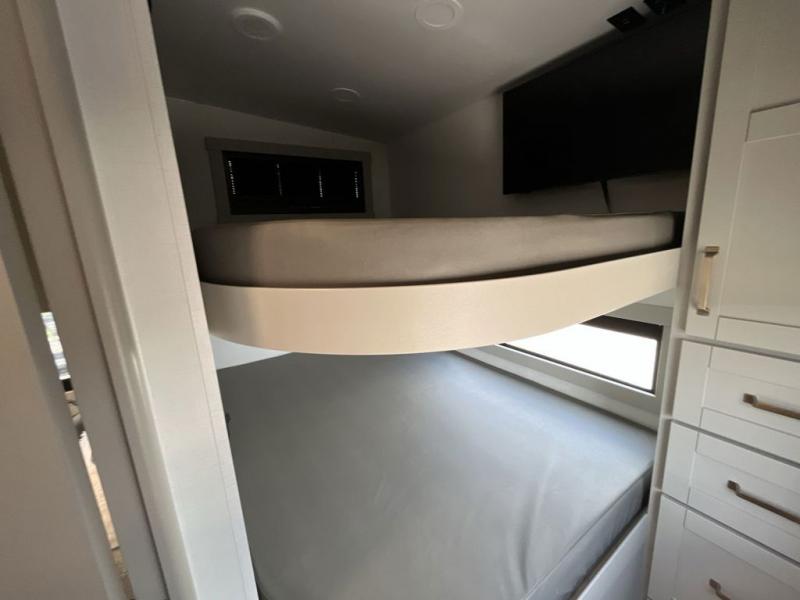 The perfect unit for your larger family, this Model Z can sleep eight! Step inside and find a wide open combined kitchen and living room. There is a large slide out theater seat with two recliners and seating for four, plus a 60" tri-fold sofa, and a televator and fireplace in the appliance slide along the roadside. The center island features dual trash bins and stow & go paper towel holder, a large sink, and even dog bowls for your favorite furry friend. A 16 cu. ft. refrigerator will house all of your perishables, and you will also have an 84" pantry with adjustable shelves for all of your dry goods and snacks. Head up the steps to your right, just inside the entry, to find a private master bedroom and bath at the end of the hall. Here you will find a queen bed, slide out wardrobe with a dresser, and the bathroom vanity. A large 30" x 42" shower will welcome you each morning or night to keep clean and refreshed. At the very back of the unit, guests will enjoy a private bunkhouse with 54" x 74" bunk beds, a TV, and wardrobe with drawers beneath. The outside features over 160 cu. ft. of exterior storage with mid-coach pass-through and exterior storage access, plus two awnings for added outdoor living.
