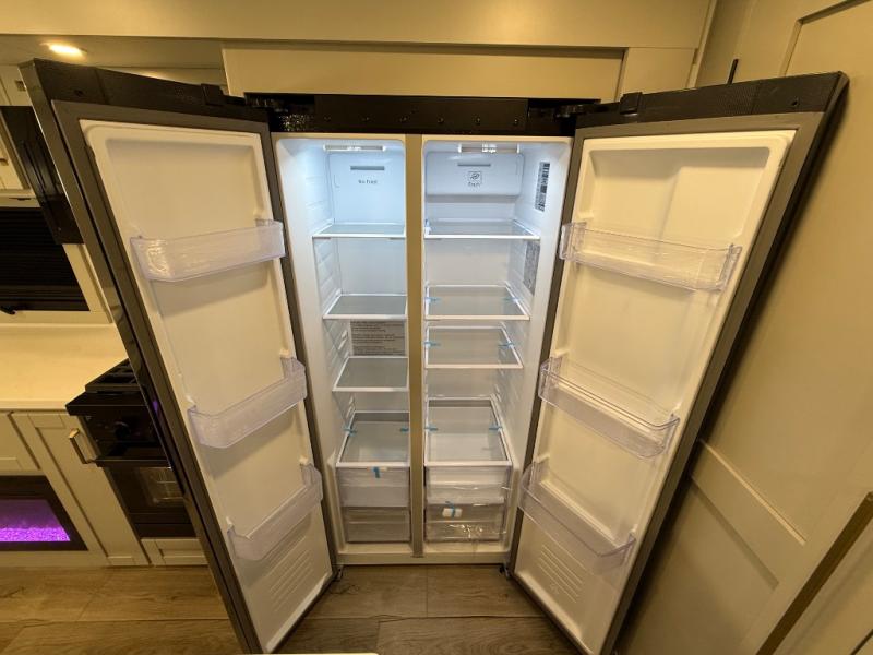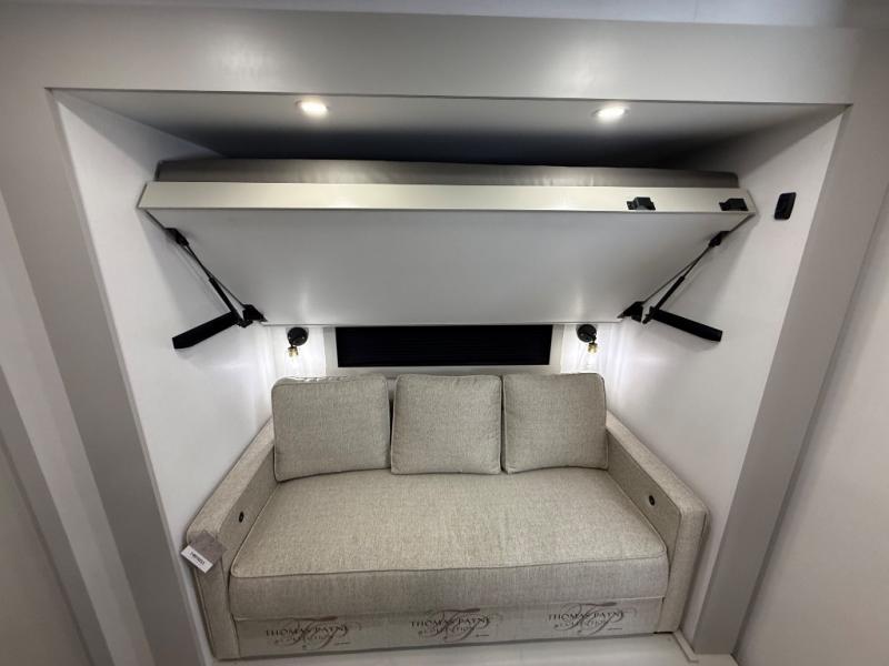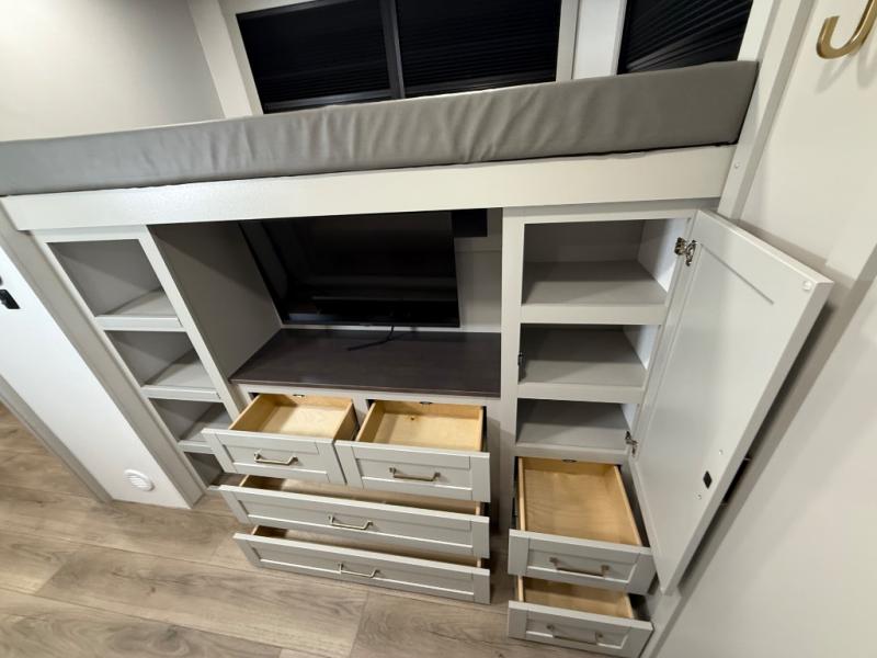 The whole gang will love camping in this spacious travel trailer for six to seven! Your guests or little ones will have the rear bunkhouse all to themselves, which includes a tri-fold sofa with a reclining back, a flip-up bunk, plus a second bunk bed across the room for even more sleeping space. There is even a bunkroom 42" Smart TV with a wardrobe for entertainment and storage! The front private bedroom includes a walk-around queen bed with four under-bed drawers for clothes, extra blankets and more. Head to the combined kitchen and living room to prep dinner on the kitchen island, relax on the theater seating, and dine at the sleeper dinette. There is also a pantry with adjustable shelves here, along with a hutch, 16 cu. ft. refrigerator that opens with the slide out, plus a televator and fireplace to make your space feel more like home! Outside, you'll find two power awnings, LED ground lighting, drop-frame pass-thru storage, and an outdoor kitchen with a refrigerator, sink, and storage!