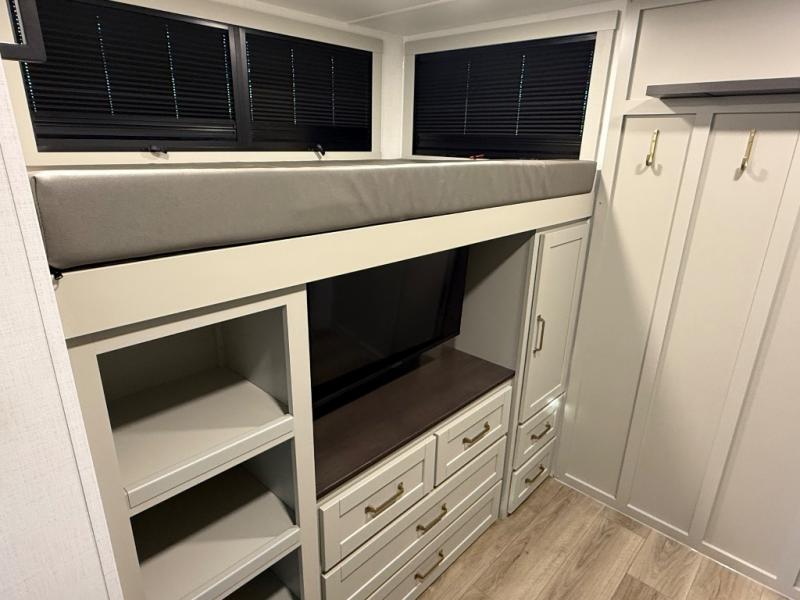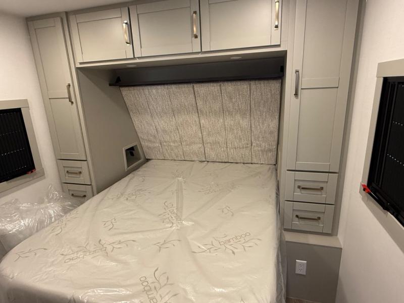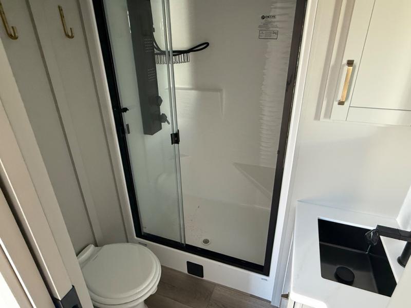 The bathroom offers a fiberglass shower with glass doors, porcelain foot-flush toilet, premium vent fan, and built-in linen storage. With a tankless on-demand water heater, you’ll enjoy endless hot showers wherever your travels take you.