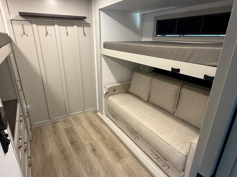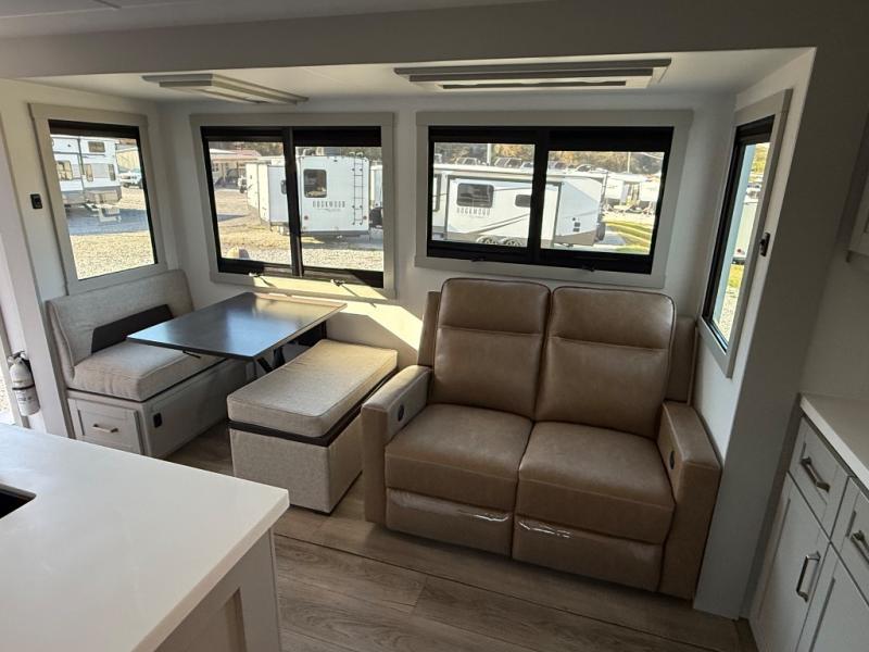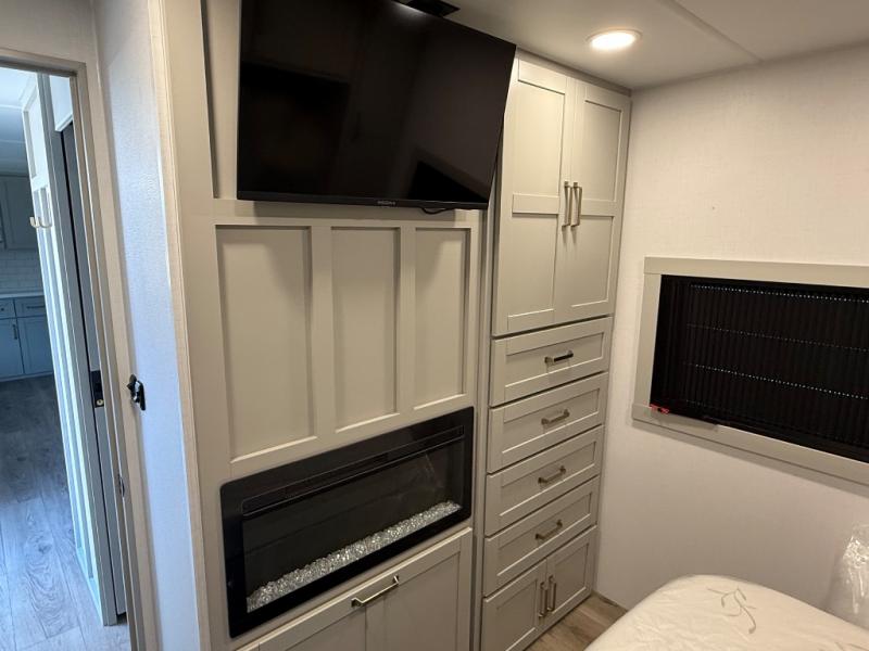Inside, the 315 welcomes you with a wide-open layout perfect for entertaining or relaxing. The living area features theater seating, a tri-fold sofa, and a fireplace paired with a Smart TV for cozy evenings. High-end cabinetry, modern finishes, and thoughtful details like blackout roller shades create a true residential atmosphere.