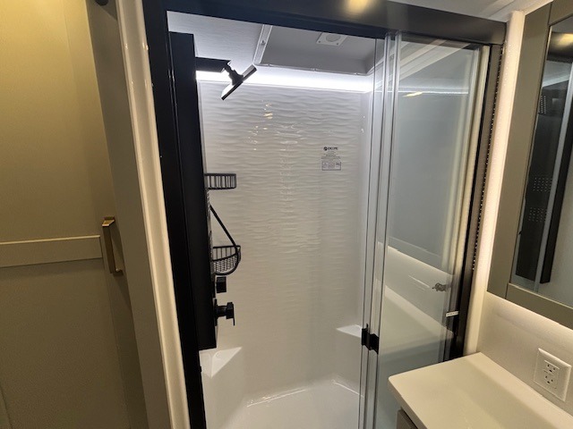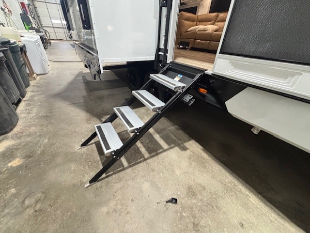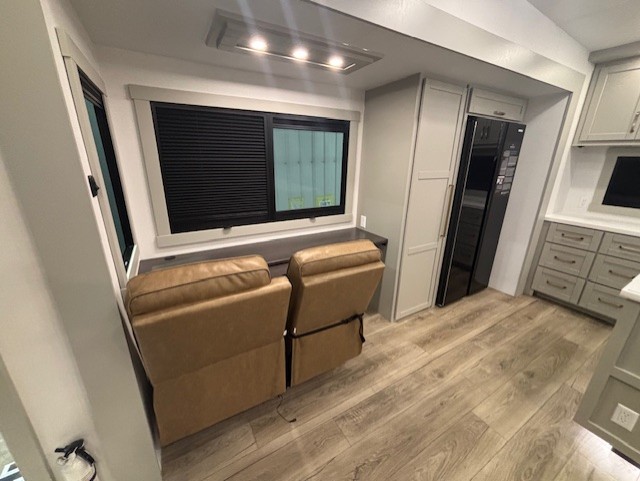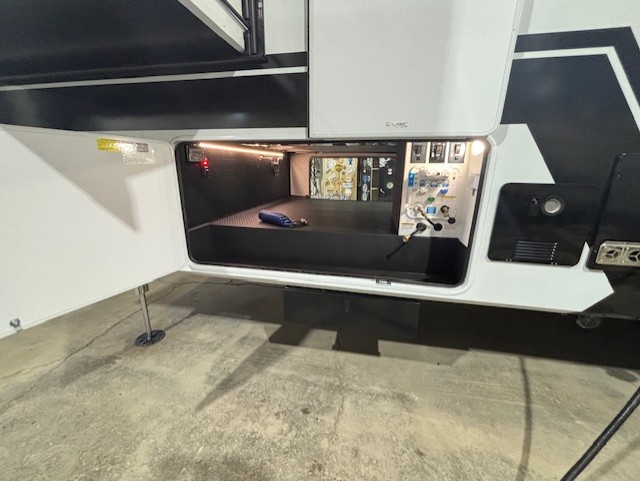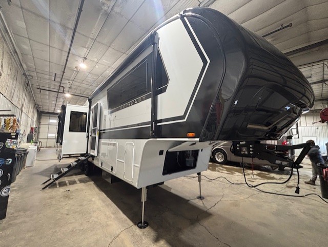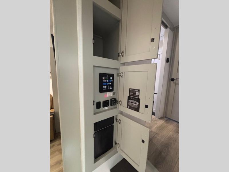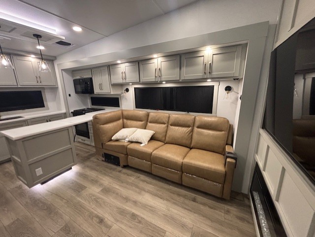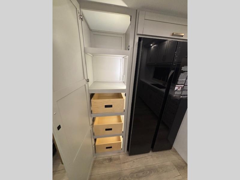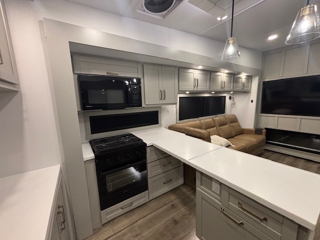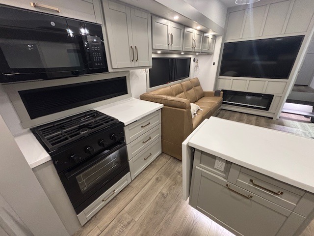 Escape to a world of comfort and luxury with this incredible fifth wheel! The living area features a plush L-sofa, five recliners, and a warm fireplace. The versatile dining table/L desk seats up to four people, making it perfect for meals, work, or play. Ample shoe storage and a convenient spot for pet bowls enhance comfort and practicality. The kitchen offers stunning solid surface countertops, dishwasher prep, a residential microwave, and a three-burner cooktop. The expansive pantry with pull-out drawers provides ample storage for your favorite ingredients and cooking essentials. The full bathroom is a serene oasis, featuring a linen closet for added storage and convenience. The front bedroom is a peaceful sanctuary, featuring a spacious king bed, shelves, and a sliding dresser top with hidden storage. The generous wardrobe and shoe rack provide ample storage for your clothes and shoes.