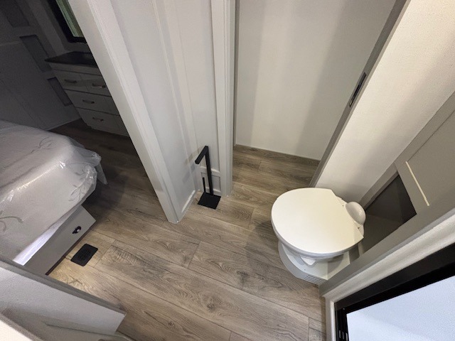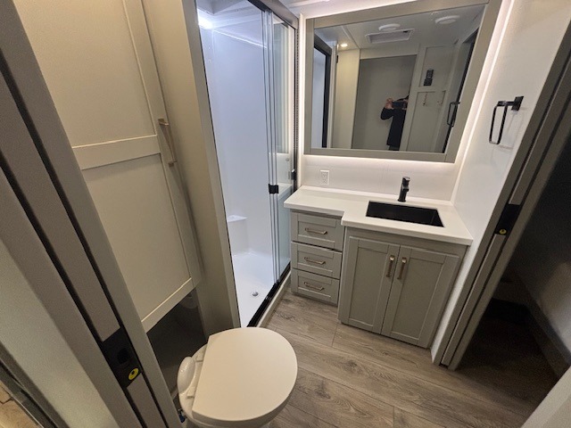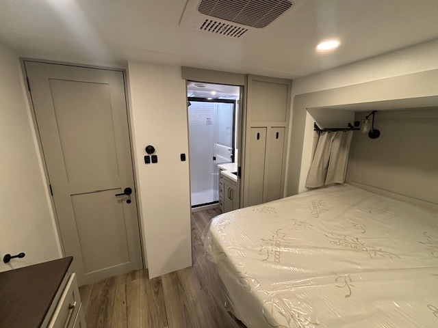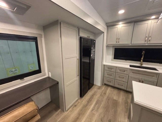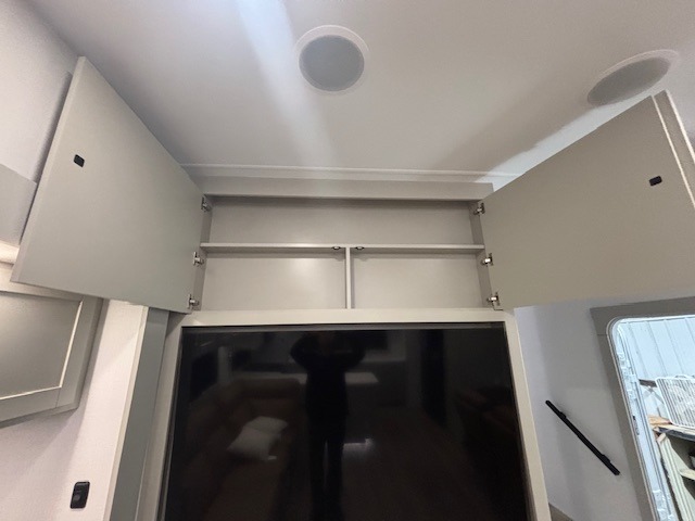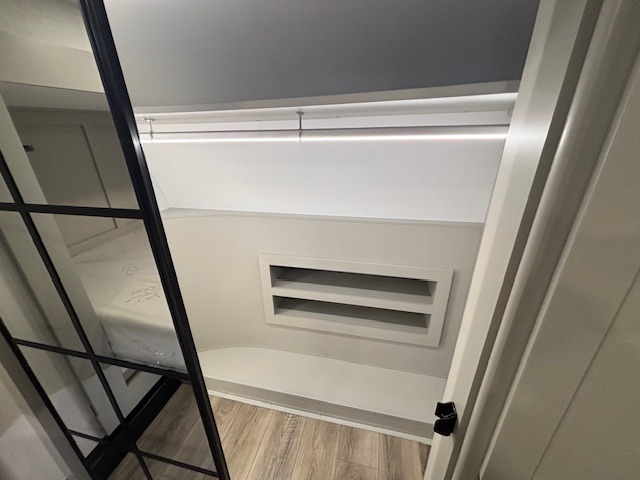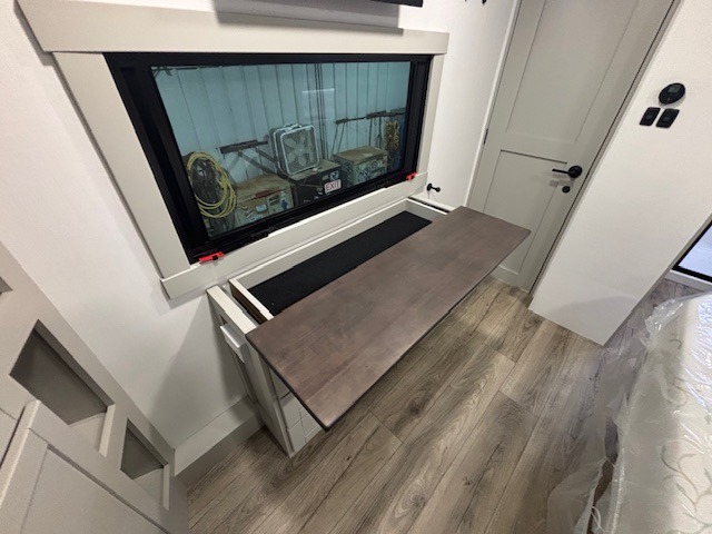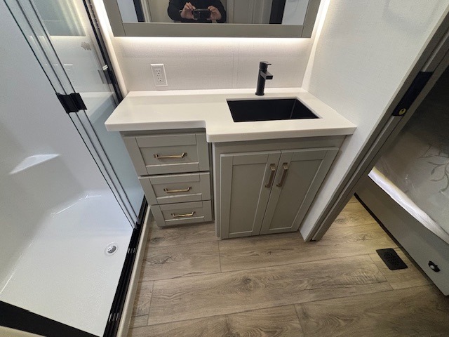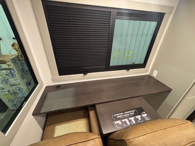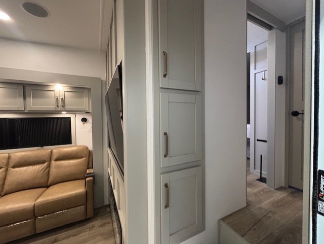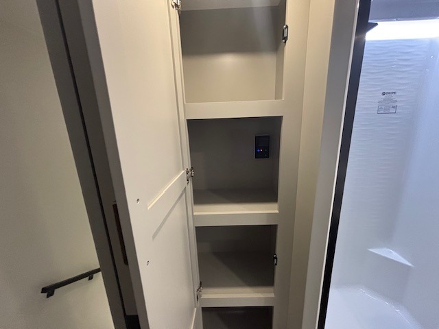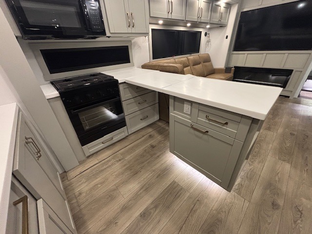 Escape to a world of comfort and luxury with this incredible fifth wheel! The living area features a plush L-sofa, five recliners, and a warm fireplace. The versatile dining table/L desk seats up to four people, making it perfect for meals, work, or play. Ample shoe storage and a convenient spot for pet bowls enhance comfort and practicality. The kitchen offers stunning solid surface countertops, dishwasher prep, a residential microwave, and a three-burner cooktop. The expansive pantry with pull-out drawers provides ample storage for your favorite ingredients and cooking essentials. The full bathroom is a serene oasis, featuring a linen closet for added storage and convenience. The front bedroom is a peaceful sanctuary, featuring a spacious king bed, shelves, and a sliding dresser top with hidden storage. The generous wardrobe and shoe rack provide ample storage for your clothes and shoes.