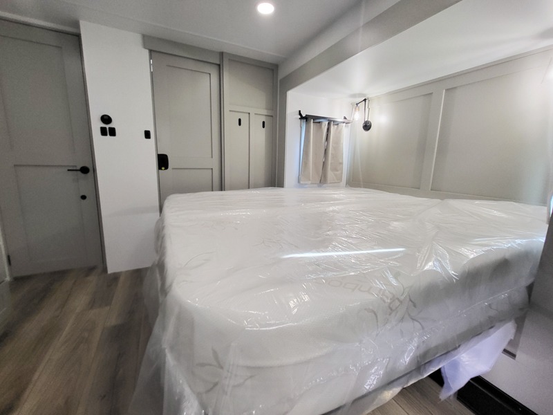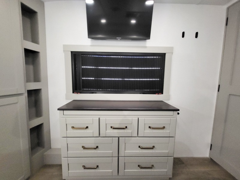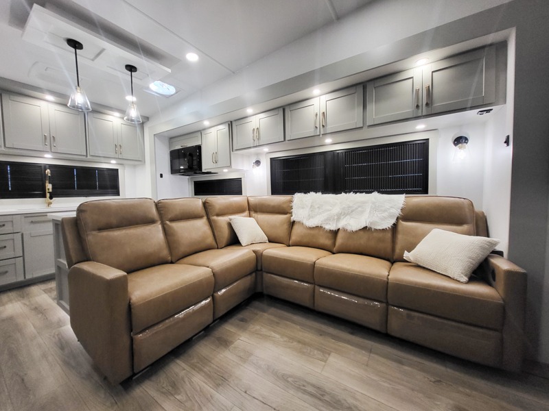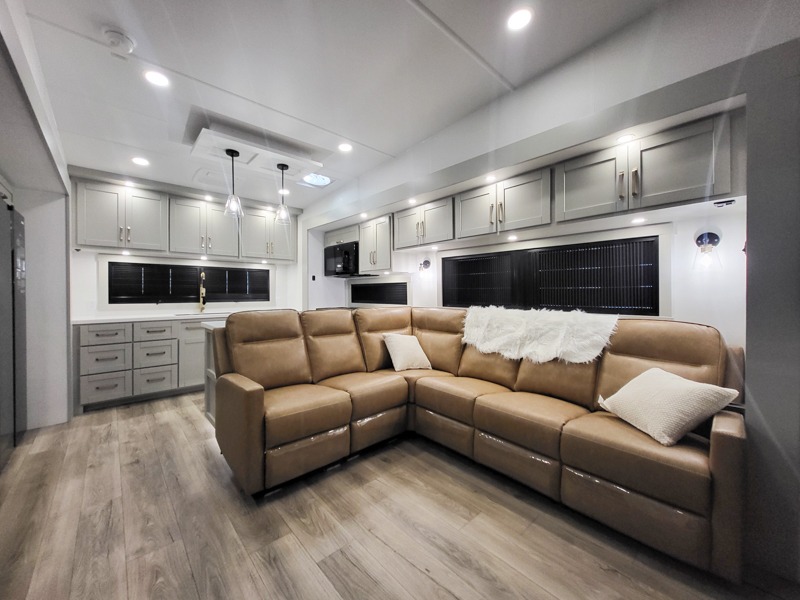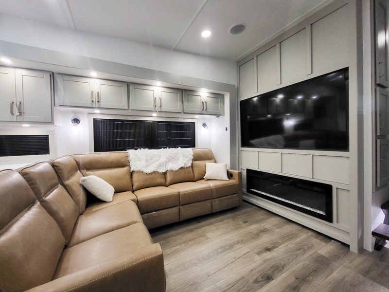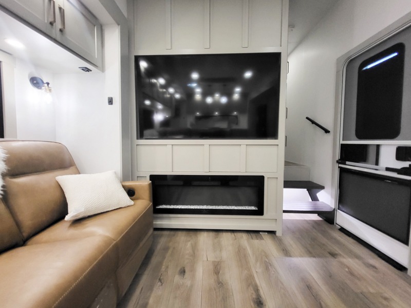 Escape to a world of comfort and luxury with this incredible fifth wheel! The living area features a plush L-sofa, five recliners, and a warm fireplace. The versatile dining table/L desk seats up to four people, making it perfect for meals, work, or play. Ample shoe storage and a convenient spot for pet bowls enhance comfort and practicality. The kitchen offers stunning solid surface countertops, dishwasher prep, a residential microwave, and a three-burner cooktop. The expansive pantry with pull-out drawers provides ample storage for your favorite ingredients and cooking essentials. The full bathroom is a serene oasis, featuring a linen closet for added storage and convenience. The front bedroom is a peaceful sanctuary, featuring a spacious king bed, shelves, and a sliding dresser top with hidden storage. The generous wardrobe and shoe rack provide ample storage for your clothes and shoes.