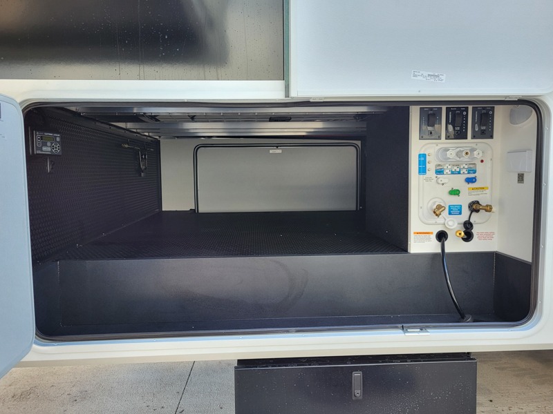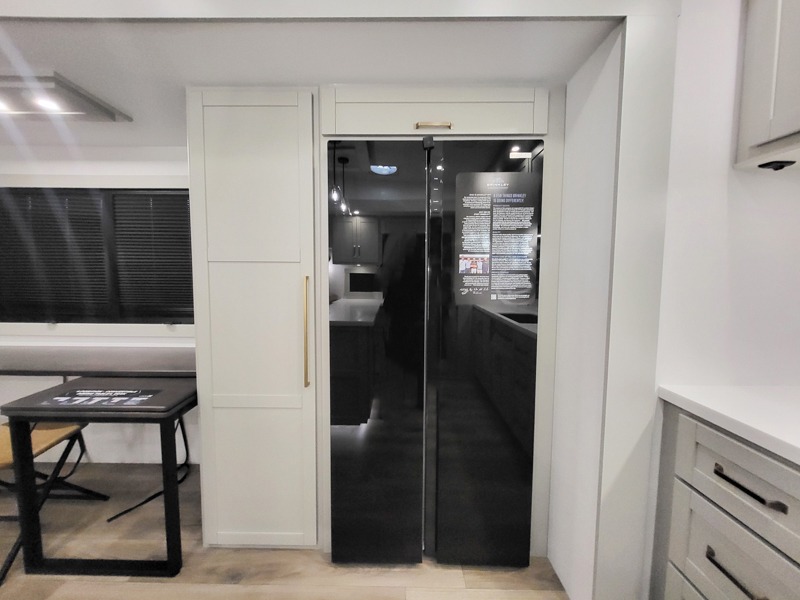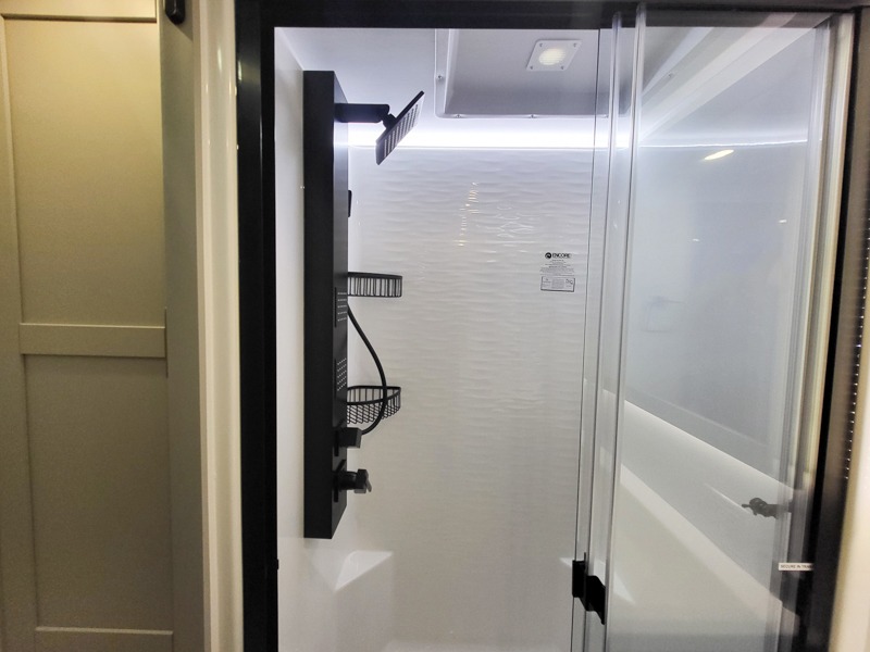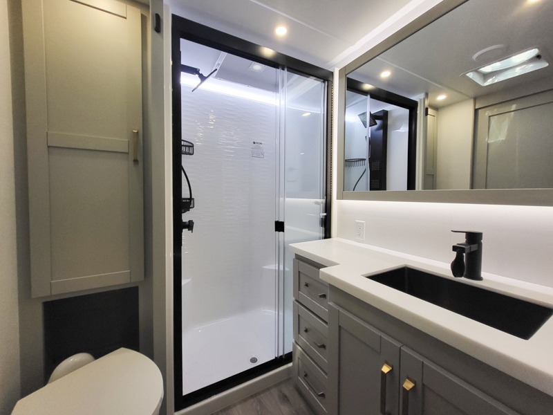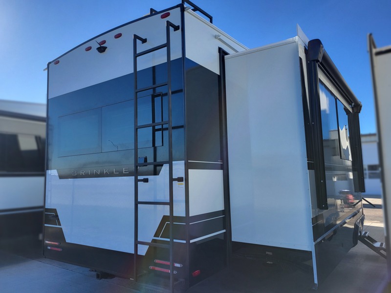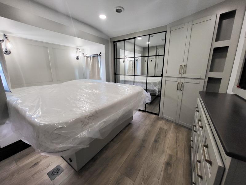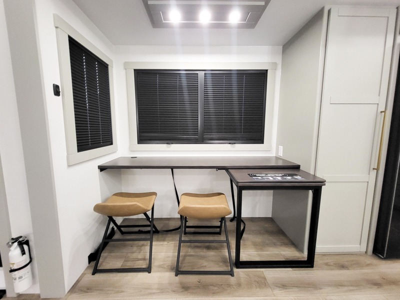 Escape to a world of comfort and luxury with this incredible fifth wheel! The living area features a plush L-sofa, five recliners, and a warm fireplace. The versatile dining table/L desk seats up to four people, making it perfect for meals, work, or play. Ample shoe storage and a convenient spot for pet bowls enhance comfort and practicality. The kitchen offers stunning solid surface countertops, dishwasher prep, a residential microwave, and a three-burner cooktop. The expansive pantry with pull-out drawers provides ample storage for your favorite ingredients and cooking essentials. The full bathroom is a serene oasis, featuring a linen closet for added storage and convenience. The front bedroom is a peaceful sanctuary, featuring a spacious king bed, shelves, and a sliding dresser top with hidden storage. The generous wardrobe and shoe rack provide ample storage for your clothes and shoes.