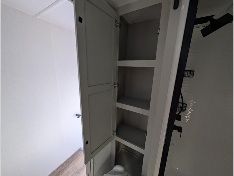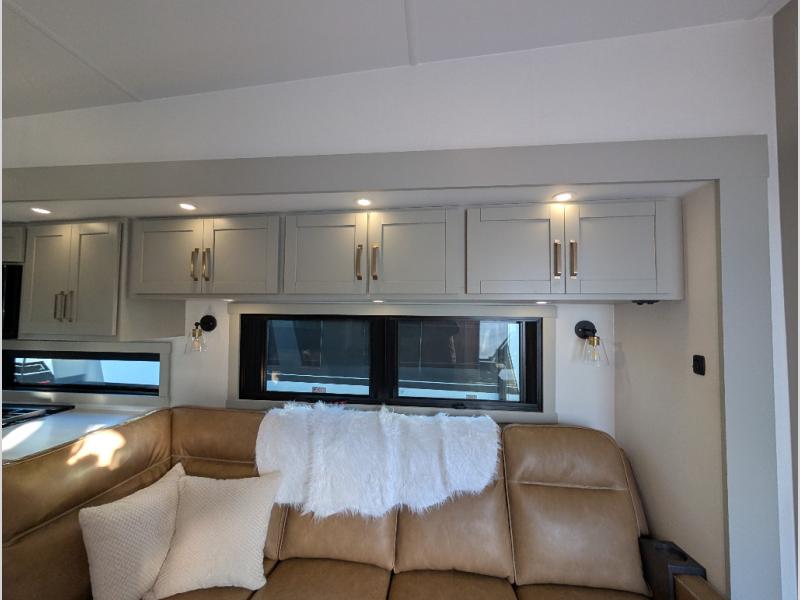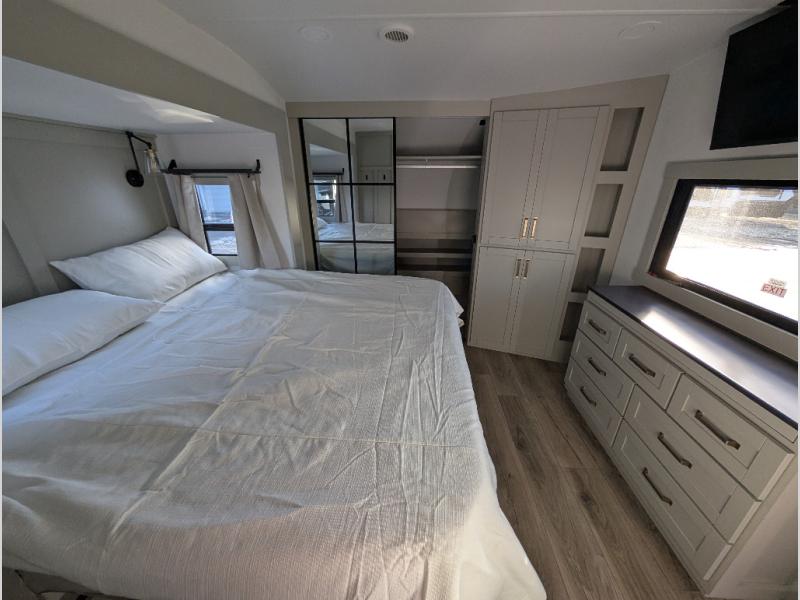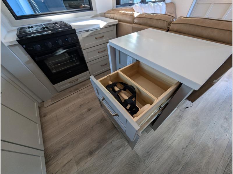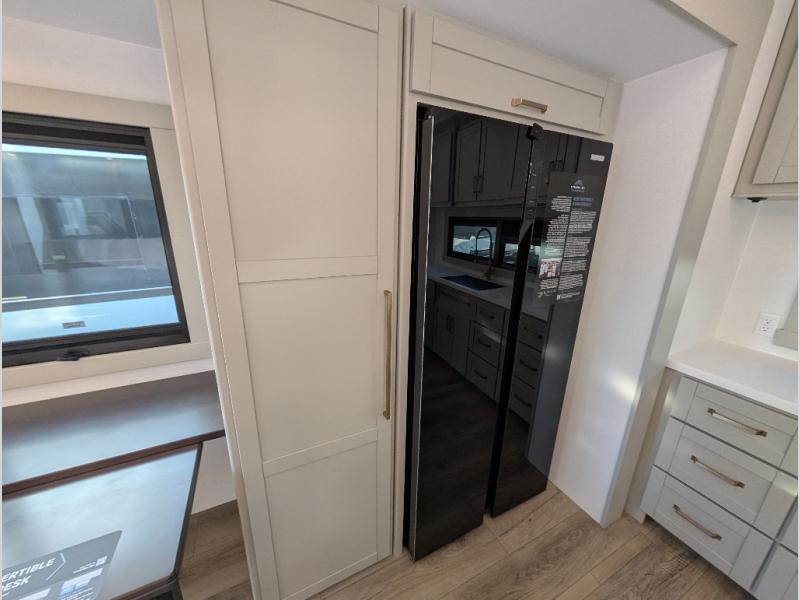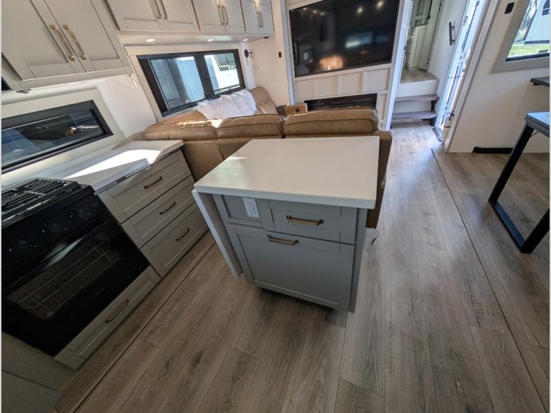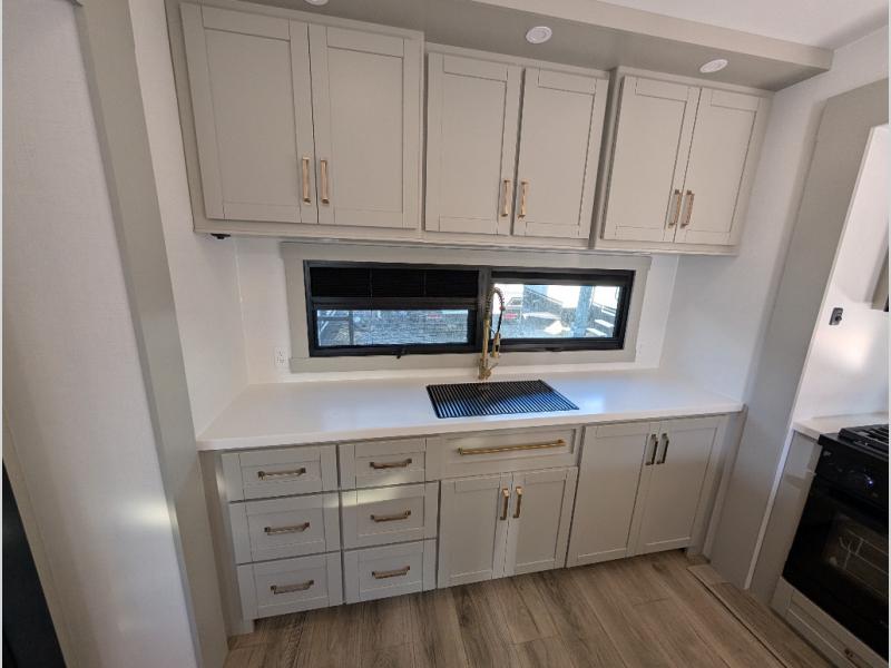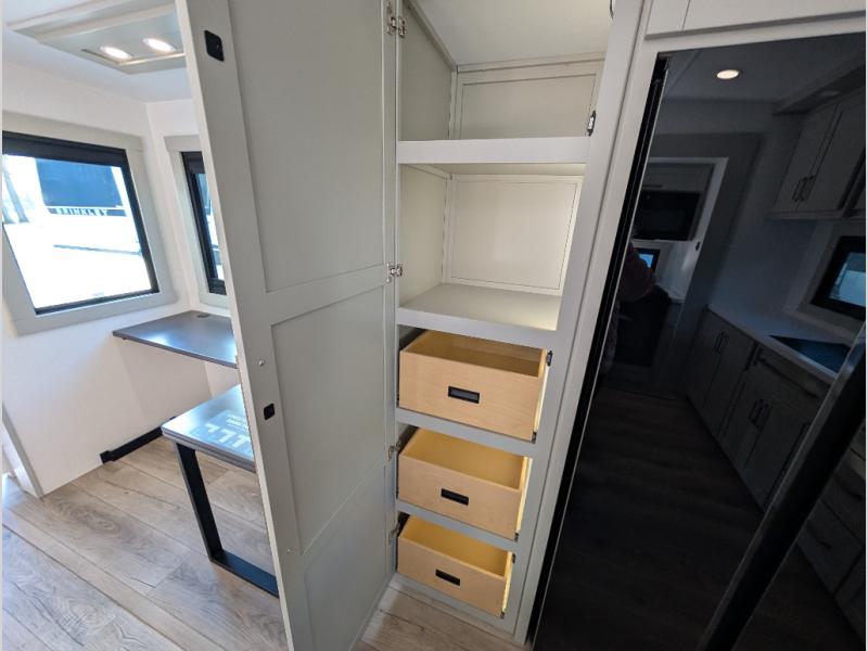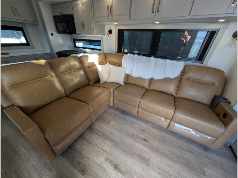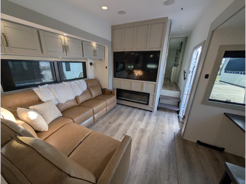 Escape to a world of comfort and luxury with this incredible fifth wheel! The living area features a plush L-sofa, five recliners, and a warm fireplace. The versatile dining table/L desk seats up to four people, making it perfect for meals, work, or play. Ample shoe storage and a convenient spot for pet bowls enhance comfort and practicality. The kitchen offers stunning solid surface countertops, dishwasher prep, a residential microwave, and a three-burner cooktop. The expansive pantry with pull-out drawers provides ample storage for your favorite ingredients and cooking essentials. The full bathroom is a serene oasis, featuring a linen closet for added storage and convenience. The front bedroom is a peaceful sanctuary, featuring a spacious king bed, shelves, and a sliding dresser top with hidden storage. The generous wardrobe and shoe rack provide ample storage for your clothes and shoes.