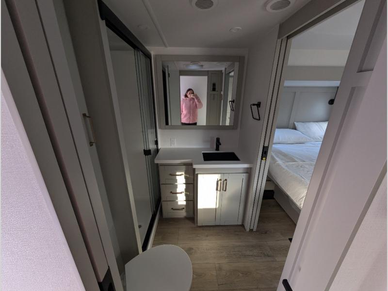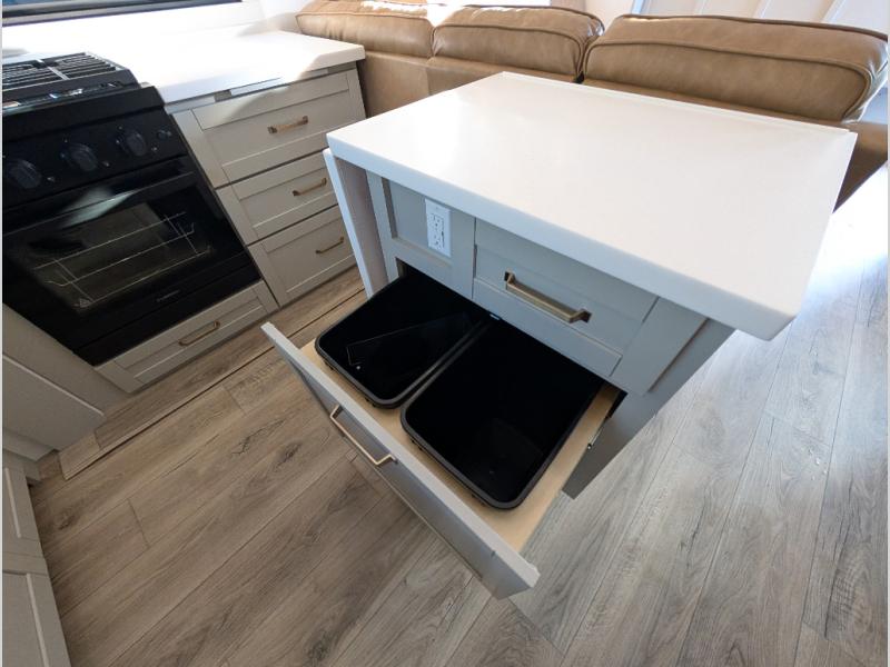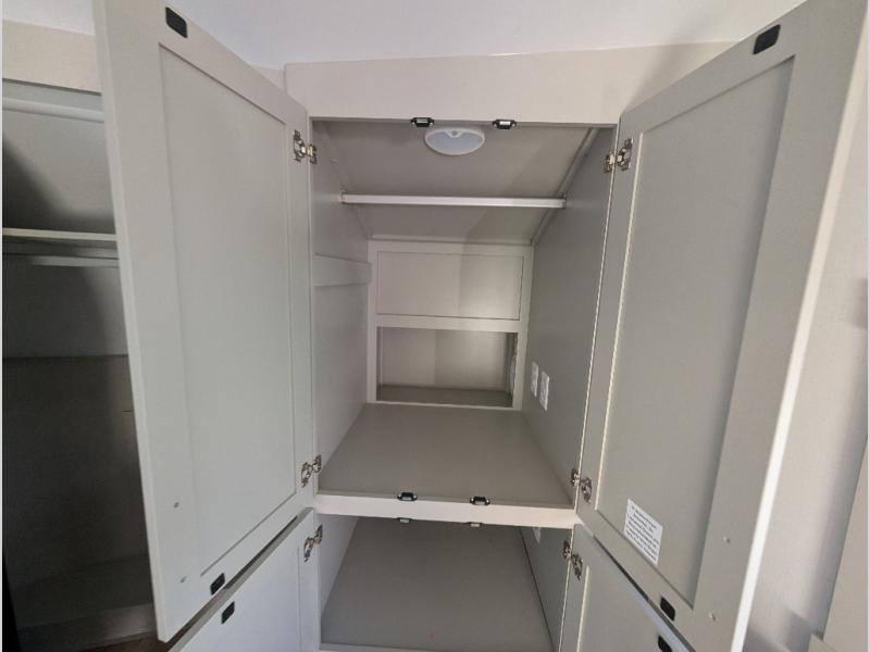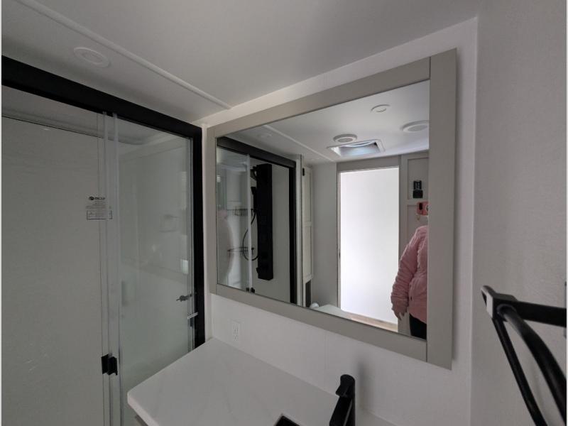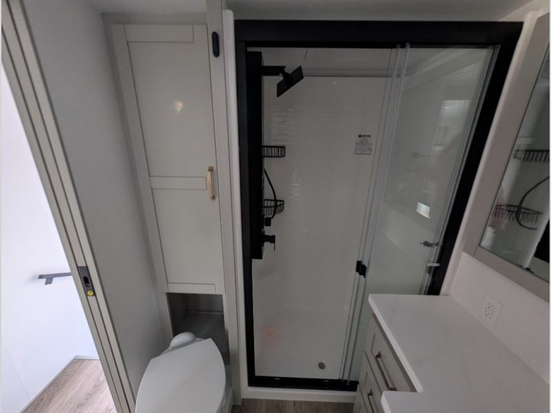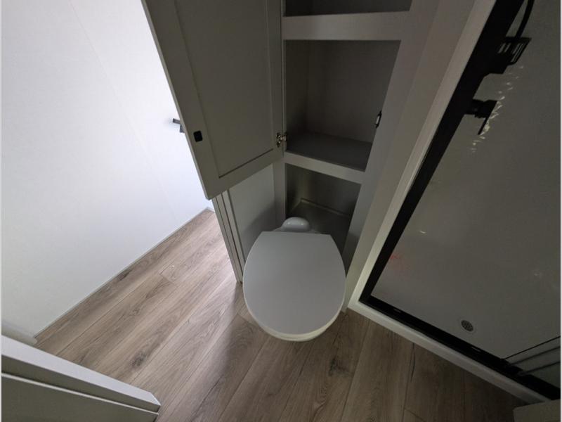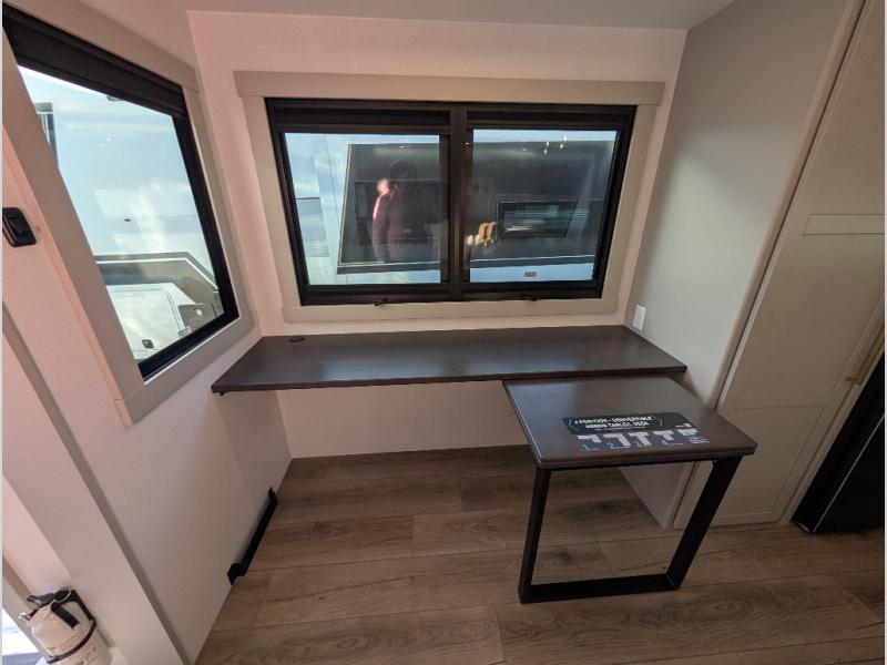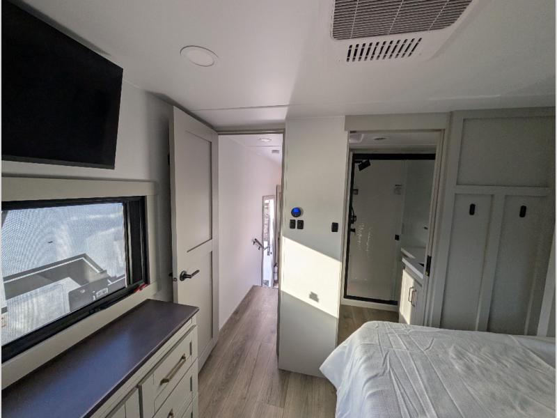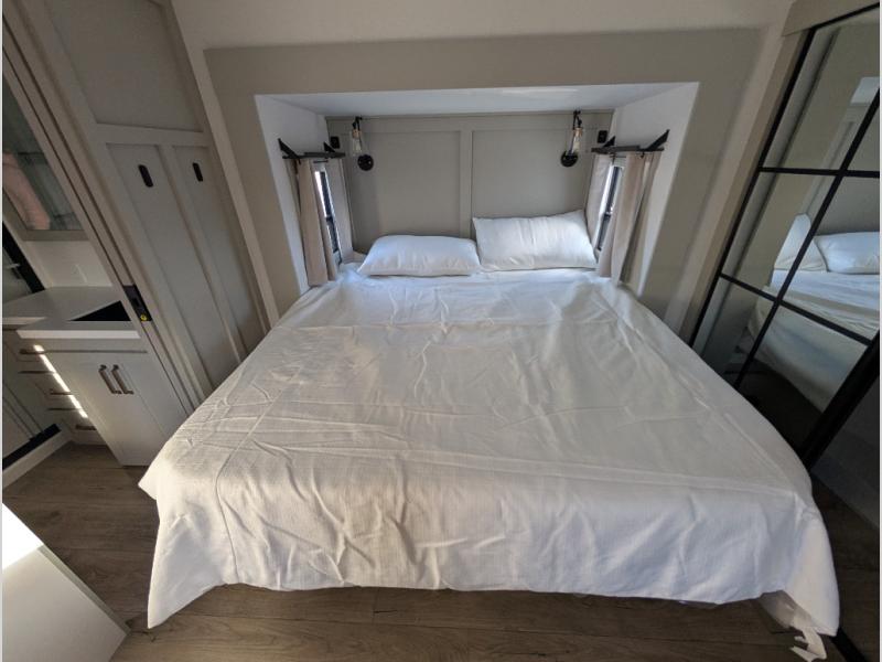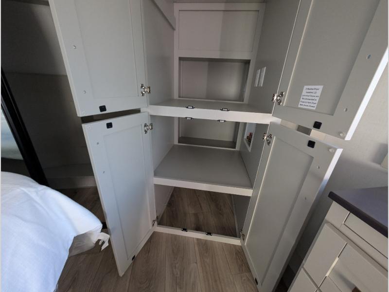 Escape to a world of comfort and luxury with this incredible fifth wheel! The living area features a plush L-sofa, five recliners, and a warm fireplace. The versatile dining table/L desk seats up to four people, making it perfect for meals, work, or play. Ample shoe storage and a convenient spot for pet bowls enhance comfort and practicality. The kitchen offers stunning solid surface countertops, dishwasher prep, a residential microwave, and a three-burner cooktop. The expansive pantry with pull-out drawers provides ample storage for your favorite ingredients and cooking essentials. The full bathroom is a serene oasis, featuring a linen closet for added storage and convenience. The front bedroom is a peaceful sanctuary, featuring a spacious king bed, shelves, and a sliding dresser top with hidden storage. The generous wardrobe and shoe rack provide ample storage for your clothes and shoes.