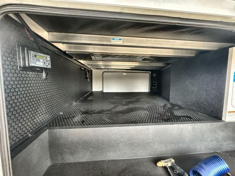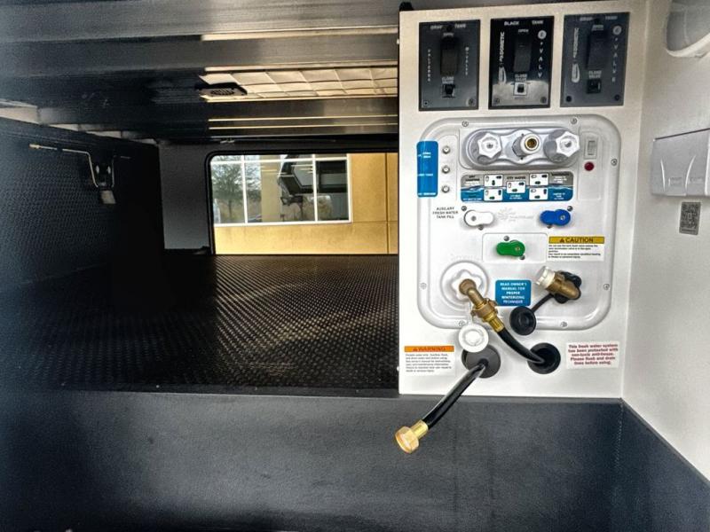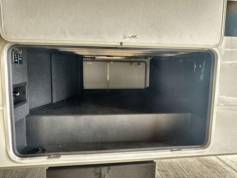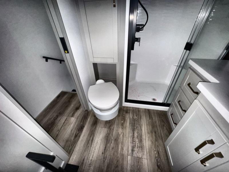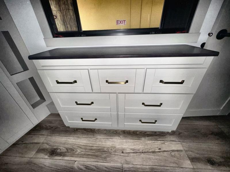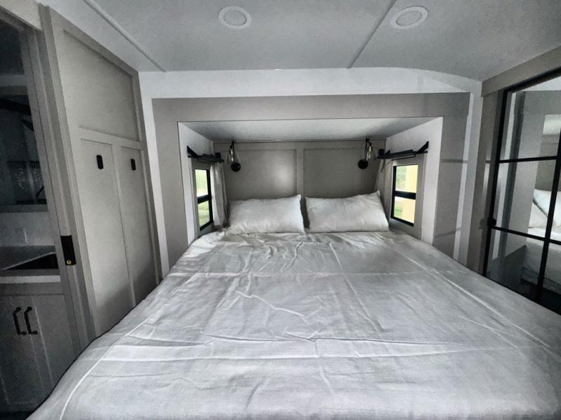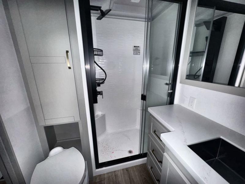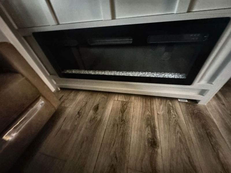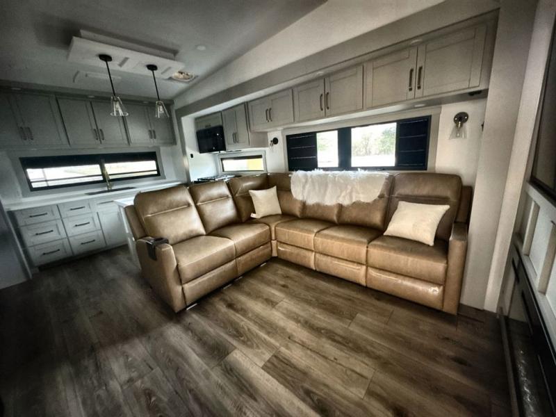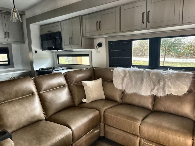 Escape to a world of comfort and luxury with this incredible fifth wheel! The living area features a plush L-sofa, five recliners, and a warm fireplace. The versatile dining table/L desk seats up to four people, making it perfect for meals, work, or play. Ample shoe storage and a convenient spot for pet bowls enhance comfort and practicality. The kitchen offers stunning solid surface countertops, dishwasher prep, a residential microwave, and a three-burner cooktop. The expansive pantry with pull-out drawers provides ample storage for your favorite ingredients and cooking essentials. The full bathroom is a serene oasis, featuring a linen closet for added storage and convenience. The front bedroom is a peaceful sanctuary, featuring a spacious king bed, shelves, and a sliding dresser top with hidden storage. The generous wardrobe and shoe rack provide ample storage for your clothes and shoes.