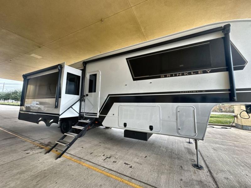 The Brinkley mid-profile Model Z fifth wheels bring you clean lines and an upscale look with plenty of style and exciting new features like the industry first brass plumbing connections. These units also feature an automotive grade front cap, plenty of exterior storage, exterior hot and cold showers, and wide stance leveling jacks for easy set up. Residential frameless windows provide a clean look and beautiful views, and ample electrical outlets and 6 USB/USB-C outlets allow all of your electronics and appliances to easily be used and charged.