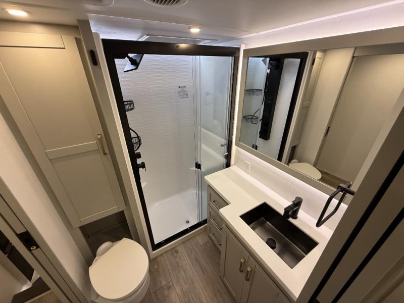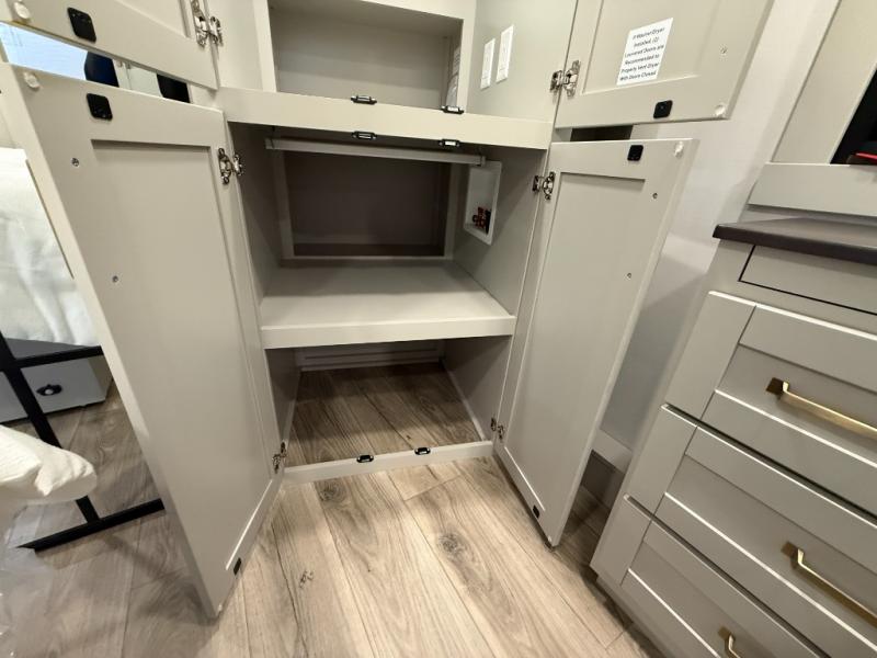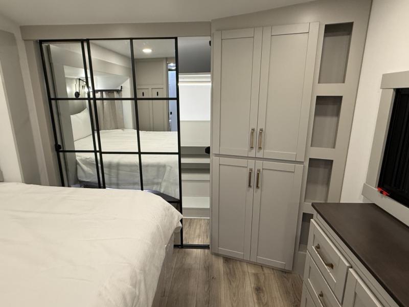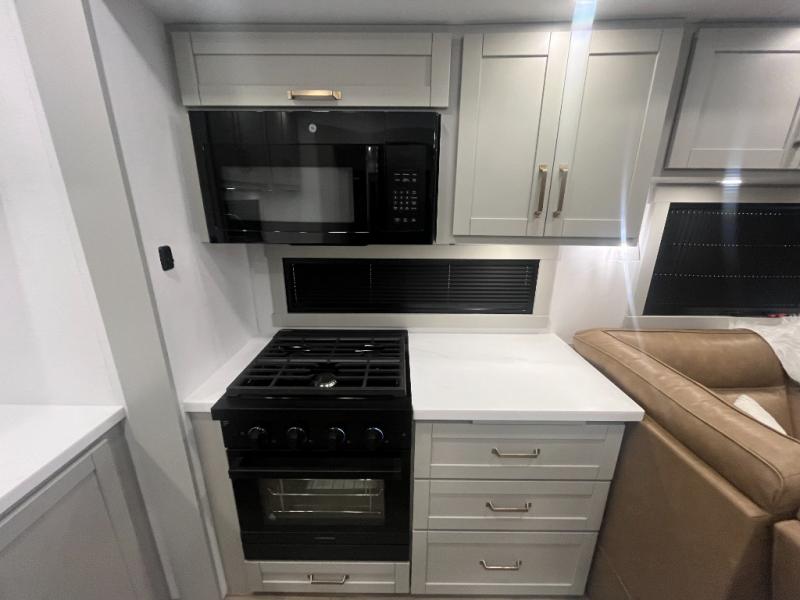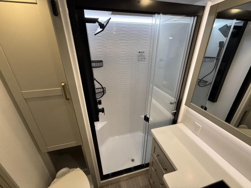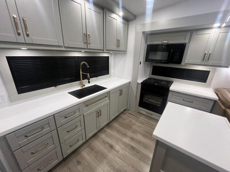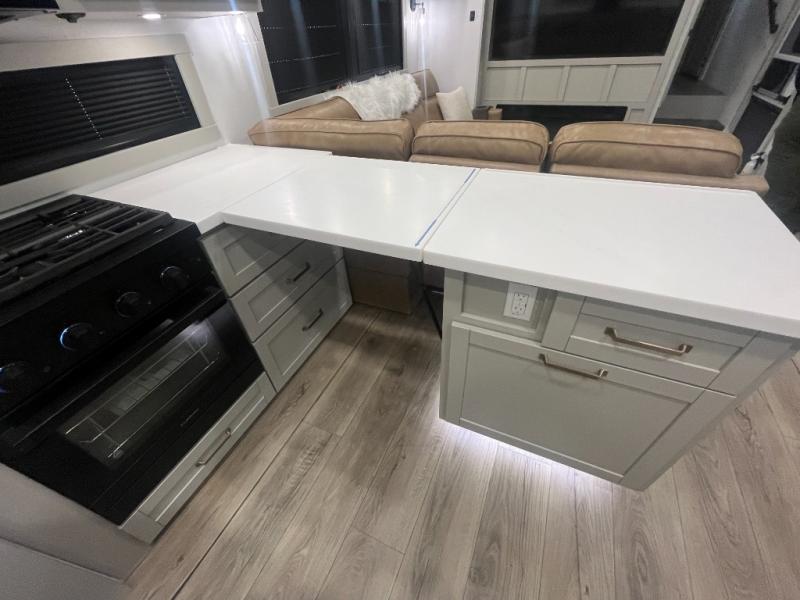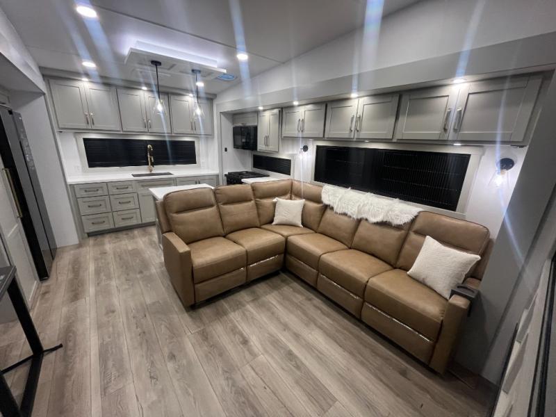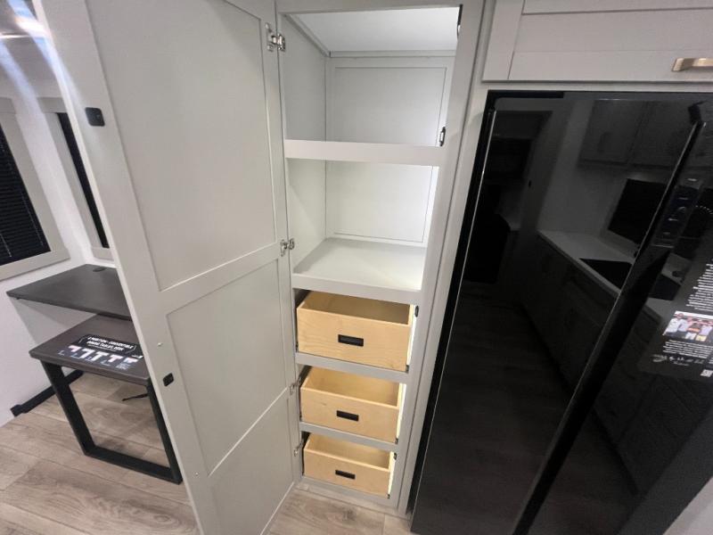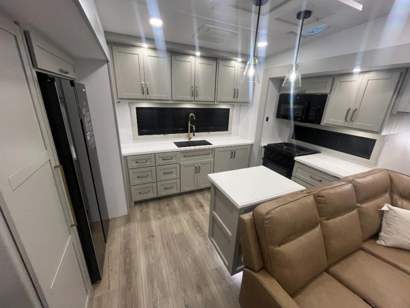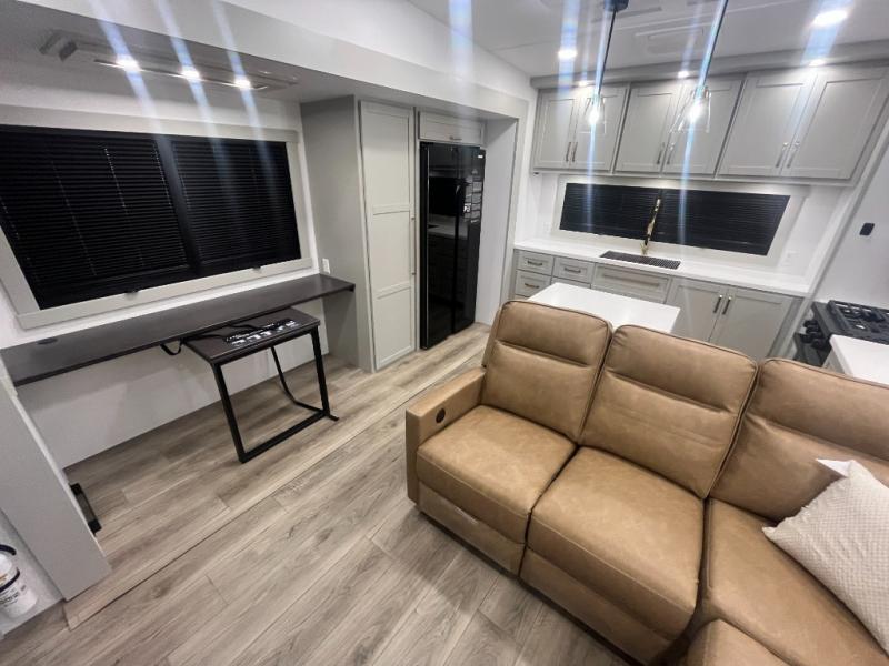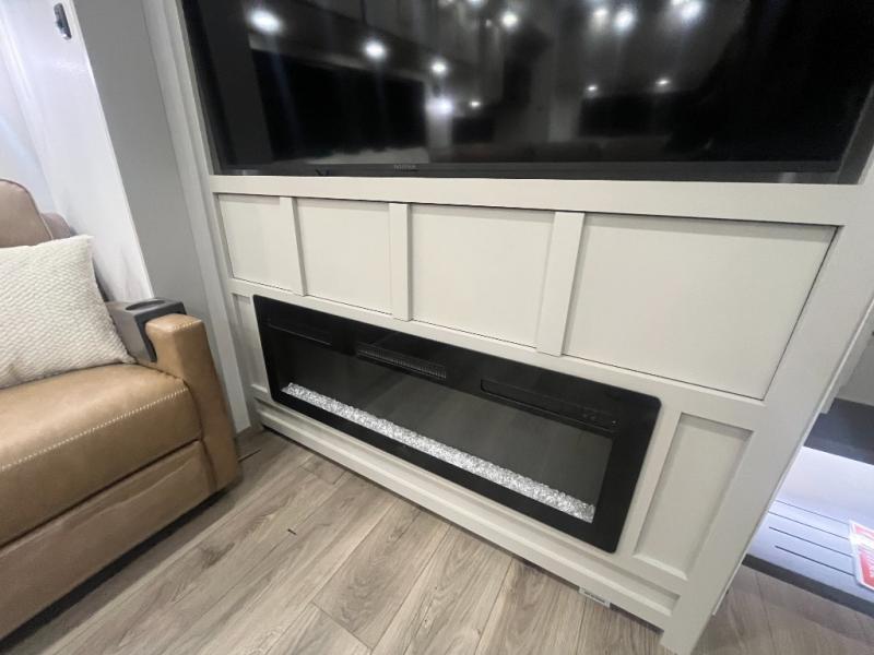 Escape to a world of comfort and luxury with this incredible fifth wheel! The living area features a plush L-sofa, five recliners, and a warm fireplace. The versatile dining table/L desk seats up to four people, making it perfect for meals, work, or play. Ample shoe storage and a convenient spot for pet bowls enhance comfort and practicality. The kitchen offers stunning solid surface countertops, dishwasher prep, a residential microwave, and a three-burner cooktop. The expansive pantry with pull-out drawers provides ample storage for your favorite ingredients and cooking essentials. The full bathroom is a serene oasis, featuring a linen closet for added storage and convenience. The front bedroom is a peaceful sanctuary, featuring a spacious king bed, shelves, and a sliding dresser top with hidden storage. The generous wardrobe and shoe rack provide ample storage for your clothes and shoes.