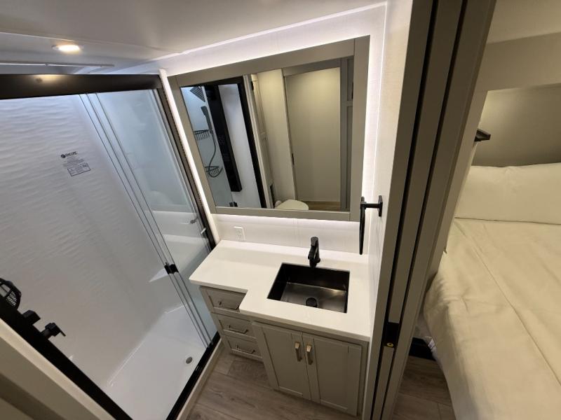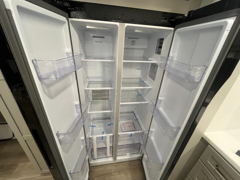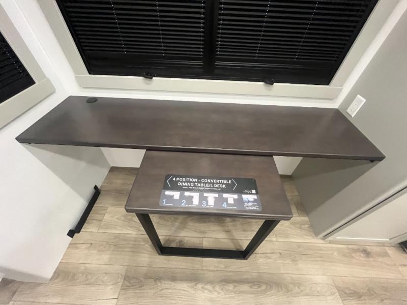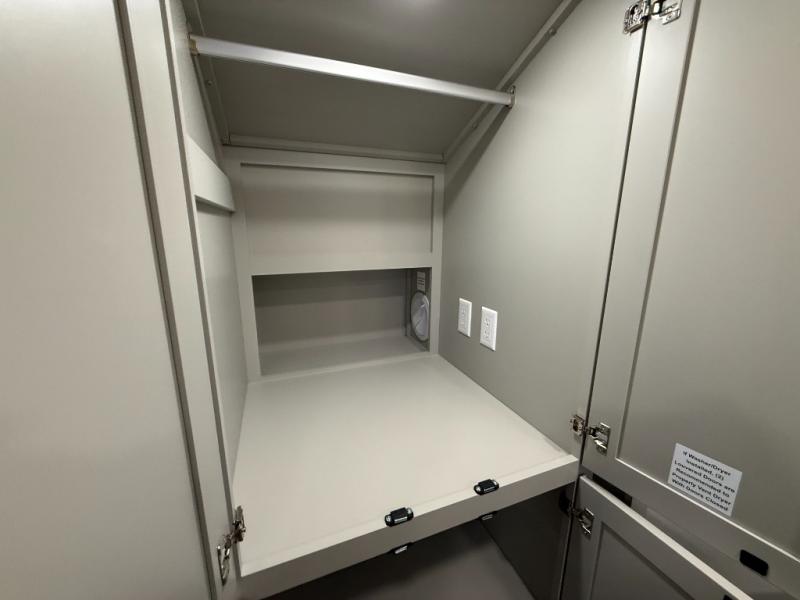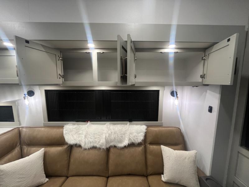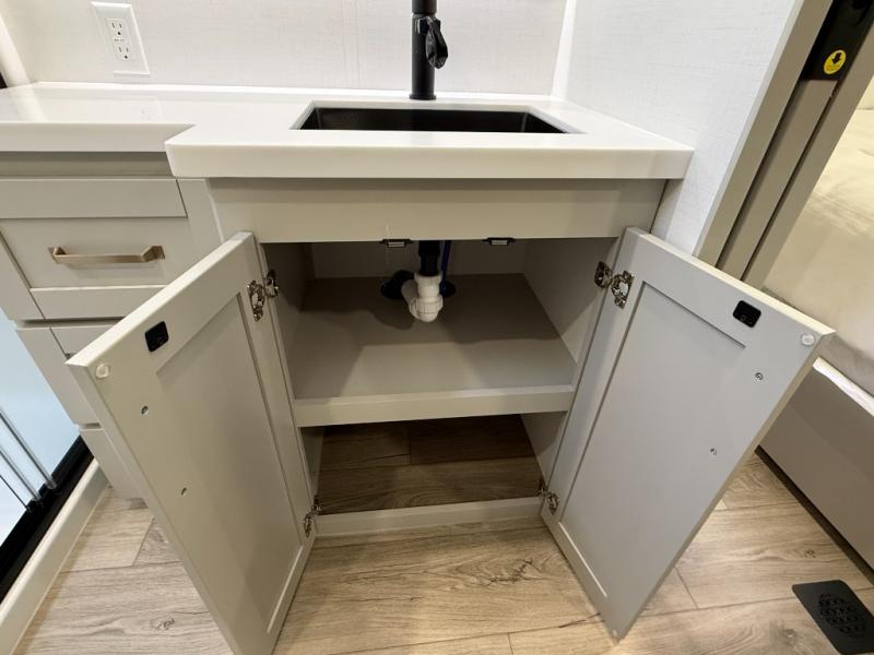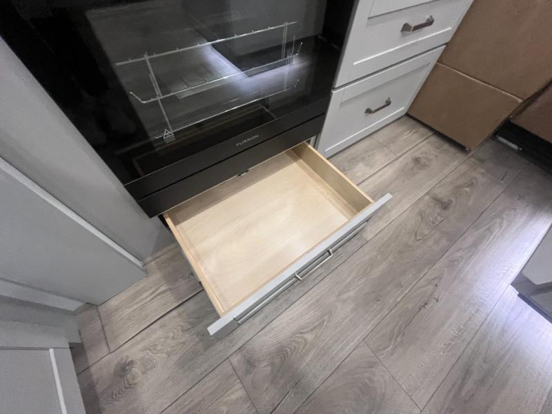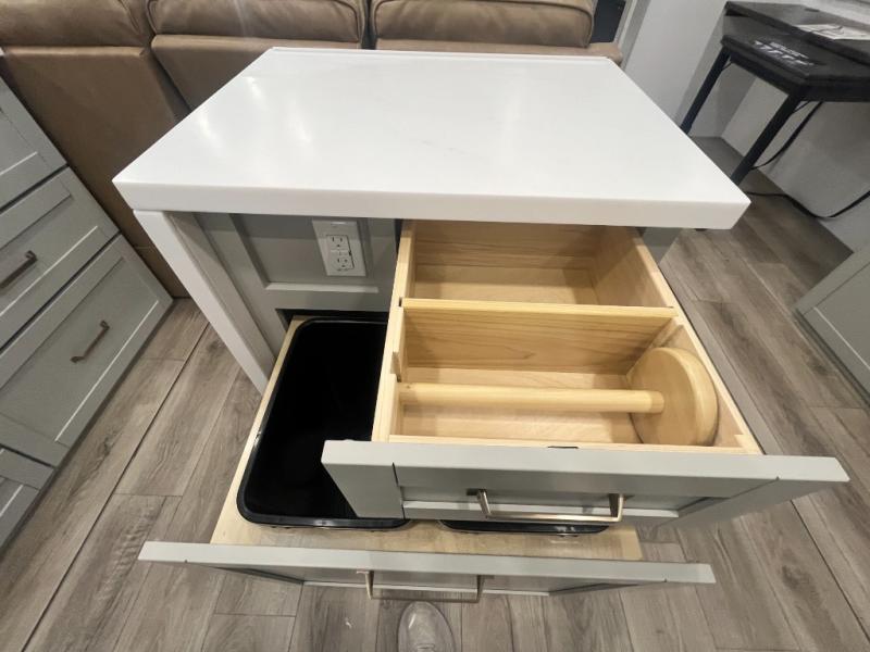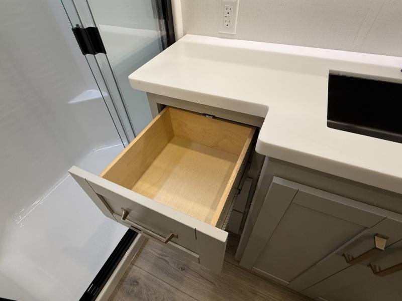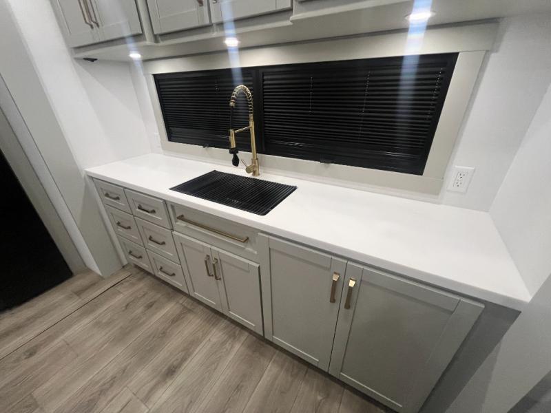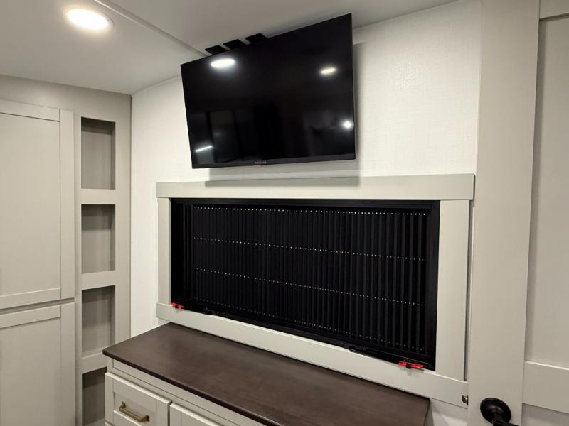 Escape to a world of comfort and luxury with this incredible fifth wheel! The living area features a plush L-sofa, five recliners, and a warm fireplace. The versatile dining table/L desk seats up to four people, making it perfect for meals, work, or play. Ample shoe storage and a convenient spot for pet bowls enhance comfort and practicality. The kitchen offers stunning solid surface countertops, dishwasher prep, a residential microwave, and a three-burner cooktop. The expansive pantry with pull-out drawers provides ample storage for your favorite ingredients and cooking essentials. The full bathroom is a serene oasis, featuring a linen closet for added storage and convenience. The front bedroom is a peaceful sanctuary, featuring a spacious king bed, shelves, and a sliding dresser top with hidden storage. The generous wardrobe and shoe rack provide ample storage for your clothes and shoes.