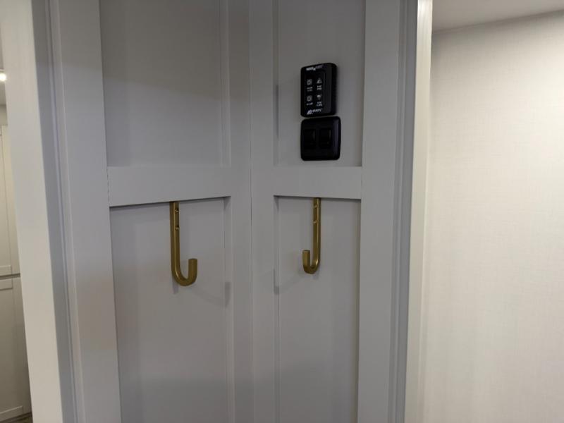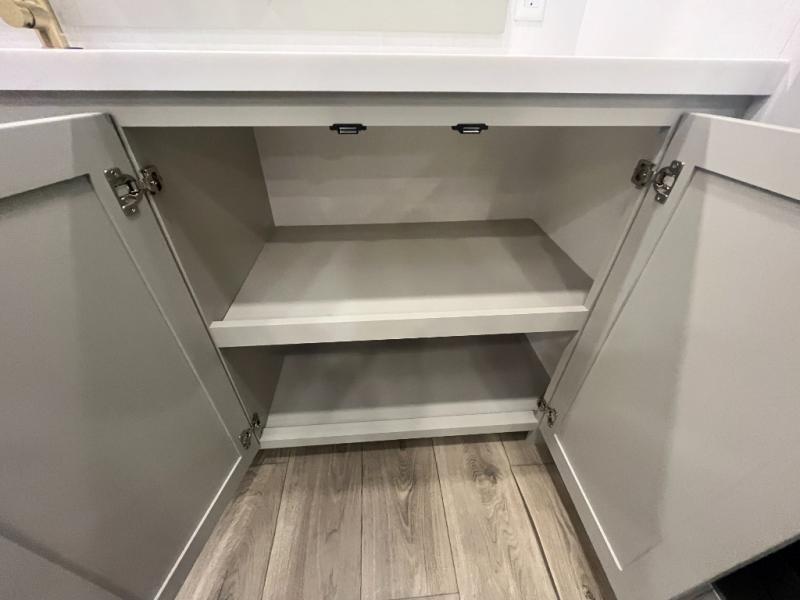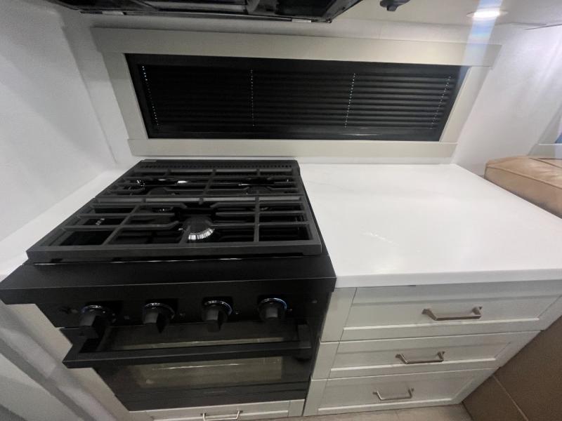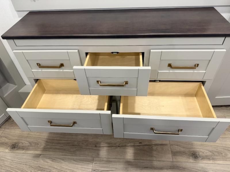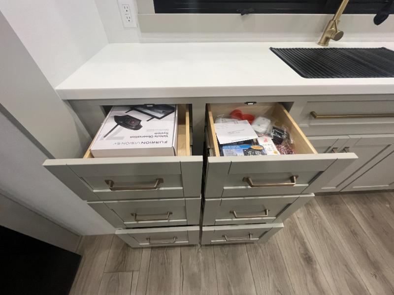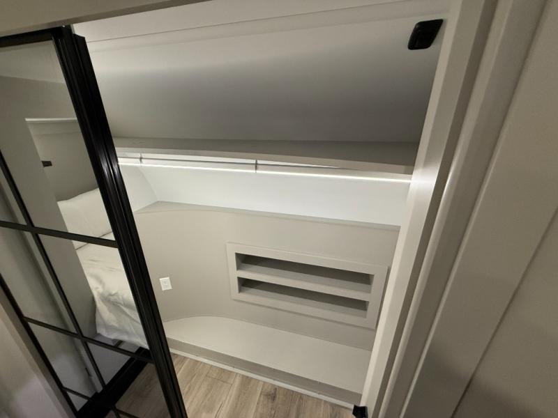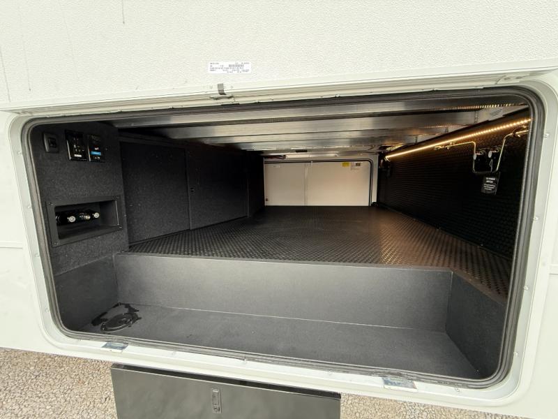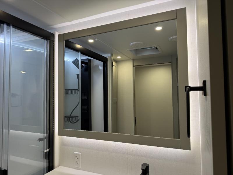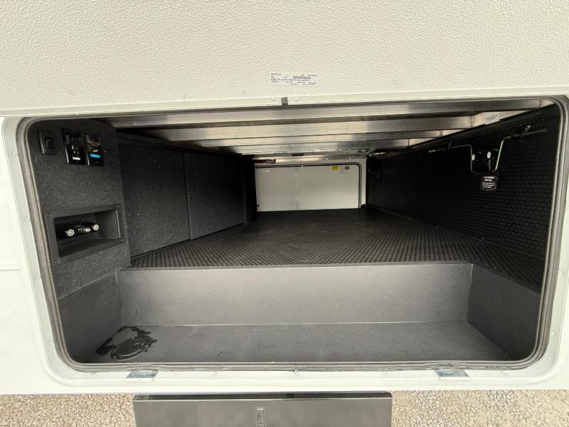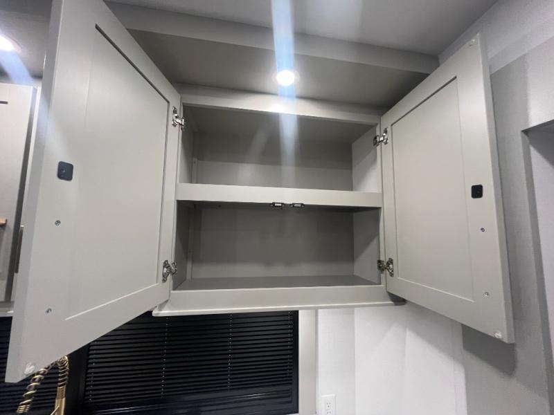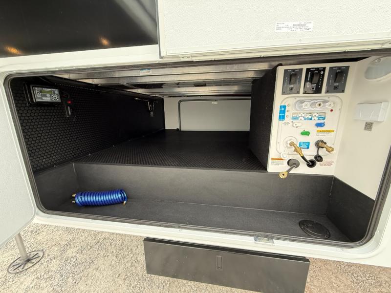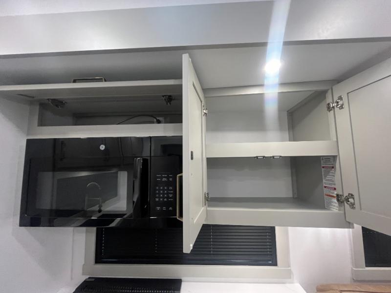 Escape to a world of comfort and luxury with this incredible fifth wheel! The living area features a plush L-sofa, five recliners, and a warm fireplace. The versatile dining table/L desk seats up to four people, making it perfect for meals, work, or play. Ample shoe storage and a convenient spot for pet bowls enhance comfort and practicality. The kitchen offers stunning solid surface countertops, dishwasher prep, a residential microwave, and a three-burner cooktop. The expansive pantry with pull-out drawers provides ample storage for your favorite ingredients and cooking essentials. The full bathroom is a serene oasis, featuring a linen closet for added storage and convenience. The front bedroom is a peaceful sanctuary, featuring a spacious king bed, shelves, and a sliding dresser top with hidden storage. The generous wardrobe and shoe rack provide ample storage for your clothes and shoes.
