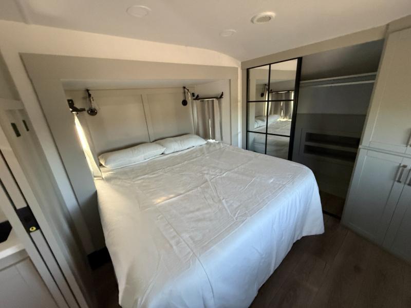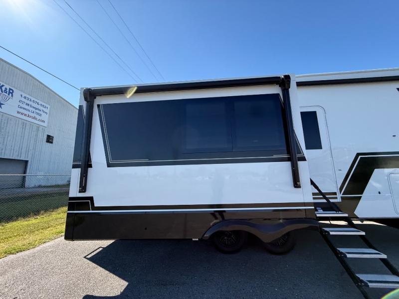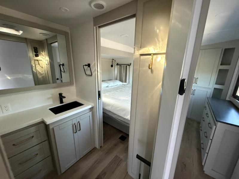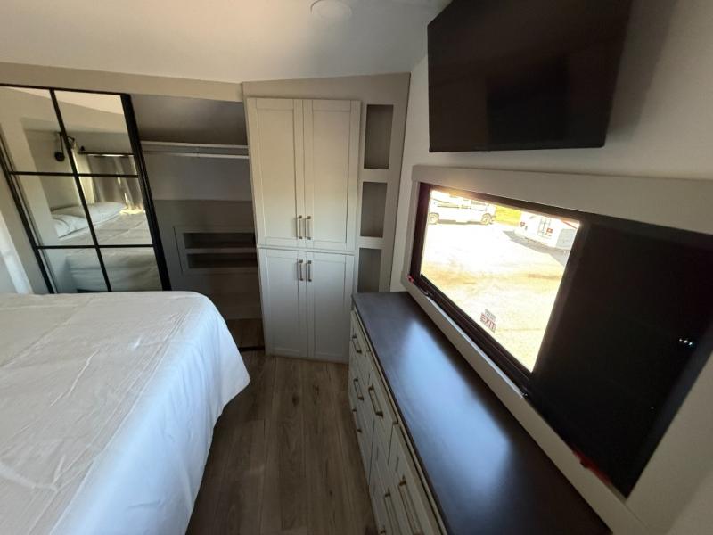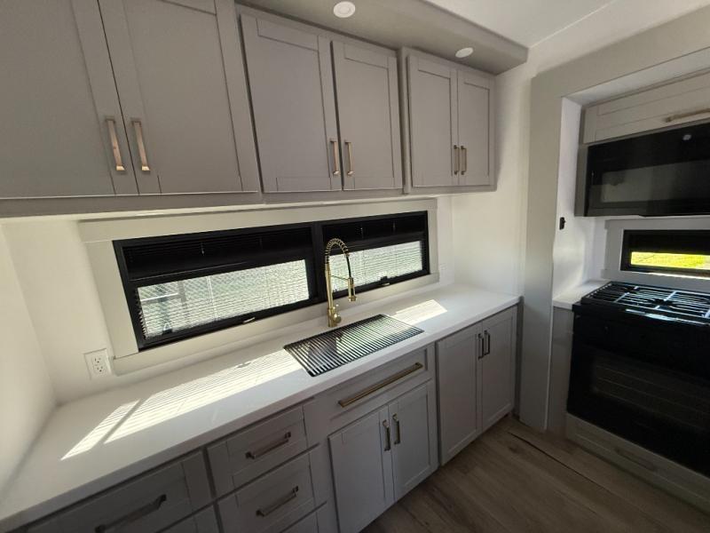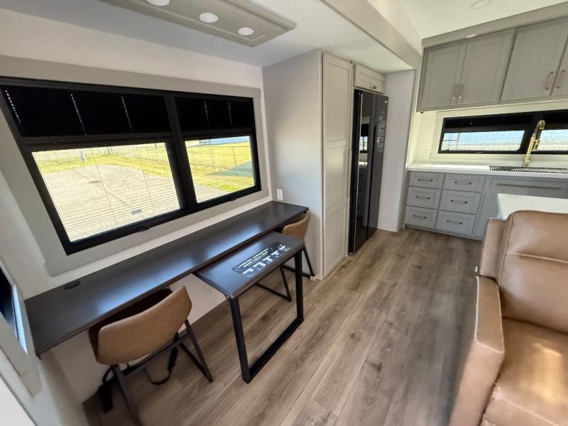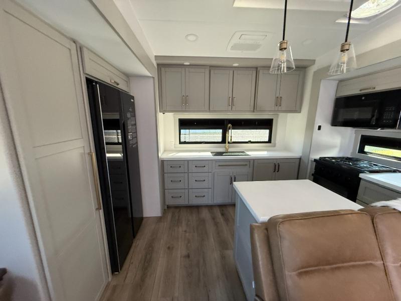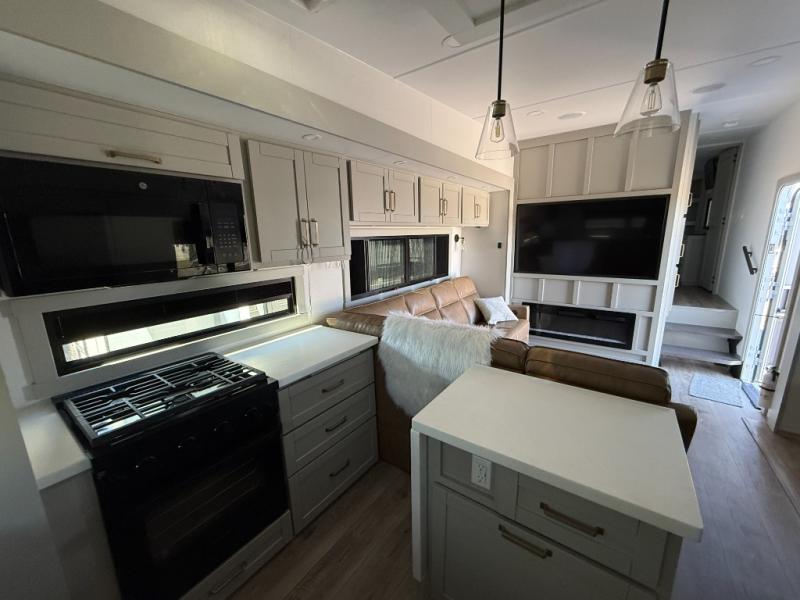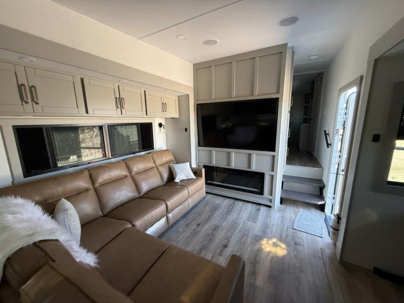 Escape to a world of comfort and luxury with this incredible fifth wheel! The living area features a plush L-sofa, five recliners, and a warm fireplace. The versatile dining table/L desk seats up to four people, making it perfect for meals, work, or play. Ample shoe storage and a convenient spot for pet bowls enhance comfort and practicality. The kitchen offers stunning solid surface countertops, dishwasher prep, a residential microwave, and a three-burner cooktop. The expansive pantry with pull-out drawers provides ample storage for your favorite ingredients and cooking essentials. The full bathroom is a serene oasis, featuring a linen closet for added storage and convenience. The front bedroom is a peaceful sanctuary, featuring a spacious king bed, shelves, and a sliding dresser top with hidden storage. The generous wardrobe and shoe rack provide ample storage for your clothes and shoes.