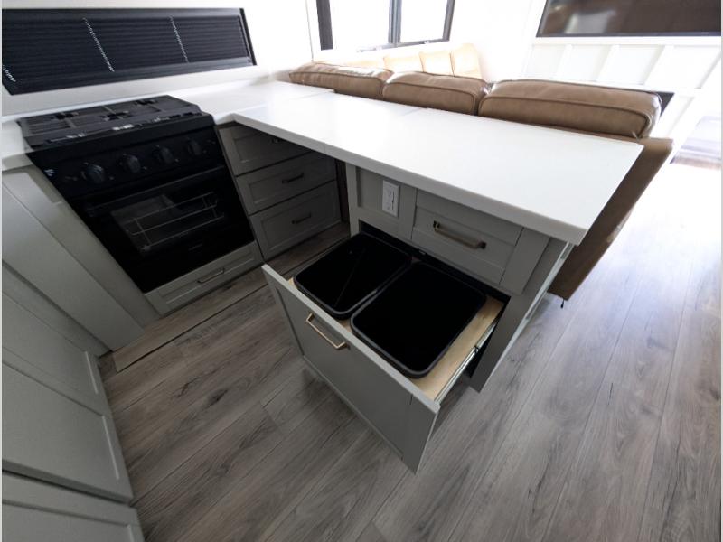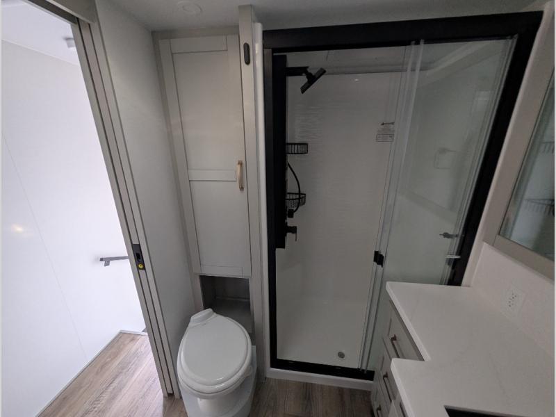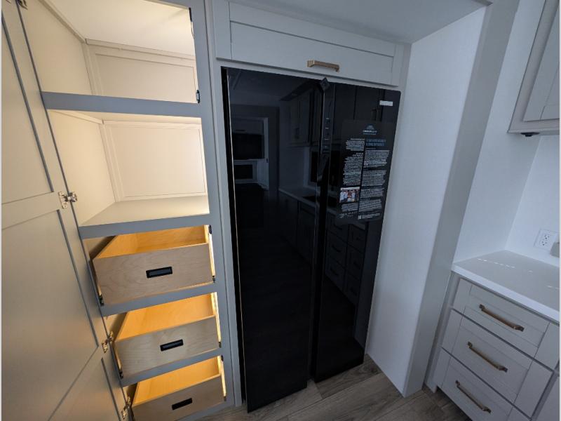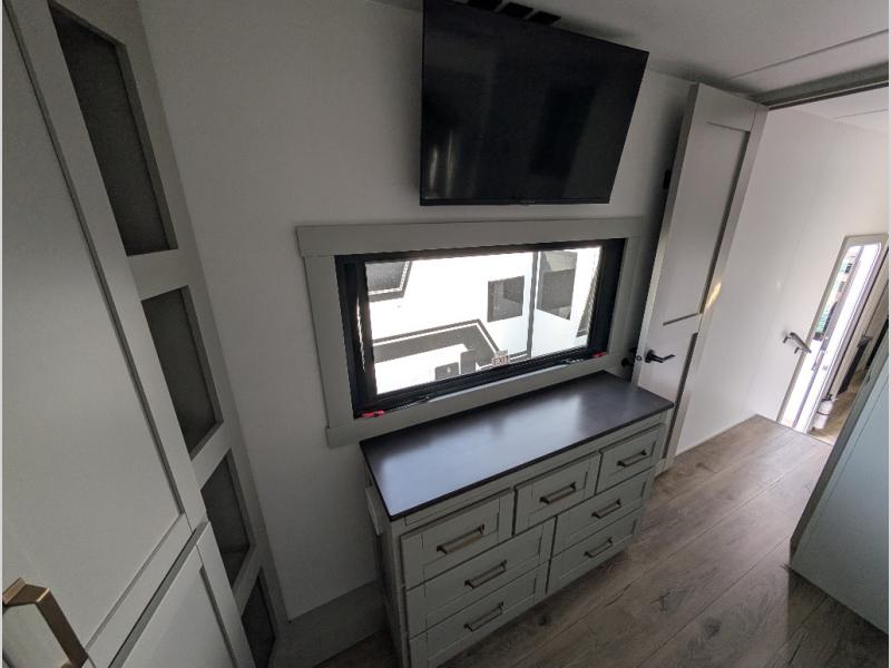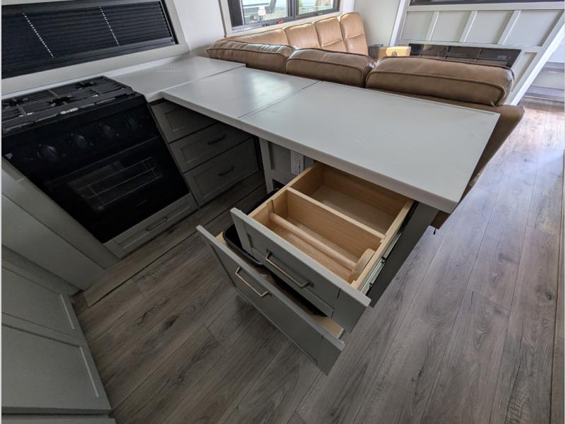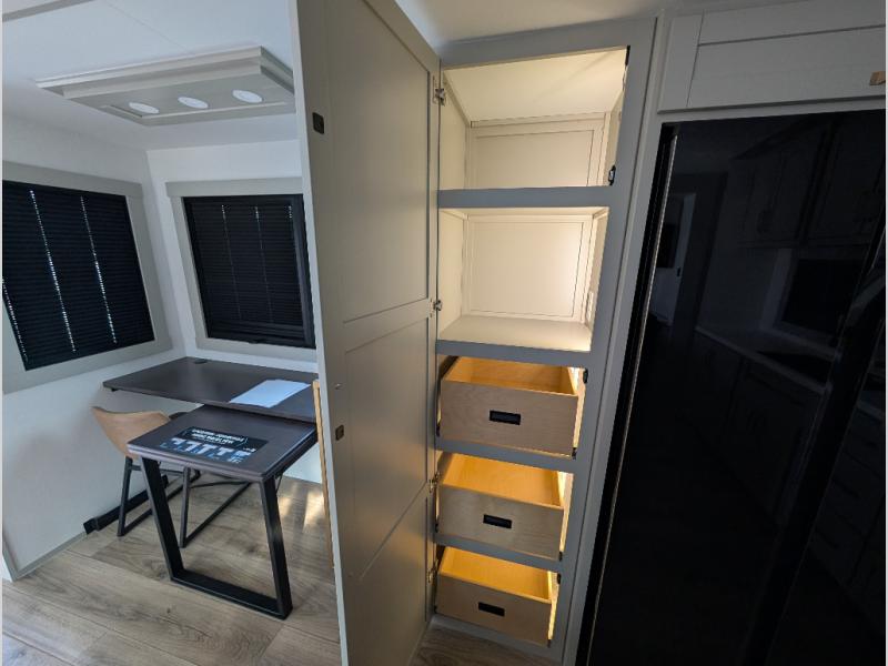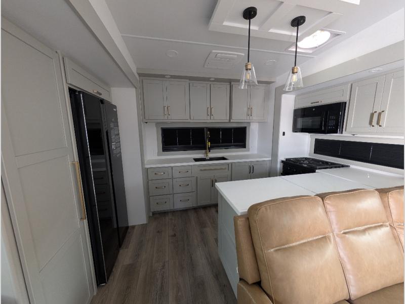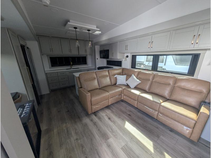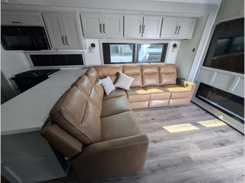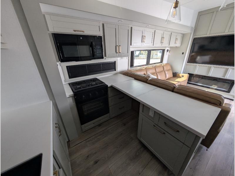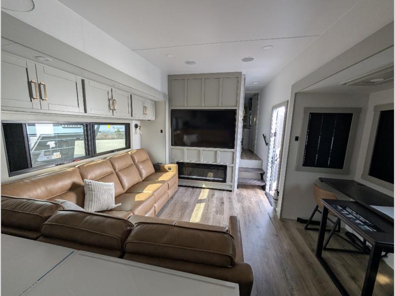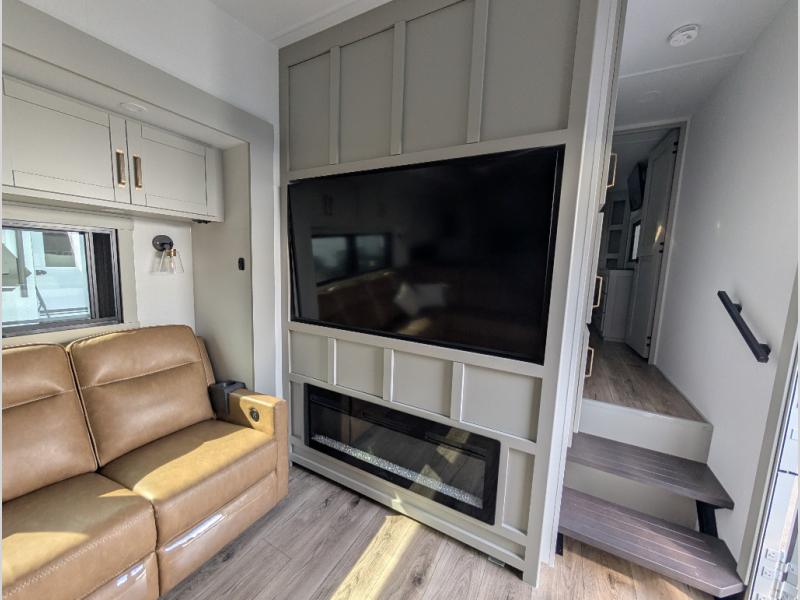 Escape to a world of comfort and luxury with this incredible fifth wheel! The living area features a plush L-sofa, five recliners, and a warm fireplace. The versatile dining table/L desk seats up to four people, making it perfect for meals, work, or play. Ample shoe storage and a convenient spot for pet bowls enhance comfort and practicality. The kitchen offers stunning solid surface countertops, dishwasher prep, a residential microwave, and a three-burner cooktop. The expansive pantry with pull-out drawers provides ample storage for your favorite ingredients and cooking essentials. The full bathroom is a serene oasis, featuring a linen closet for added storage and convenience. The front bedroom is a peaceful sanctuary, featuring a spacious king bed, shelves, and a sliding dresser top with hidden storage. The generous wardrobe and shoe rack provide ample storage for your clothes and shoes.