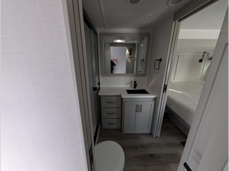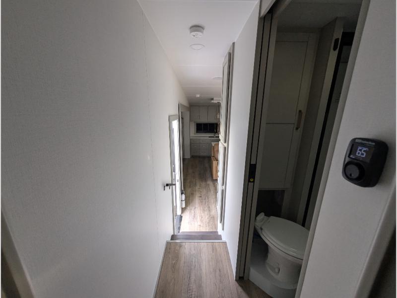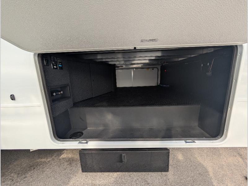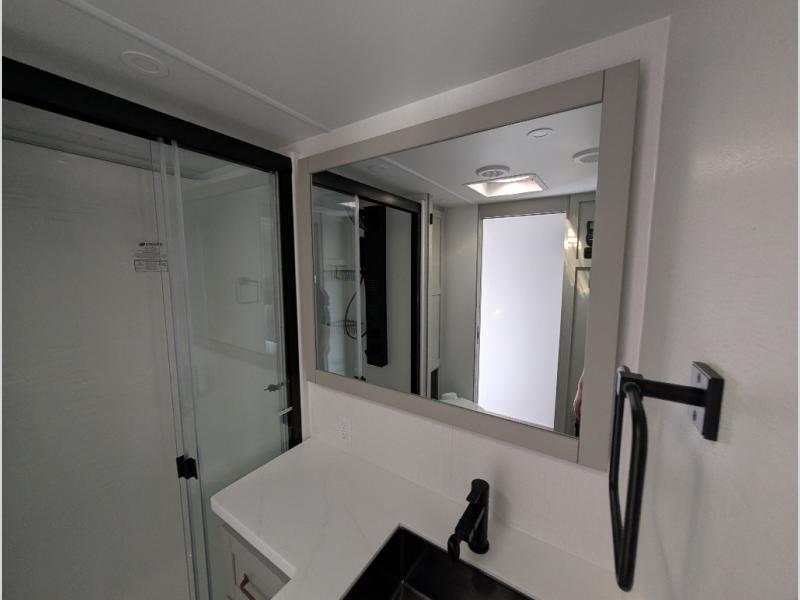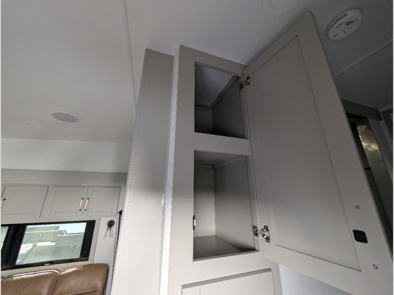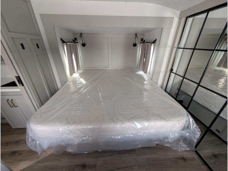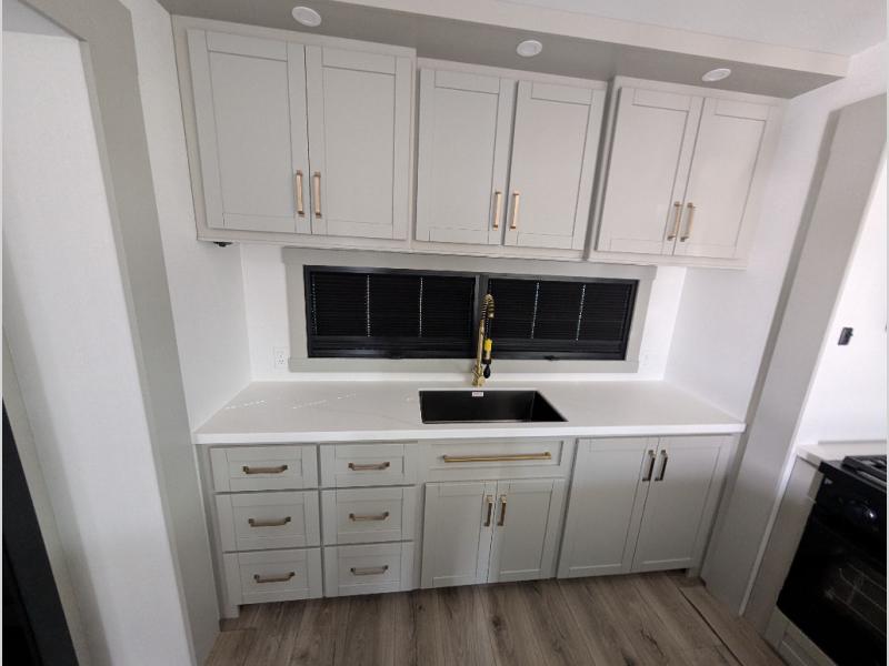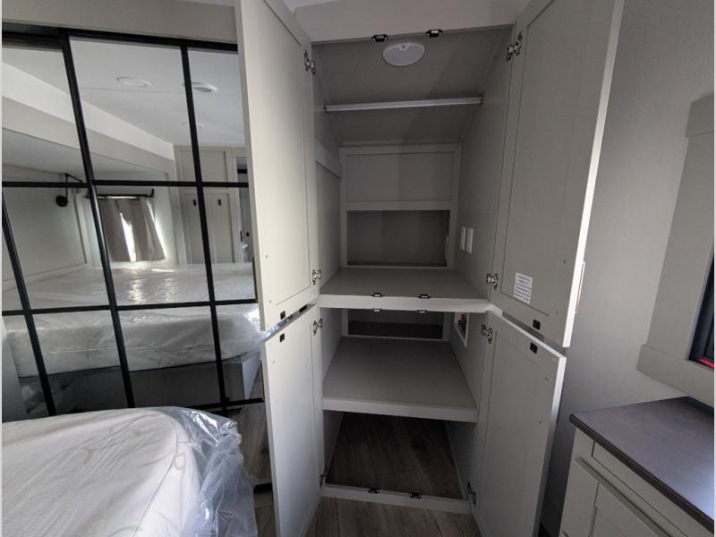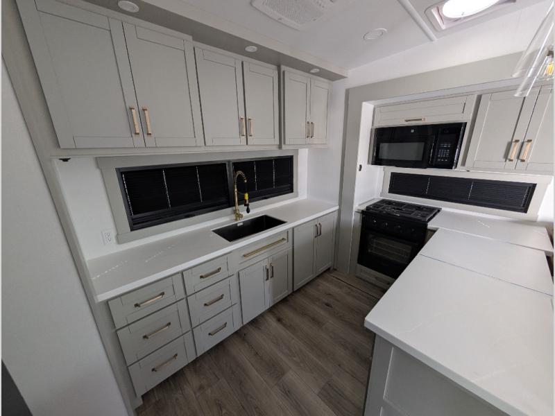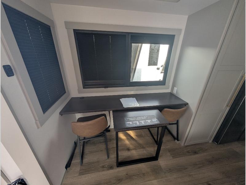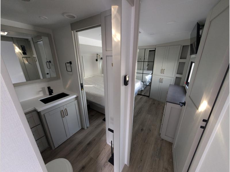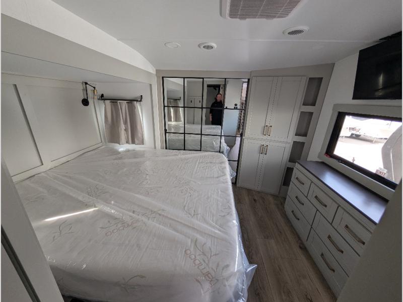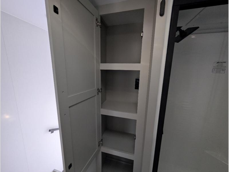 Escape to a world of comfort and luxury with this incredible fifth wheel! The living area features a plush L-sofa, five recliners, and a warm fireplace. The versatile dining table/L desk seats up to four people, making it perfect for meals, work, or play. Ample shoe storage and a convenient spot for pet bowls enhance comfort and practicality. The kitchen offers stunning solid surface countertops, dishwasher prep, a residential microwave, and a three-burner cooktop. The expansive pantry with pull-out drawers provides ample storage for your favorite ingredients and cooking essentials. The full bathroom is a serene oasis, featuring a linen closet for added storage and convenience. The front bedroom is a peaceful sanctuary, featuring a spacious king bed, shelves, and a sliding dresser top with hidden storage. The generous wardrobe and shoe rack provide ample storage for your clothes and shoes.