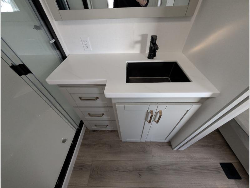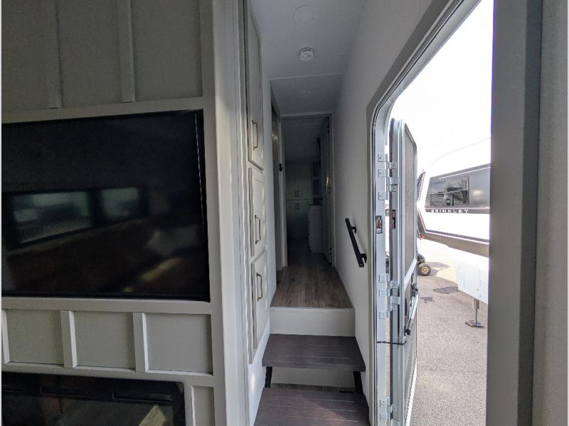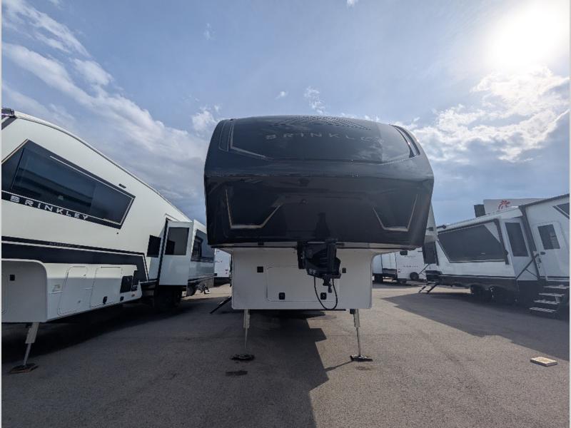 The Brinkley mid-profile Model Z fifth wheels bring you clean lines and an upscale look with plenty of style and exciting new features like the industry first brass plumbing connections. These units also feature an automotive grade front cap, plenty of exterior storage, exterior hot and cold showers, and wide stance leveling jacks for easy set up. Residential frameless windows provide a clean look and beautiful views, and ample electrical outlets and 6 USB/USB-C outlets allow all of your electronics and appliances to easily be used and charged.